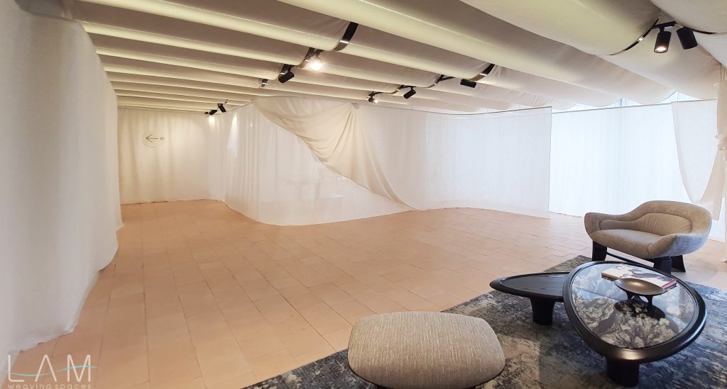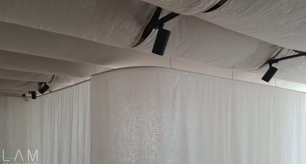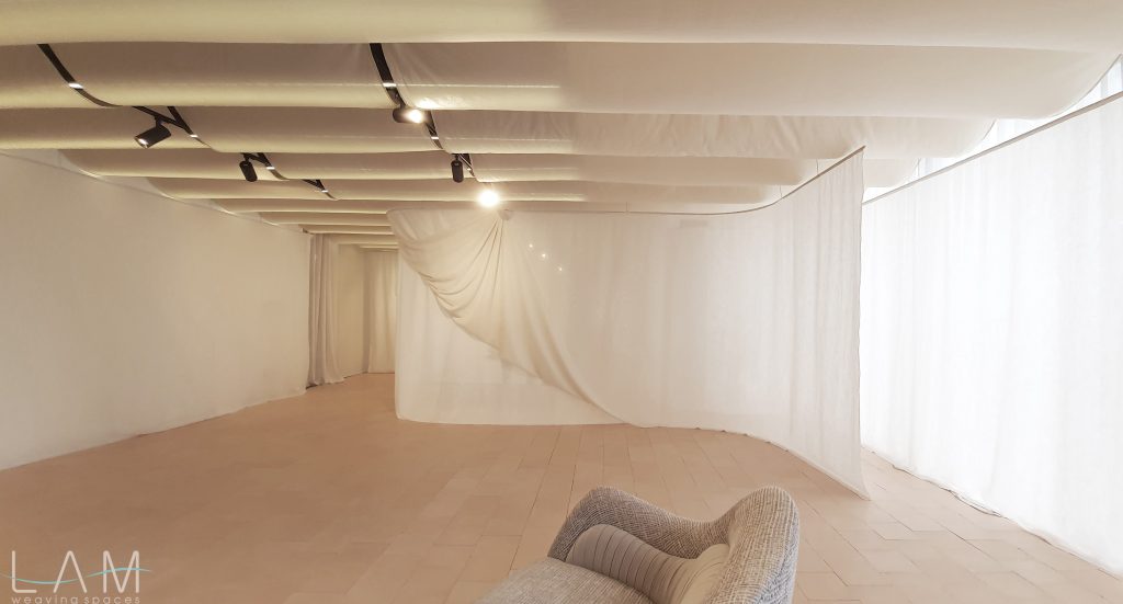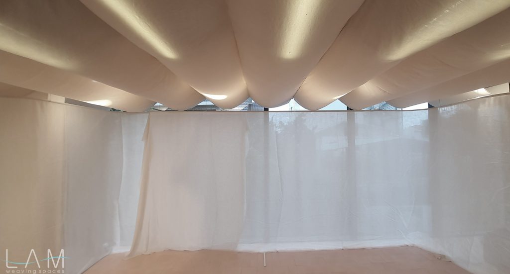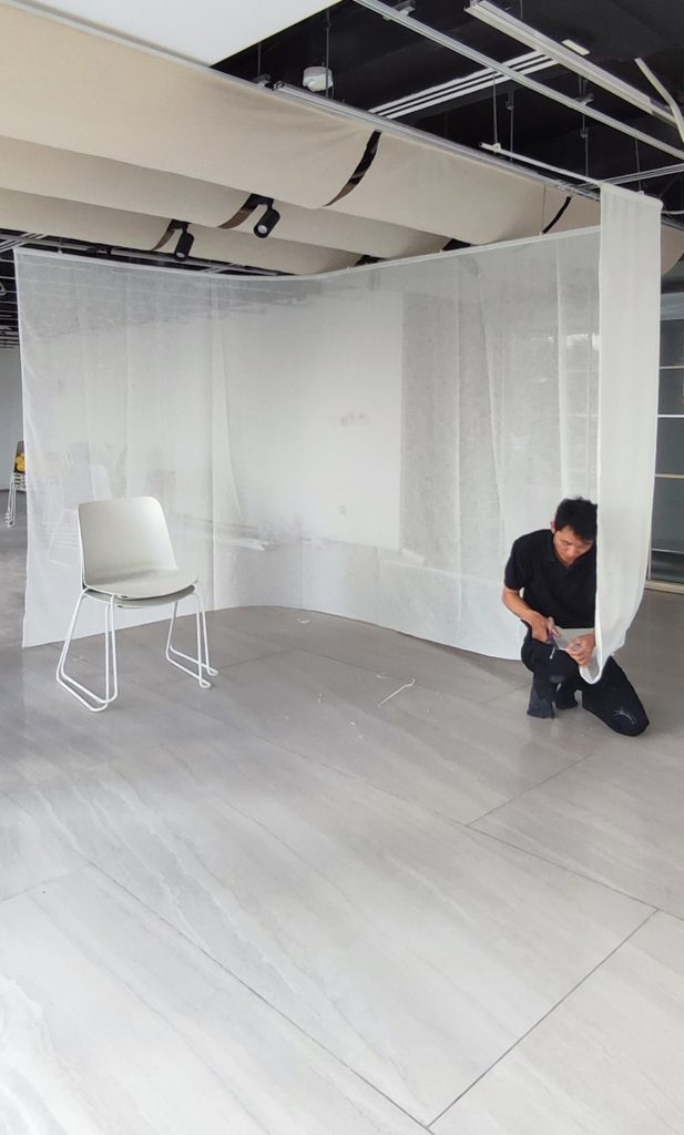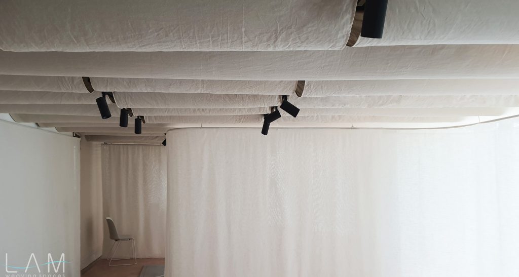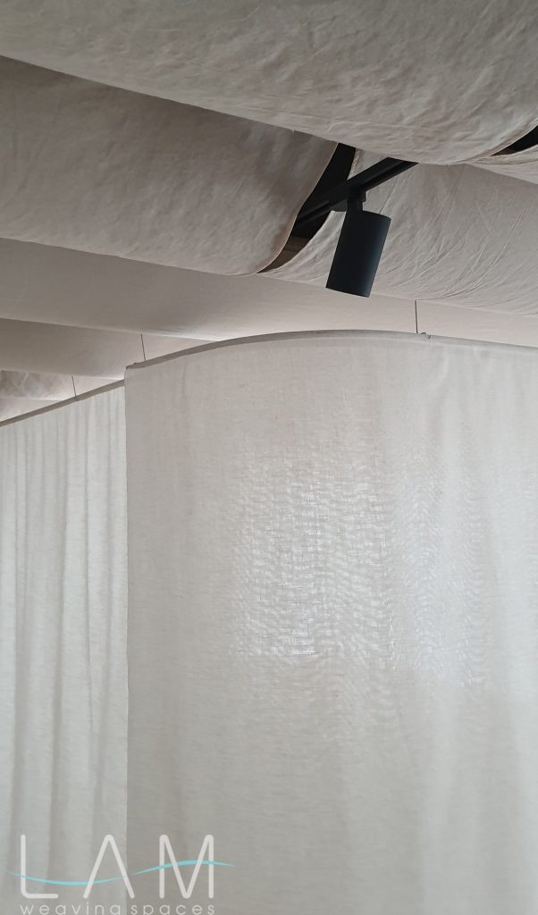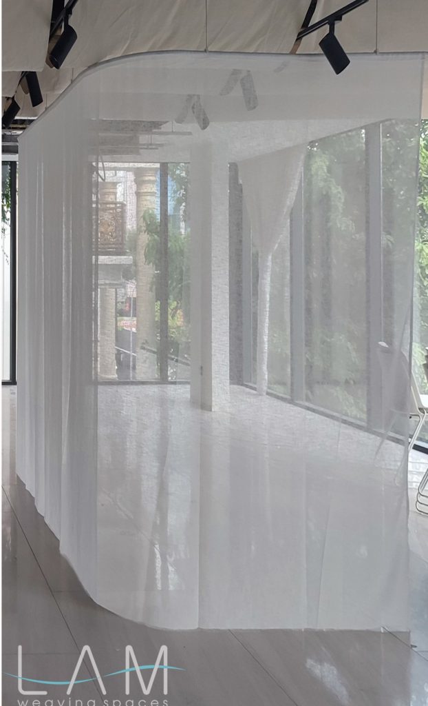 Một thiết kế độc đáo kết hợp giữa rèm trần và rèm ngăn di động, tạo nên không gian linh hoạt và tinh tế. Rèm trần được bố trí với các lớp vải cong mịn màng, tạo hiệu ứng mềm mại và âm học tốt, giúp không gian trở nên nhẹ nhàng và êm dịu. Rèm ngăn di động được làm từ chất liệu vải tự nhiên, có tính chất thoáng mát và nhẹ, có thể dễ dàng di chuyển để thay đổi không gian khi cần thiết. Thiết kế đơn giản nhưng hiệu quả, kết hợp với hệ thống thanh treo linh hoạt, giúp điều chỉnh không gian mở hay đóng tùy theo nhu cầu sử dụng. Hiệu ứng xuyên sáng của rèm tạo ra sự phân chia không gian một cách tinh tế mà không làm mất đi sự thông thoáng của môi trường.