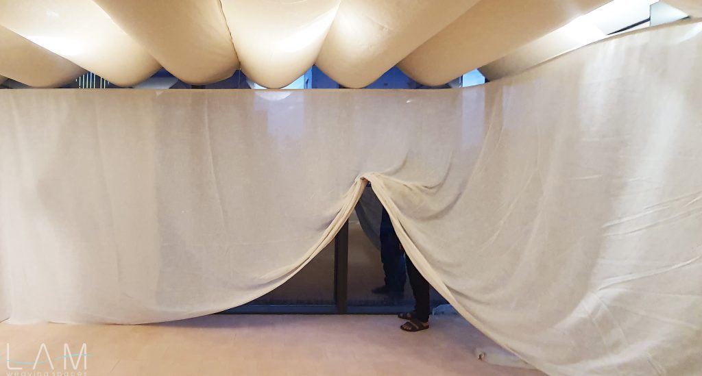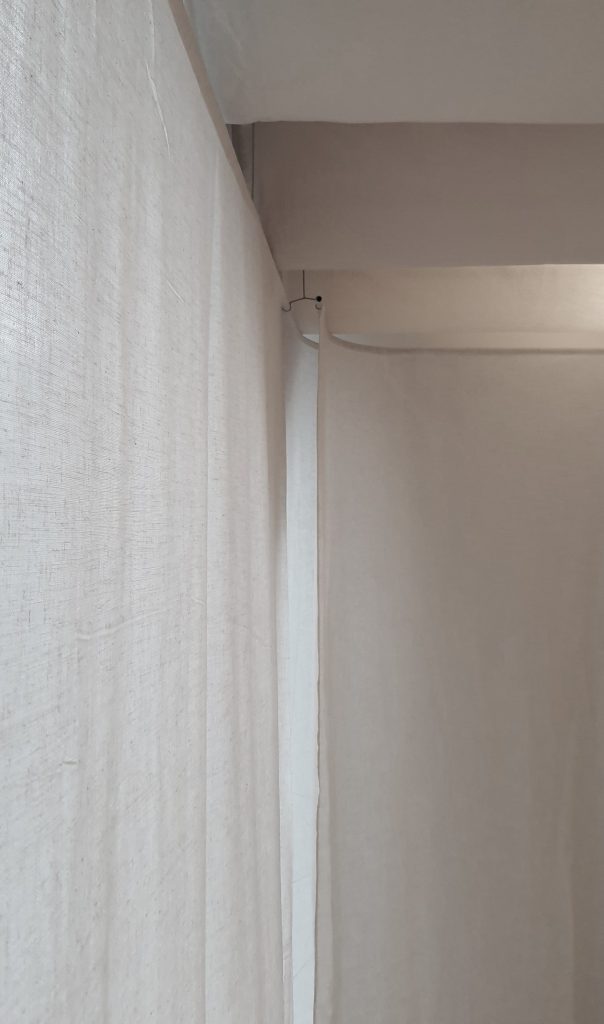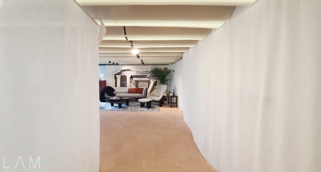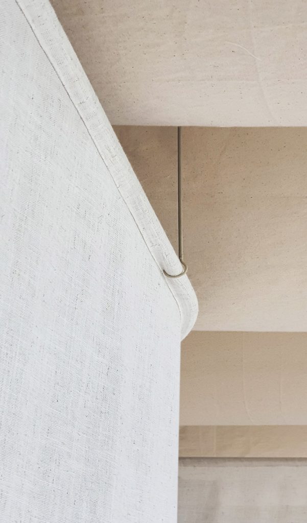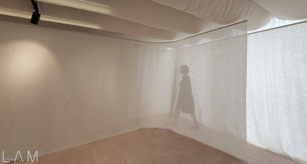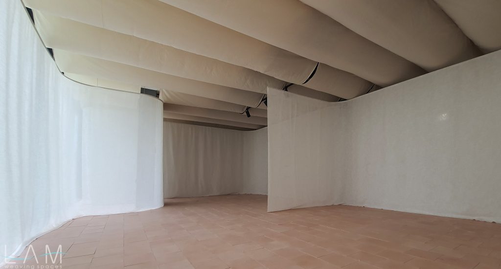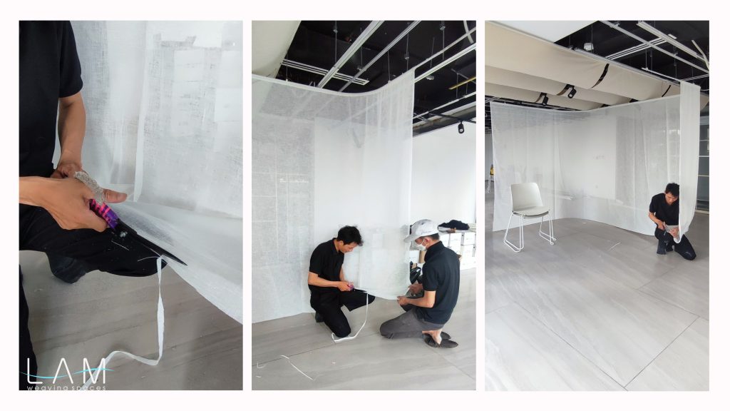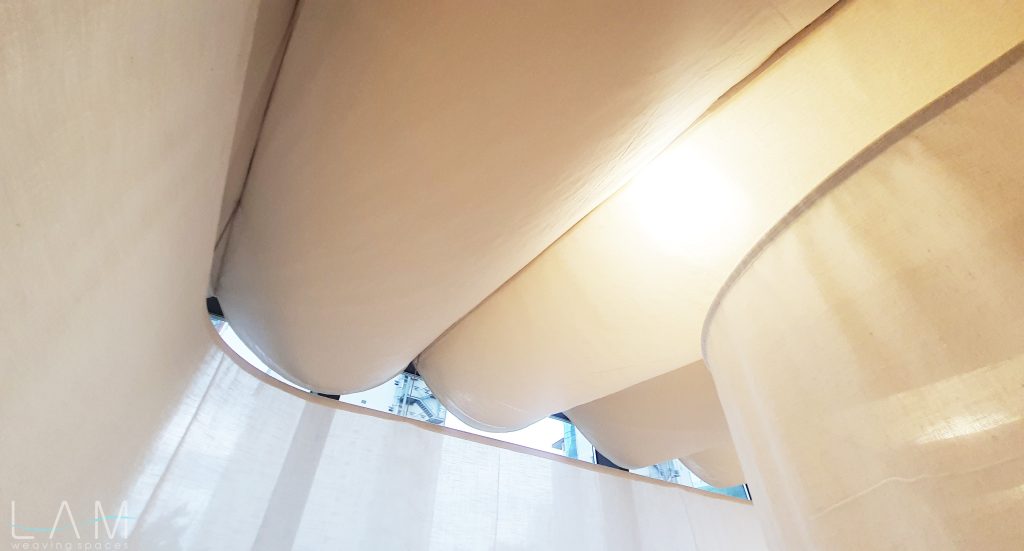 Một thiết kế độc đáo kết hợp giữa rèm trần và rèm ngăn di động, tạo nên không gian linh hoạt và tinh tế. Rèm trần được bố trí với các lớp vải cong mịn màng, tạo hiệu ứng mềm mại và âm học tốt, giúp không gian trở nên nhẹ nhàng và êm dịu. Rèm ngăn di động được làm từ chất liệu vải tự nhiên, có tính chất thoáng mát và nhẹ, có thể dễ dàng di chuyển để thay đổi không gian khi cần thiết. Thiết kế đơn giản nhưng hiệu quả, kết hợp với hệ thống thanh treo linh hoạt, giúp điều chỉnh không gian mở hay đóng tùy theo nhu cầu sử dụng. Hiệu ứng xuyên sáng của rèm tạo ra sự phân chia không gian một cách tinh tế mà không làm mất đi sự thông thoáng của môi trường.
