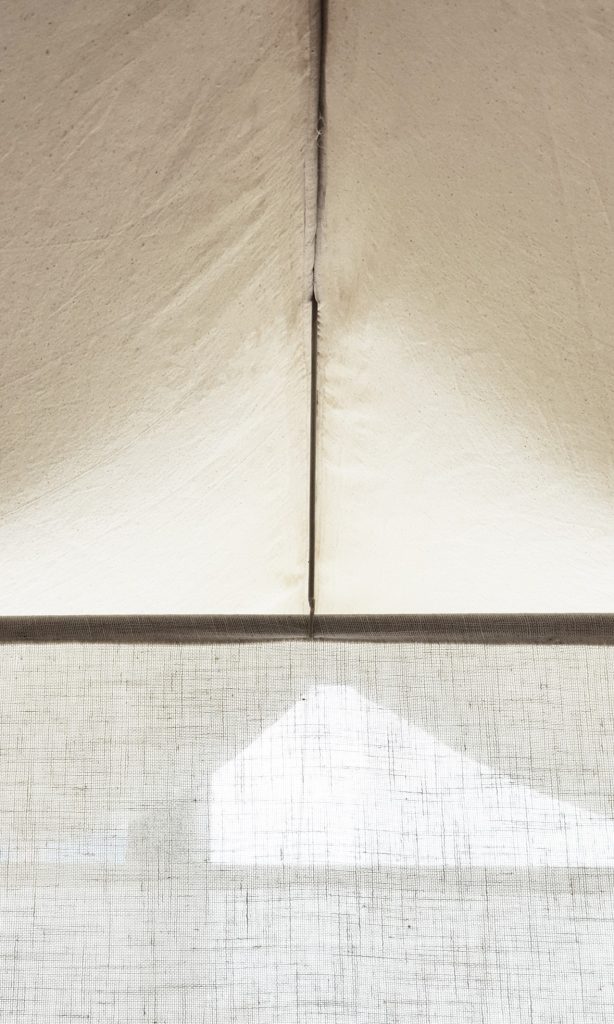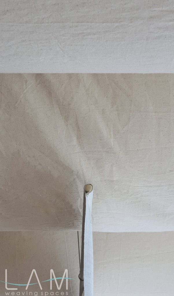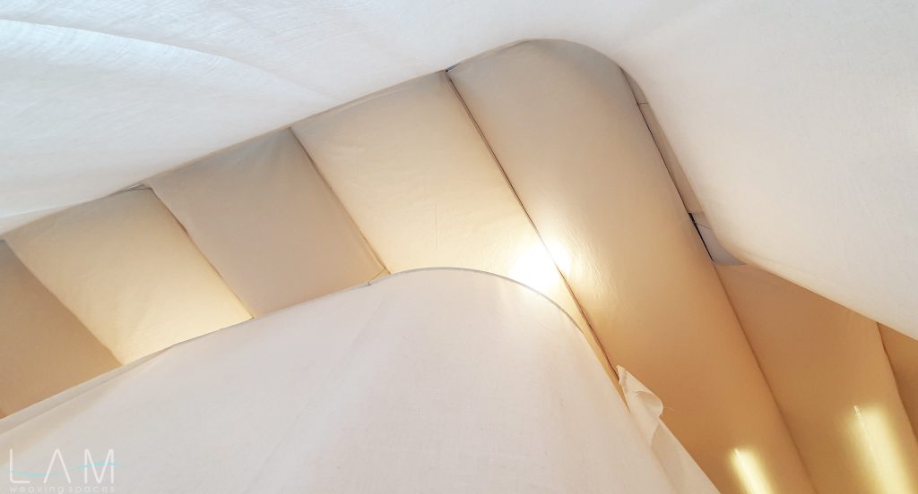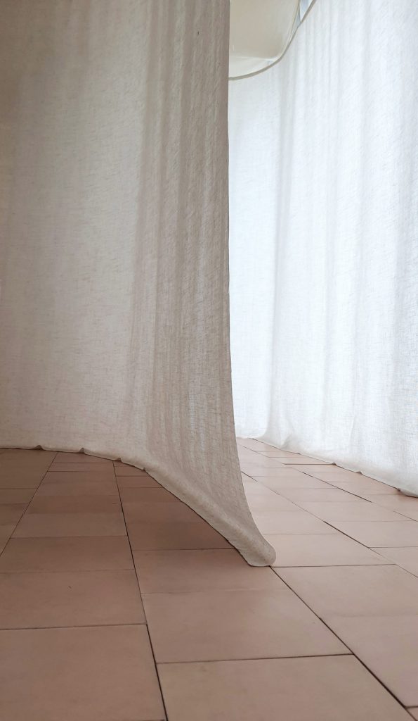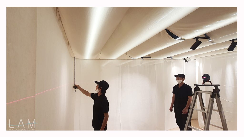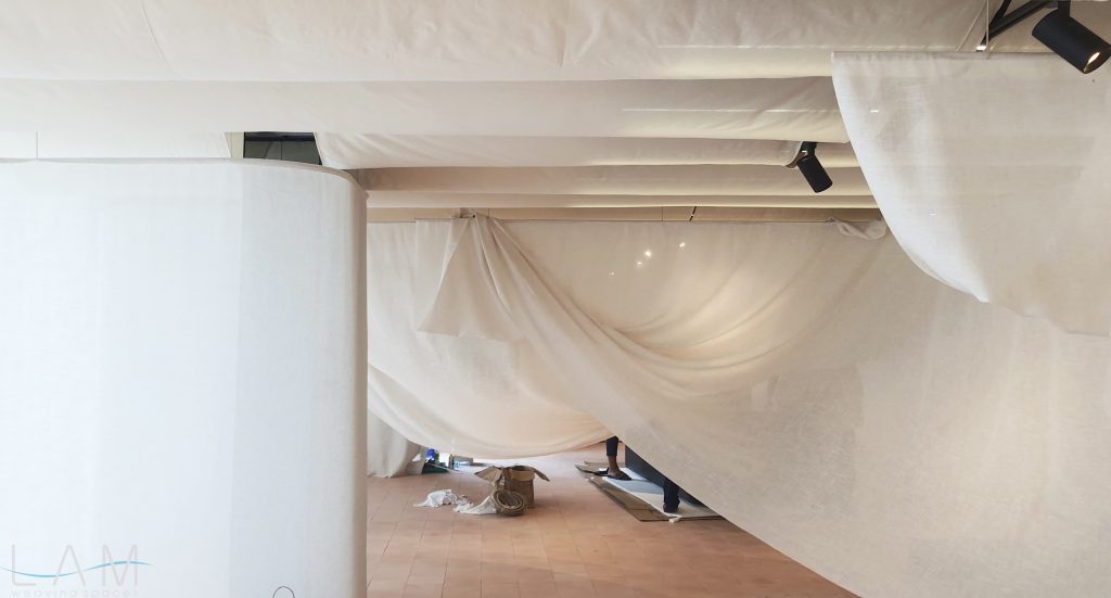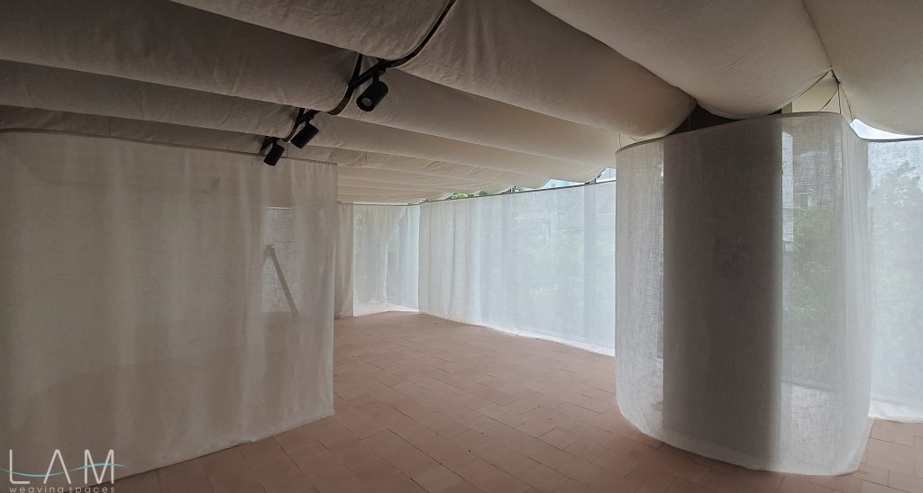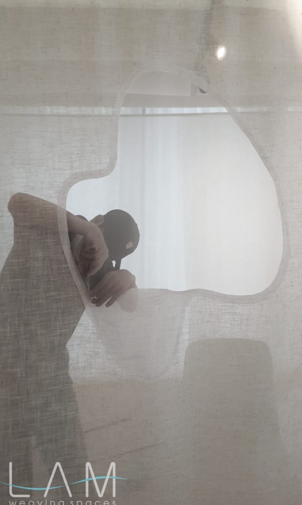 Một thiết kế độc đáo kết hợp giữa rèm trần và rèm ngăn di động, tạo nên không gian linh hoạt và tinh tế. Rèm trần được bố trí với các lớp vải cong mịn màng, tạo hiệu ứng mềm mại và âm học tốt, giúp không gian trở nên nhẹ nhàng và êm dịu. Rèm ngăn di động được làm từ chất liệu vải tự nhiên, có tính chất thoáng mát và nhẹ, có thể dễ dàng di chuyển để thay đổi không gian khi cần thiết. Thiết kế đơn giản nhưng hiệu quả, kết hợp với hệ thống thanh treo linh hoạt, giúp điều chỉnh không gian mở hay đóng tùy theo nhu cầu sử dụng. Hiệu ứng xuyên sáng của rèm tạo ra sự phân chia không gian một cách tinh tế mà không làm mất đi sự thông thoáng của môi trường.