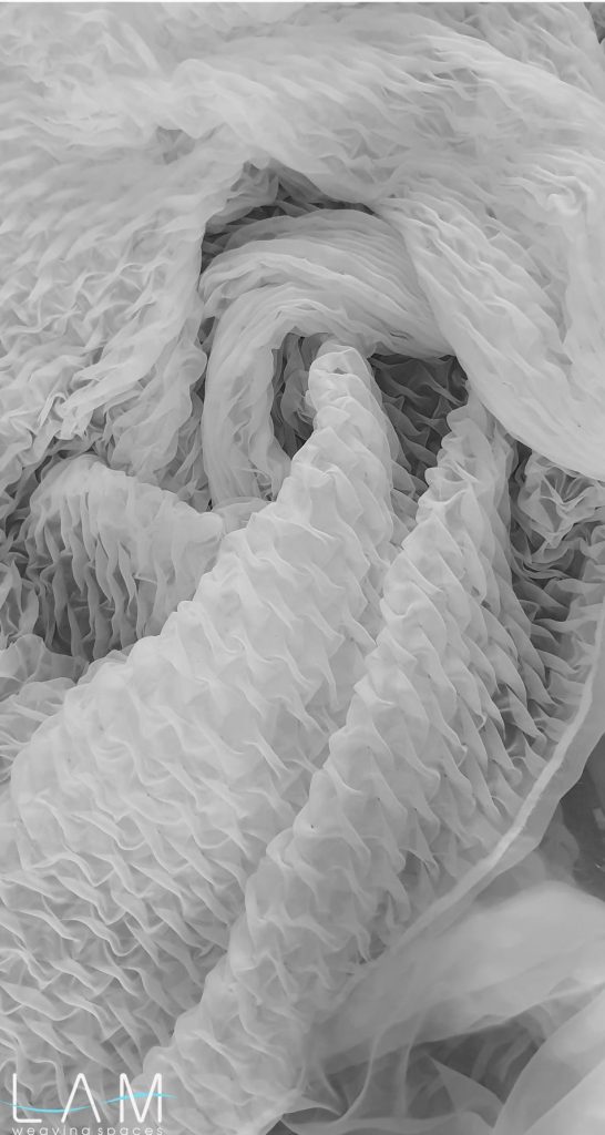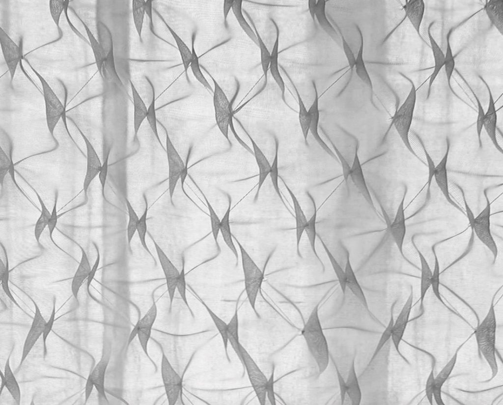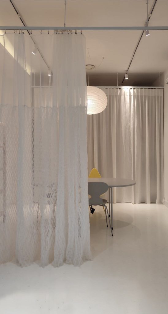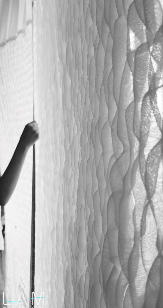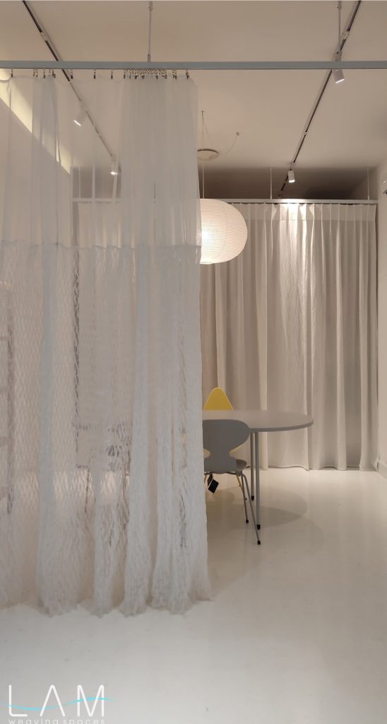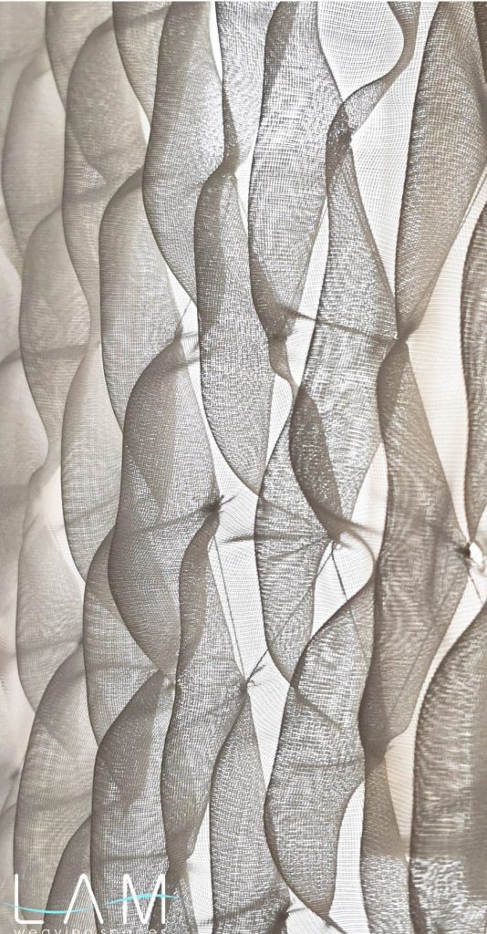 Rèm được nghiên cứu dùng kỹ thuật smocking để ứng dụng trong không gian văn phòng thiết kế nội thất, nơi yêu cầu sự linh hoạt nhưng vẫn đảm bảo tính riêng tư cần thiết. Chất liệu voan kết hợp với kỹ thuật nhún đặc trưng của smock tạo nên hiệu ứng trong mờ giàu chiều sâu, giúp mảng rèm hoạt động như một vách ngăn nhẹ, di động và vừa đủ kín đáo cho các phòng họp nhỏ.
