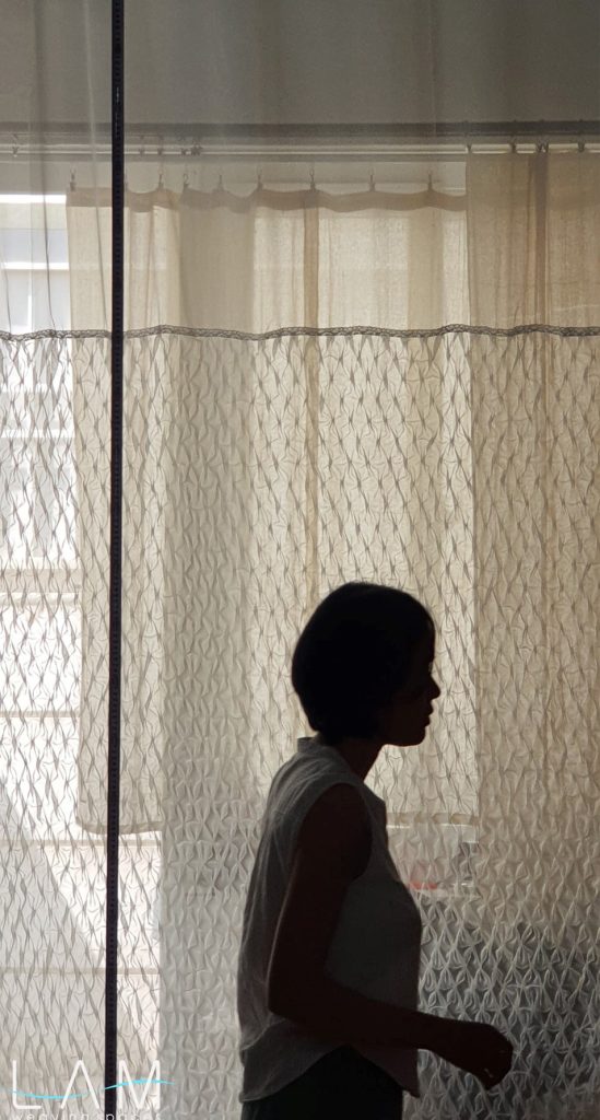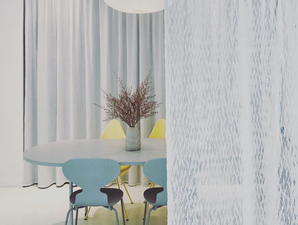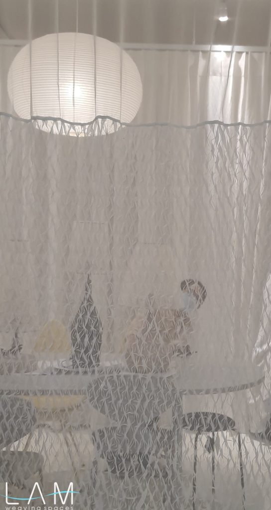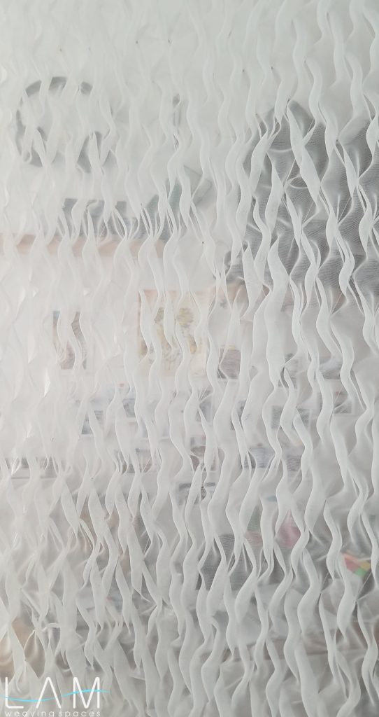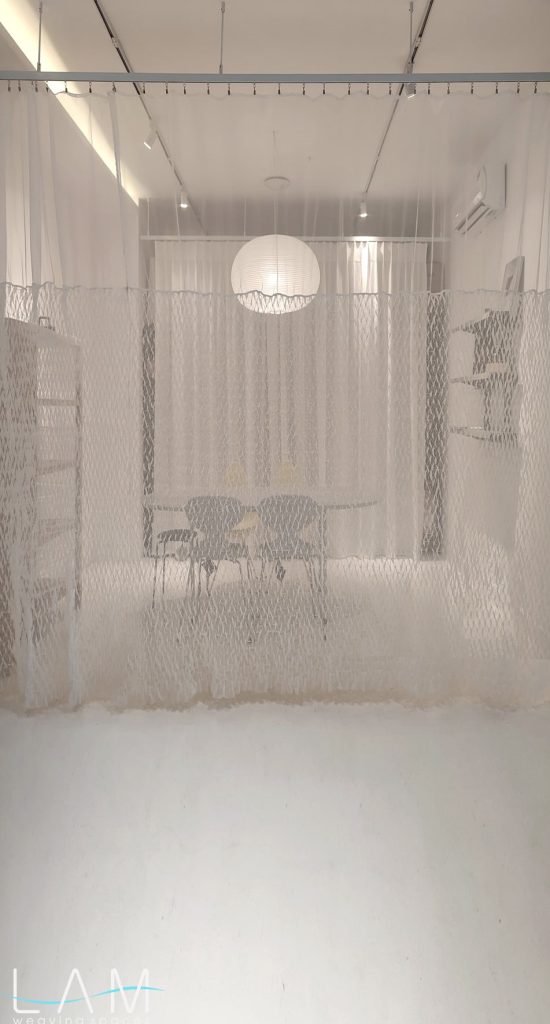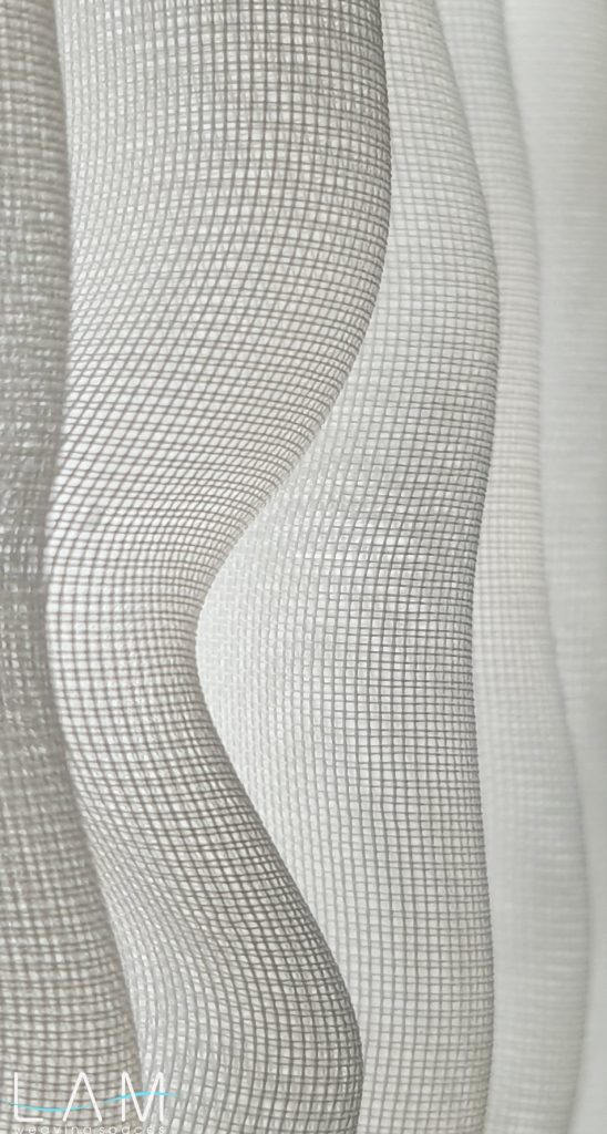 Rèm được nghiên cứu dùng kỹ thuật smocking để ứng dụng trong không gian văn phòng thiết kế nội thất, nơi yêu cầu sự linh hoạt nhưng vẫn đảm bảo tính riêng tư cần thiết. Chất liệu voan kết hợp với kỹ thuật nhún đặc trưng của smock tạo nên hiệu ứng trong mờ giàu chiều sâu, giúp mảng rèm hoạt động như một vách ngăn nhẹ, di động và vừa đủ kín đáo cho các phòng họp nhỏ.