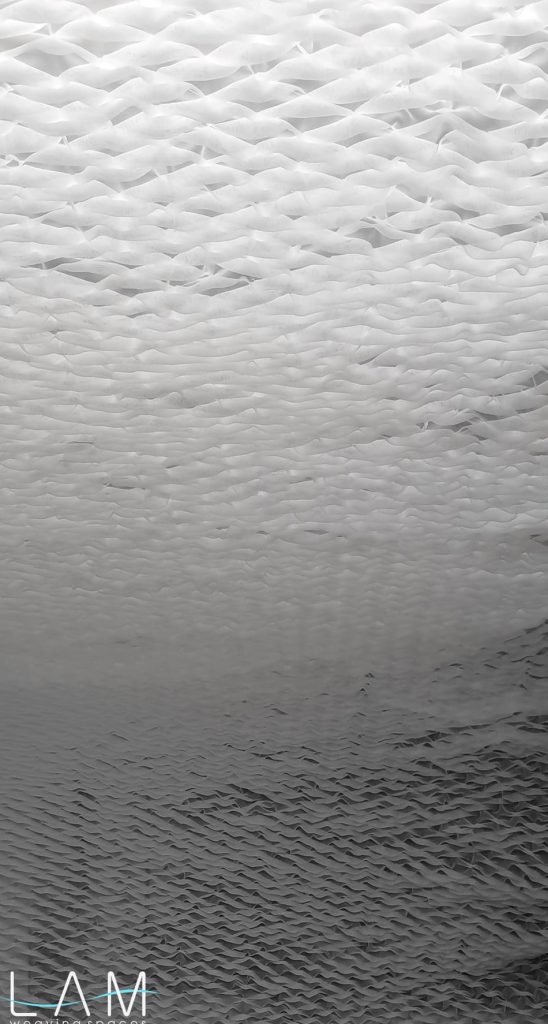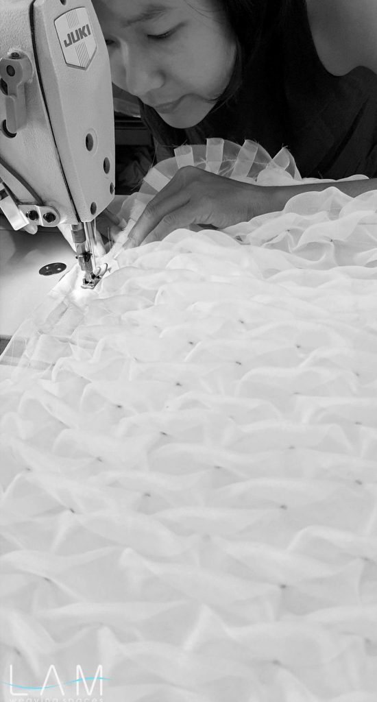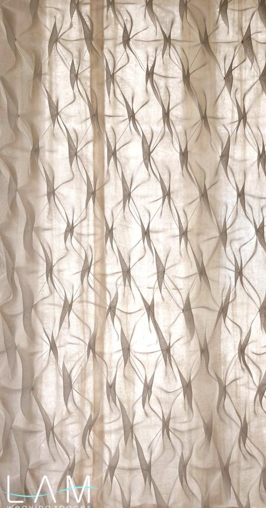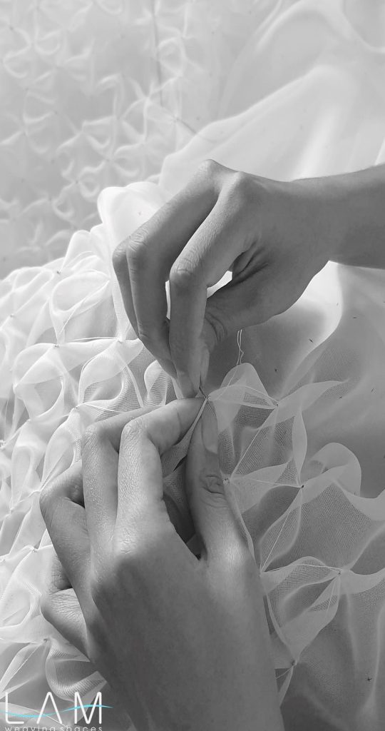 Với kích thước lớn, việc kiểm soát độ co giãn, độ phẳng phiu, biên rèm, lai rèm, chi tiết may, chi tiết nối khổ,… phức tạp hơn nhiều so với mảng phẳng. Hiệu ứng smock trên khổ voan lớn mang lại trải nghiệm thị giác đa dạng. Tùy theo hướng sáng, ngược sáng hay từng góc nhìn, bề mặt rèm thể hiện những sắc độ và chiều sâu khác nhau. Độ xuyên thấu của voan kết hợp với các nút thắt tạo khối khiến bề mặt không còn là một lớp phẳng đơn thuần mà trở nên sinh động và có cấu trúc. Kỹ thuật smock vốn phổ biến trong ngành thời trang, tuy nhiên khi ứng dụng vào lĩnh vực kiến trúc – nội thất, cần được nghiên cứu kỹ hơn về hiệu ứng không gian và tỷ lệ quy mô.