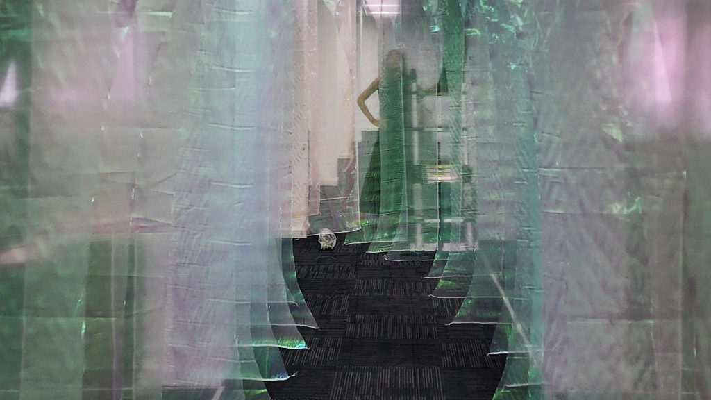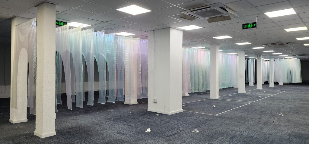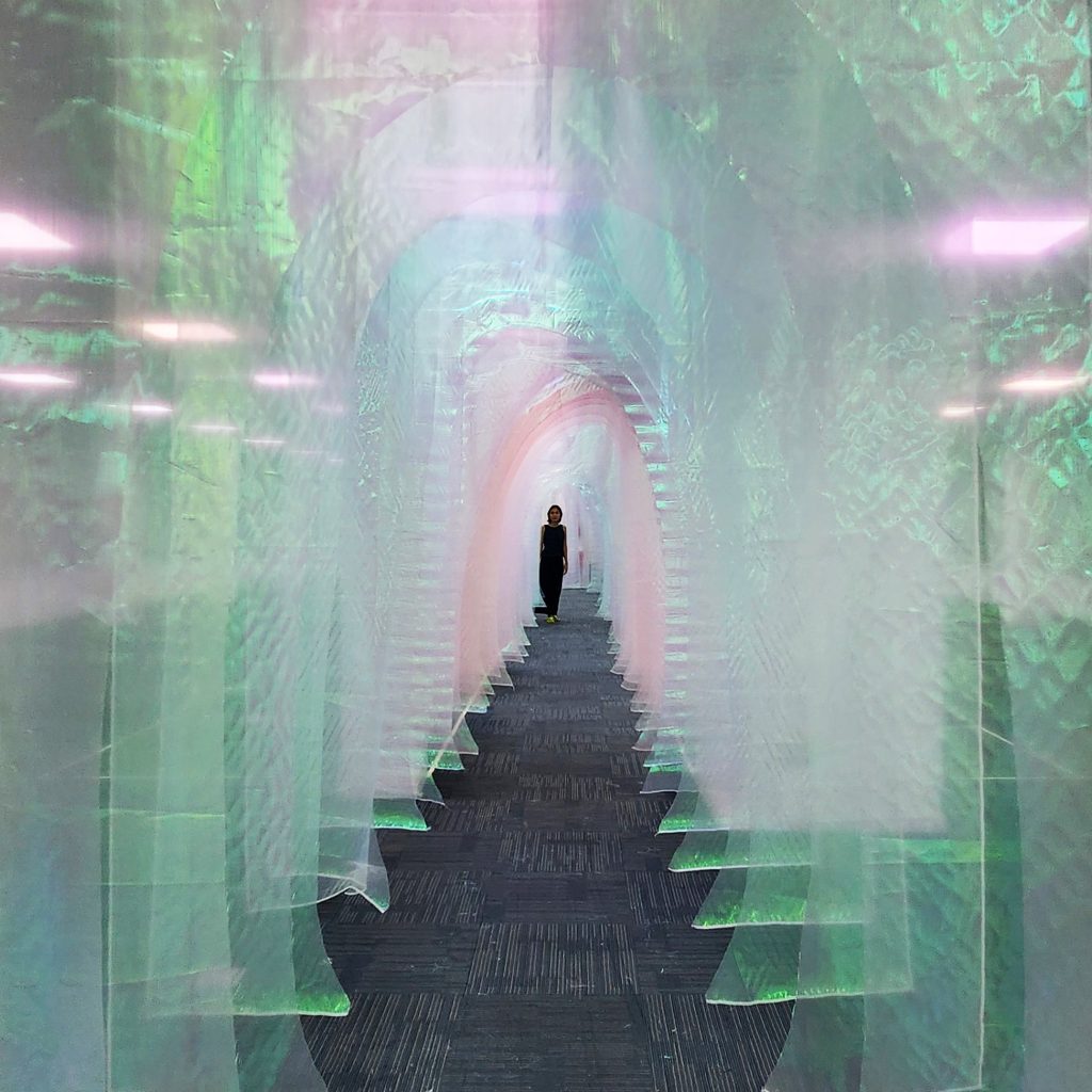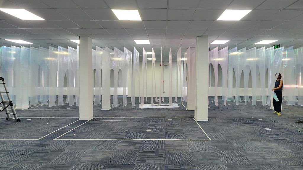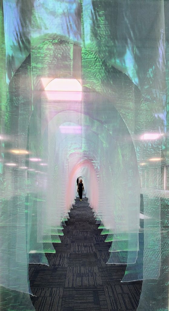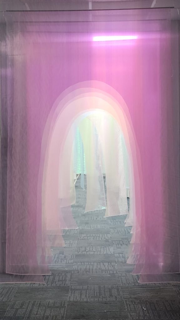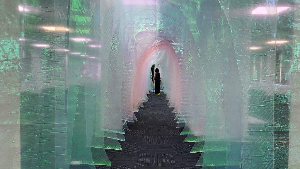 Không gian sắp đặt do LAM thực hiện cho sự kiện TRAVELÔCÔ được hình dung như một chuyến tàu giàu chất thơ xuất hiện ngay giữa không gian hội chợ. Những mảng vải buông xuống từ trên cao tái hiện hình ảnh đoàn tàu nối tiếp nhau, mở ra một hành trình thị giác gợi nhiều liên tưởng và cảm xúc. Từng “toa tàu” được hình thành từ các lớp vải nối dài trong không gian, tạo nên một nhịp điệu chuyển động liên tục. Hình ảnh ấy gợi nên một chuyến tàu lướt êm qua những đồng bằng phẳng lặng, băng qua những cây cầu sắt vắt ngang sông, rồi uốn lượn qua các khe núi. Chuỗi chuyển động mềm mại của vật liệu, kết hợp với ánh sáng và màu sắc, đã tạo nên một câu chuyện không gian sống động, nơi hành trình tưởng tượng được tái hiện giữa bối cảnh hội chợ đầy sắc màu.