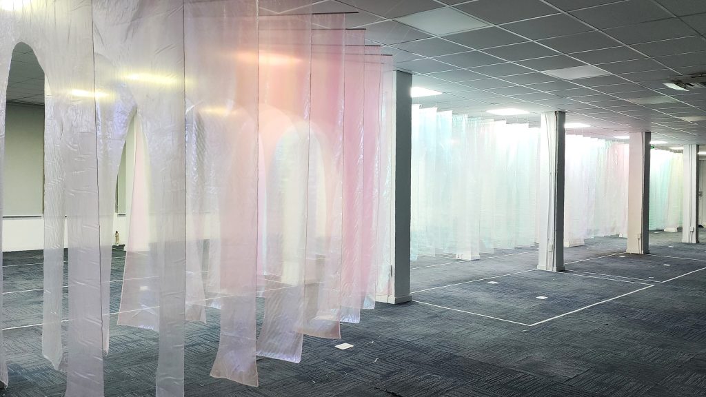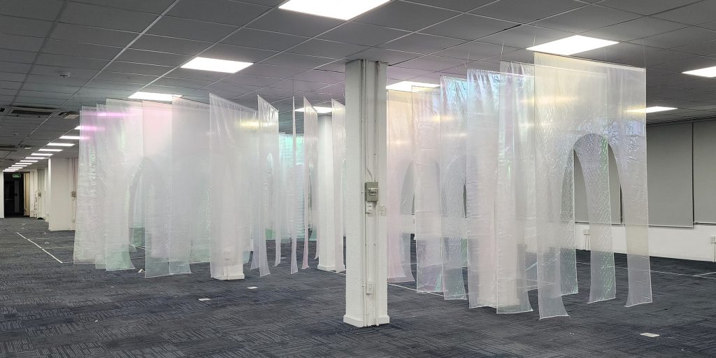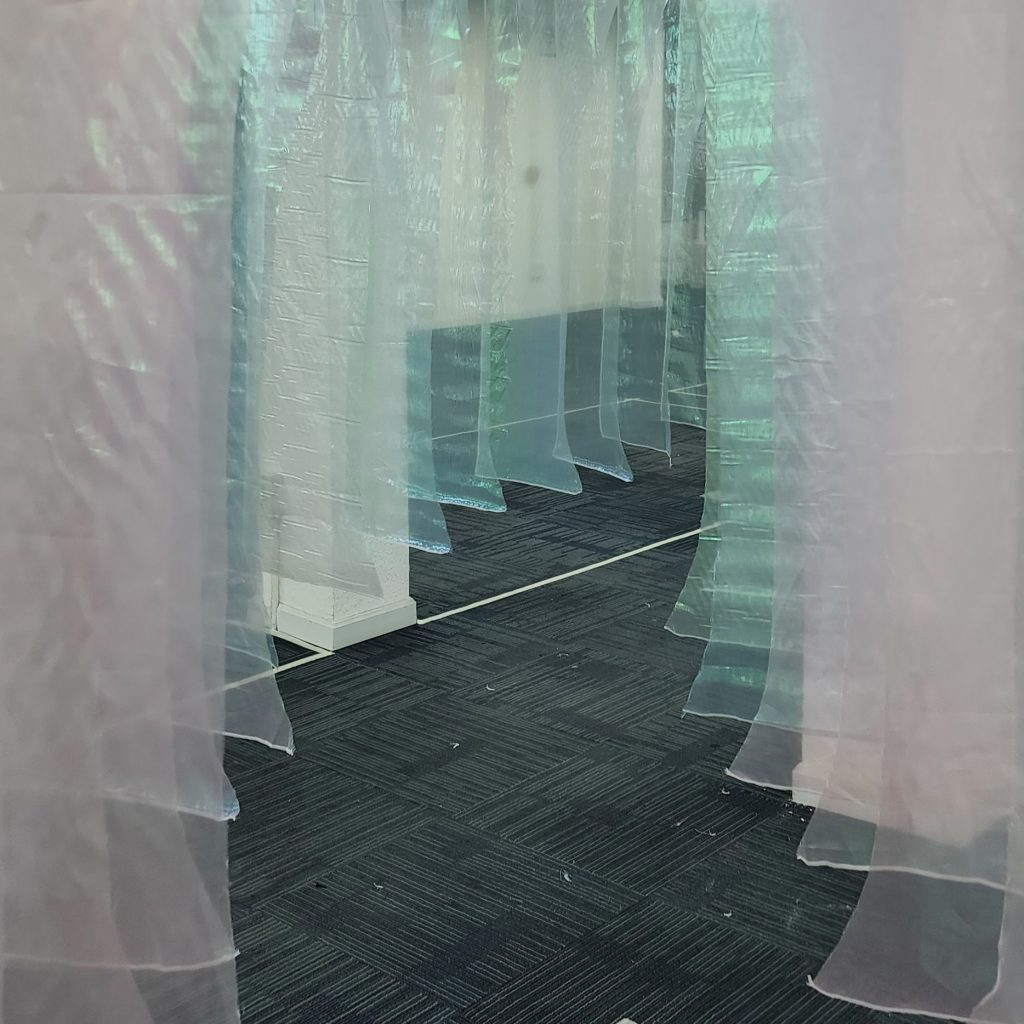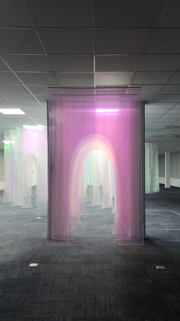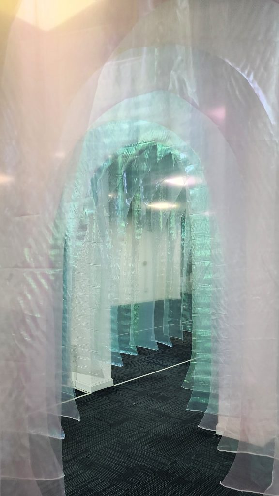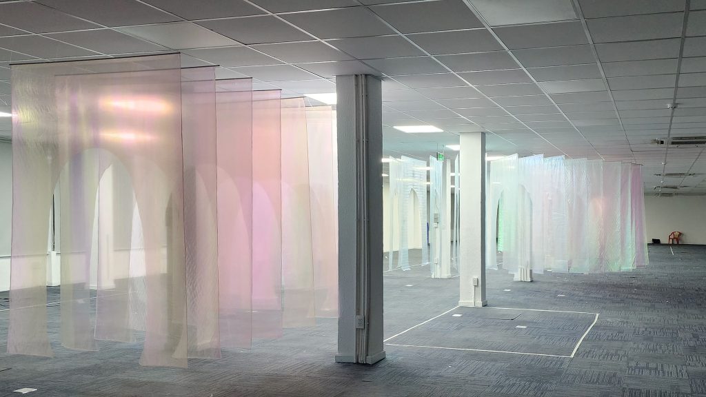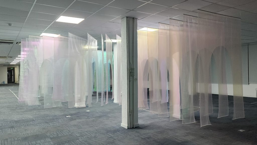 Không gian sắp đặt do LAM thực hiện cho sự kiện TRAVELÔCÔ được hình dung như một chuyến tàu giàu chất thơ xuất hiện ngay giữa không gian hội chợ. Những mảng vải buông xuống từ trên cao tái hiện hình ảnh đoàn tàu nối tiếp nhau, mở ra một hành trình thị giác gợi nhiều liên tưởng và cảm xúc. Từng “toa tàu” được hình thành từ các lớp vải nối dài trong không gian, tạo nên một nhịp điệu chuyển động liên tục. Hình ảnh ấy gợi nên một chuyến tàu lướt êm qua những đồng bằng phẳng lặng, băng qua những cây cầu sắt vắt ngang sông, rồi uốn lượn qua các khe núi. Chuỗi chuyển động mềm mại của vật liệu, kết hợp với ánh sáng và màu sắc, đã tạo nên một câu chuyện không gian sống động, nơi hành trình tưởng tượng được tái hiện giữa bối cảnh hội chợ đầy sắc màu.