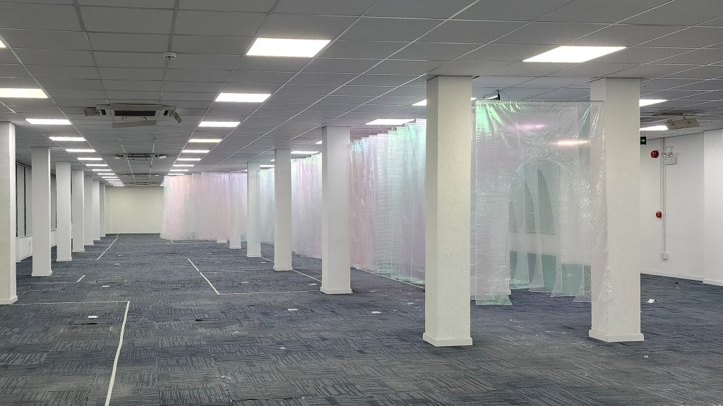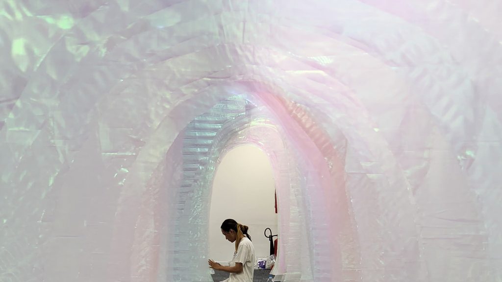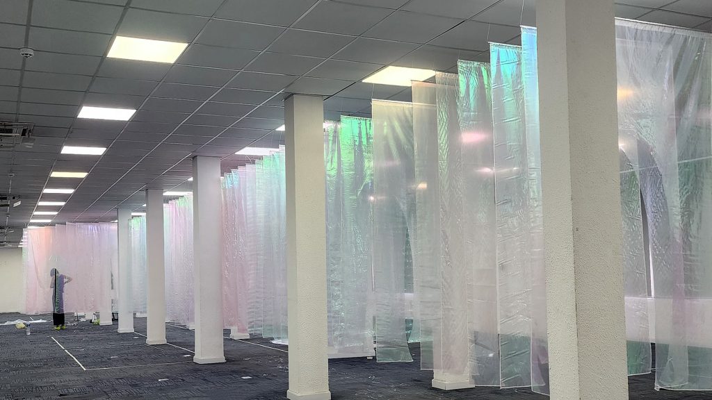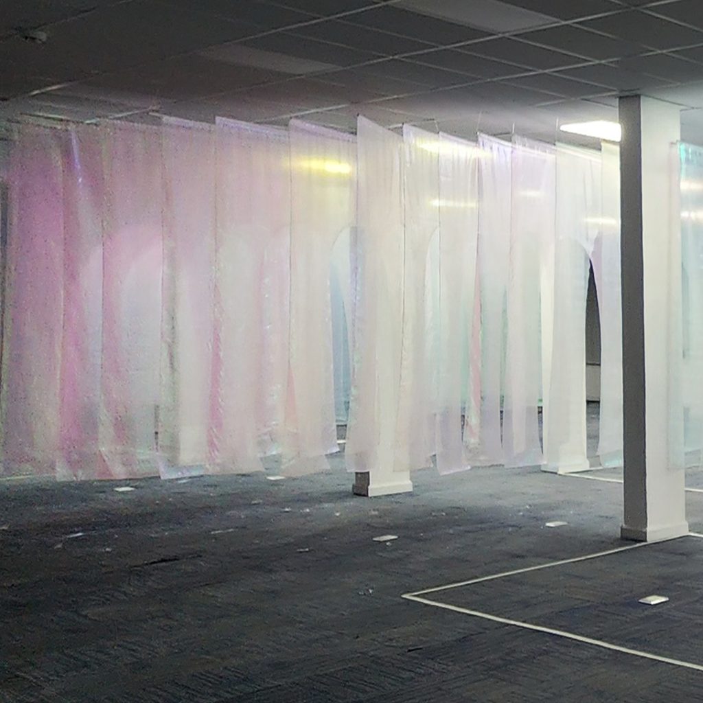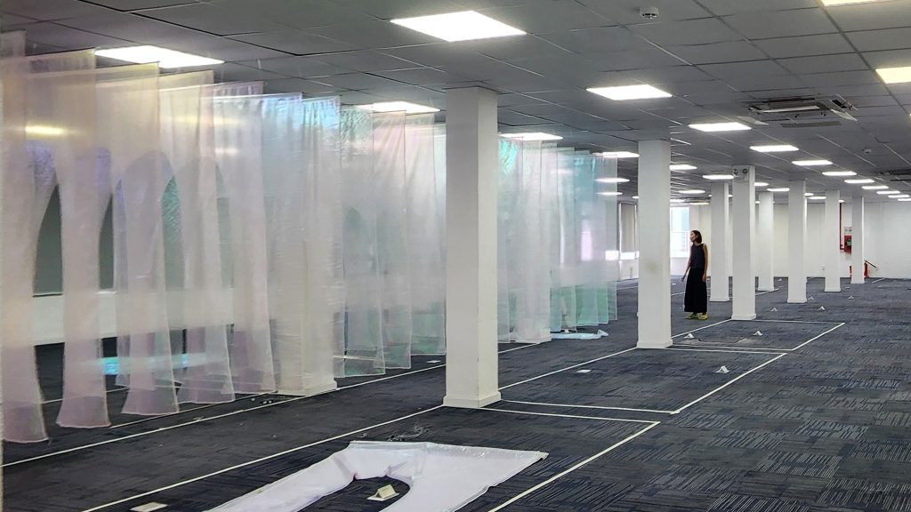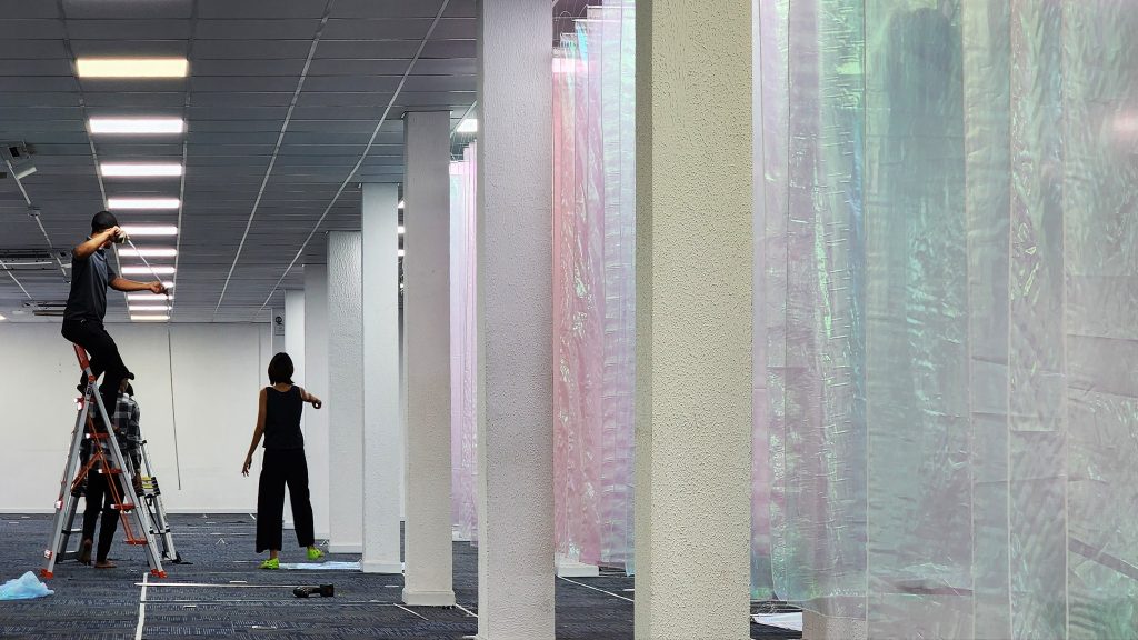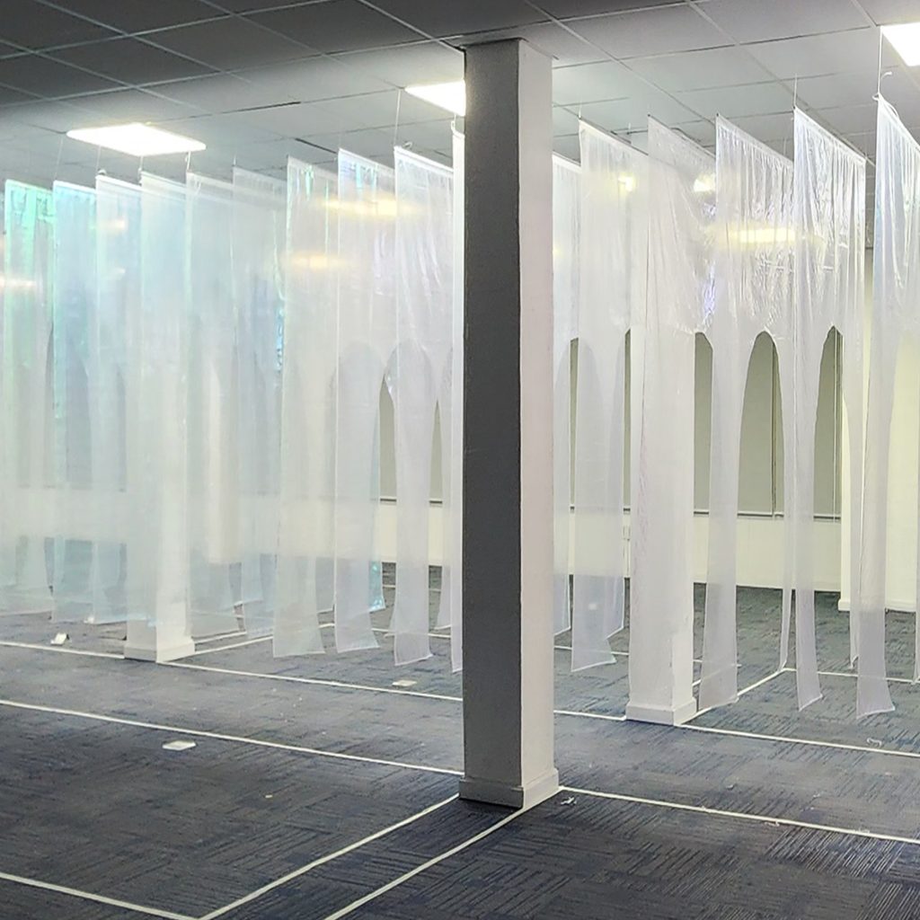 Không gian sắp đặt do LAM thực hiện cho sự kiện TRAVELÔCÔ được hình dung như một chuyến tàu giàu chất thơ xuất hiện ngay giữa không gian hội chợ. Những mảng vải buông xuống từ trên cao tái hiện hình ảnh đoàn tàu nối tiếp nhau, mở ra một hành trình thị giác gợi nhiều liên tưởng và cảm xúc. Từng “toa tàu” được hình thành từ các lớp vải nối dài trong không gian, tạo nên một nhịp điệu chuyển động liên tục. Hình ảnh ấy gợi nên một chuyến tàu lướt êm qua những đồng bằng phẳng lặng, băng qua những cây cầu sắt vắt ngang sông, rồi uốn lượn qua các khe núi. Chuỗi chuyển động mềm mại của vật liệu, kết hợp với ánh sáng và màu sắc, đã tạo nên một câu chuyện không gian sống động, nơi hành trình tưởng tượng được tái hiện giữa bối cảnh hội chợ đầy sắc màu.