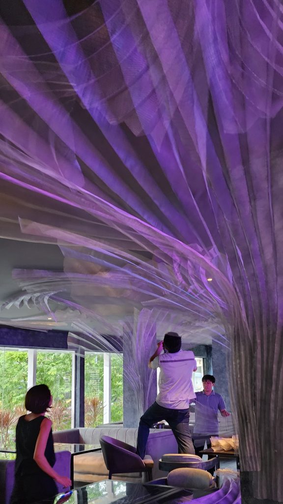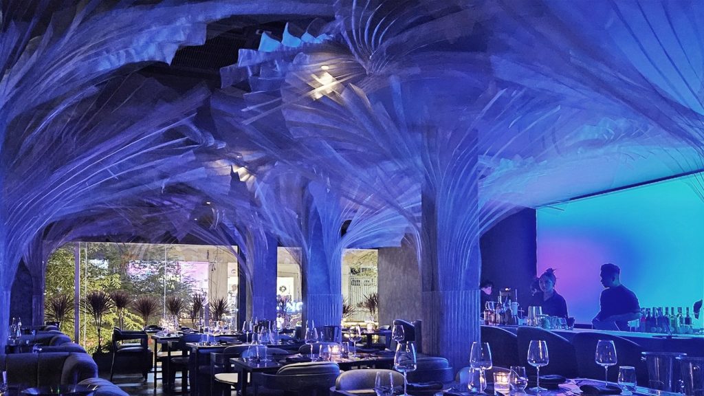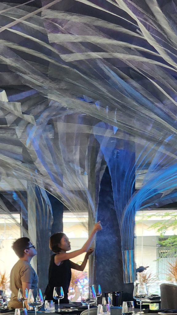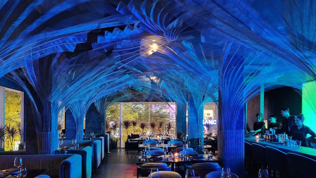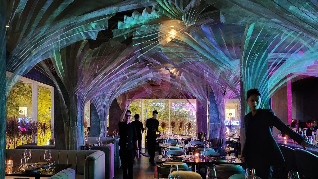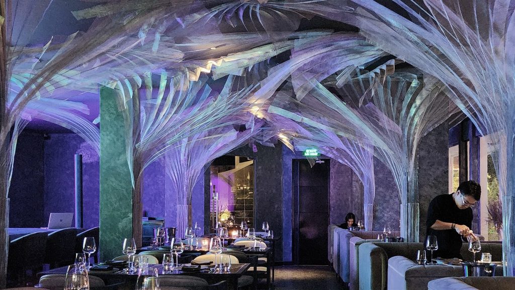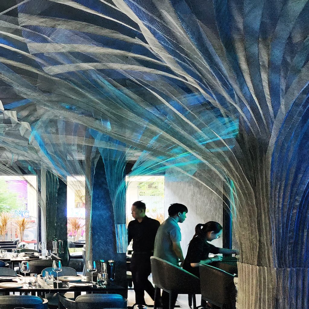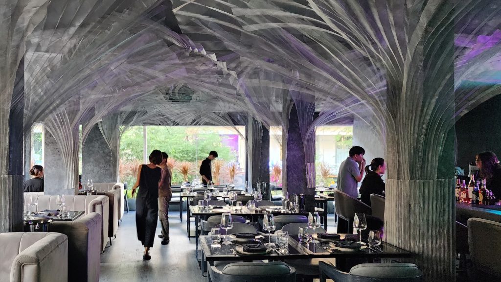 Điểm nhấn của không gian sắp đặt này nằm ở hệ cột và trần được tạo thành từ lưới sắt uốn cong, đan xen thành những mảng lớn với hình thái gợi liên tưởng đến thân cây hay những hình dáng tự nhiên. Cách sắp xếp này không chỉ mang lại cảm giác chuyển động nhẹ nhàng, đồng thời mở ra những không gian mở và gợi ý một thiên nhiên trừu tượng giữa nội thất nhà hàng. Hệ thống chiếu sáng đóng vai trò quan trọng trong việc làm nổi bật cấu trúc của lưới sắt. Ánh sáng LED đa sắc, chuyển dần từ xanh lam đến tím, làm nổi bật những đường nét và tạo ra sự thay đổi ánh sáng mềm mại, liên tục biến đổi theo các góc nhìn. Ánh sáng không chỉ tạo ra sự nổi bật cho lưới sắt, mà còn làm cho không gian nhà hàng trở nên huyền ảo và đầy sức sống.