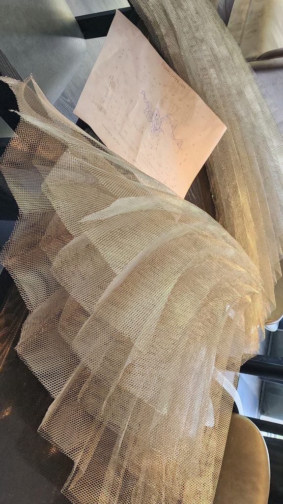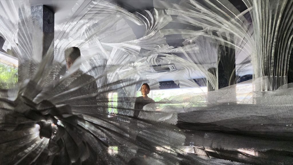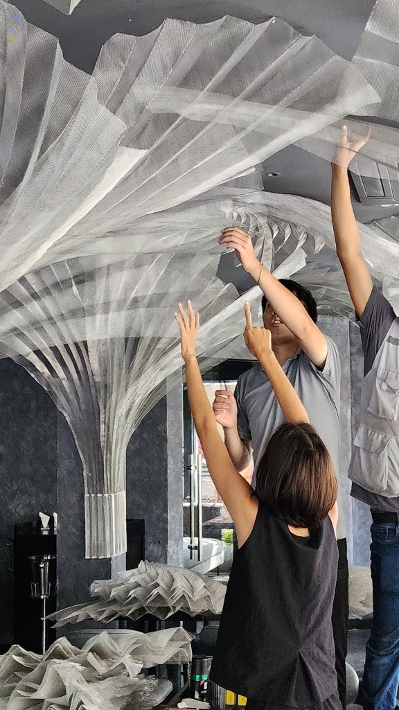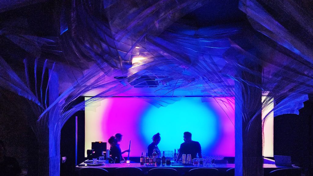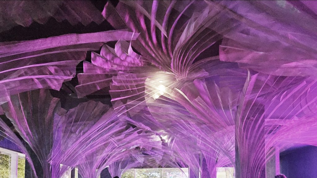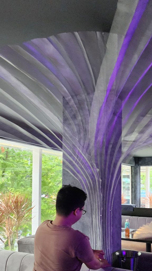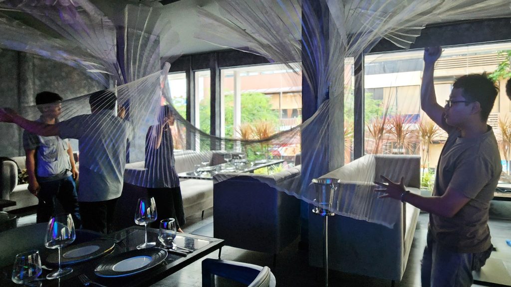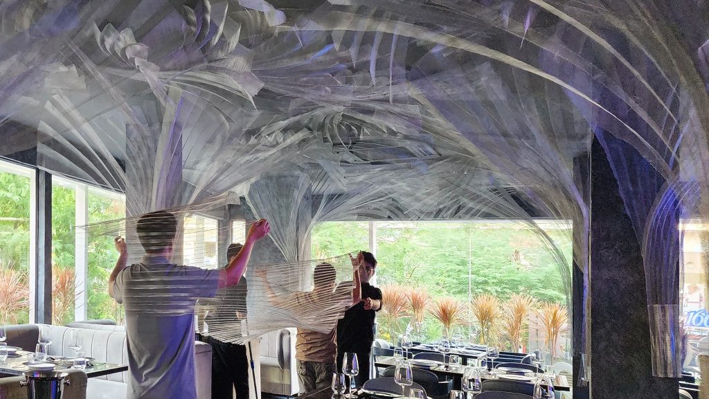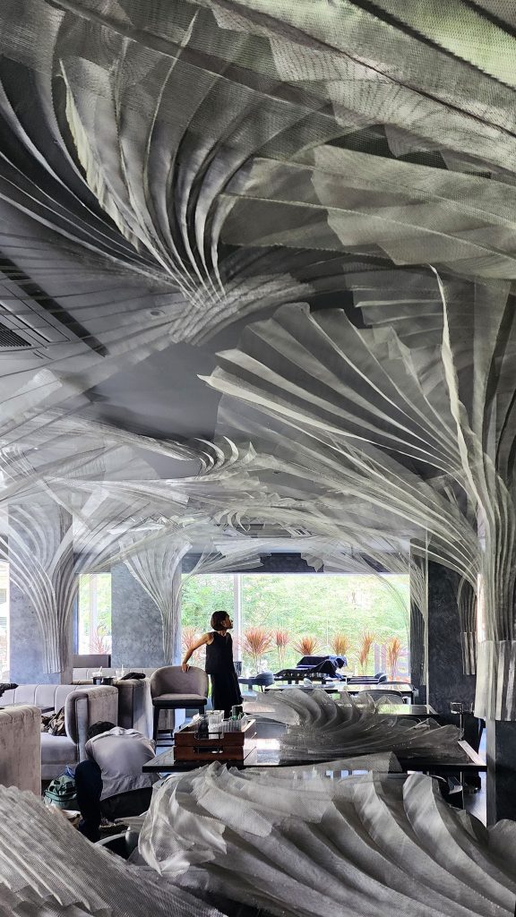 Điểm nhấn của không gian sắp đặt này nằm ở hệ cột và trần được tạo thành từ lưới sắt uốn cong, đan xen thành những mảng lớn với hình thái gợi liên tưởng đến thân cây hay những hình dáng tự nhiên. Cách sắp xếp này không chỉ mang lại cảm giác chuyển động nhẹ nhàng, đồng thời mở ra những không gian mở và gợi ý một thiên nhiên trừu tượng giữa nội thất nhà hàng. Hệ thống chiếu sáng đóng vai trò quan trọng trong việc làm nổi bật cấu trúc của lưới sắt. Ánh sáng LED đa sắc, chuyển dần từ xanh lam đến tím, làm nổi bật những đường nét và tạo ra sự thay đổi ánh sáng mềm mại, liên tục biến đổi theo các góc nhìn. Ánh sáng không chỉ tạo ra sự nổi bật cho lưới sắt, mà còn làm cho không gian nhà hàng trở nên huyền ảo và đầy sức sống.