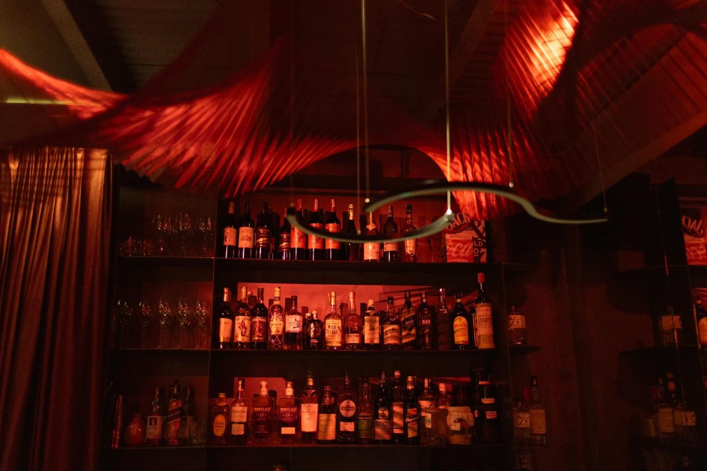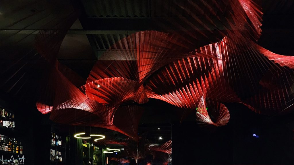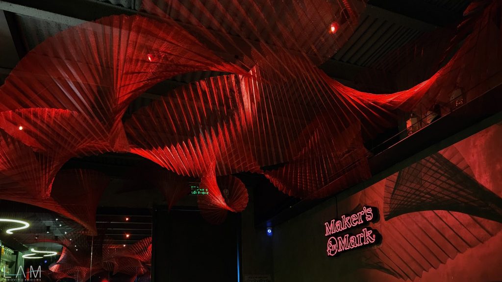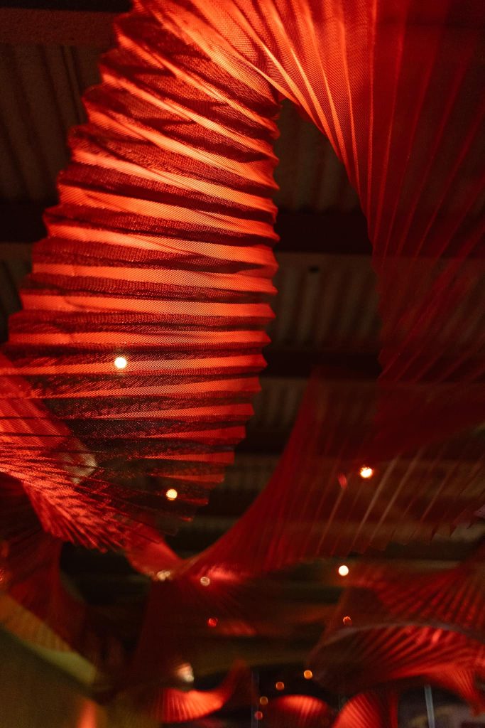 Lưới sắt, với độ bền và khả năng định hình cao, giúp các tác phẩm có thể giữ được cấu trúc phức tạp và chịu lực tốt khi treo lên. Khi kết hợp với ánh sáng đỏ, bề mặt kim loại phản chiếu ánh sáng và tạo nên các điểm sáng cùng bóng đổ sắc nét, làm không gian trở nên sống động và cuốn hút. Phương pháp tạo hình trong sắp đặt này thể hiện sự kết hợp giữa nghệ thuật và kiến trúc, tạo ra không gian vừa cứng cáp vừa giàu tính thẩm mỹ. Lưới sắt đóng vai trò quan trọng trong việc mang đến cảm giác vững chãi, trong khi ánh sáng màu đỏ tạo nên không khí huyền bí và hấp dẫn.