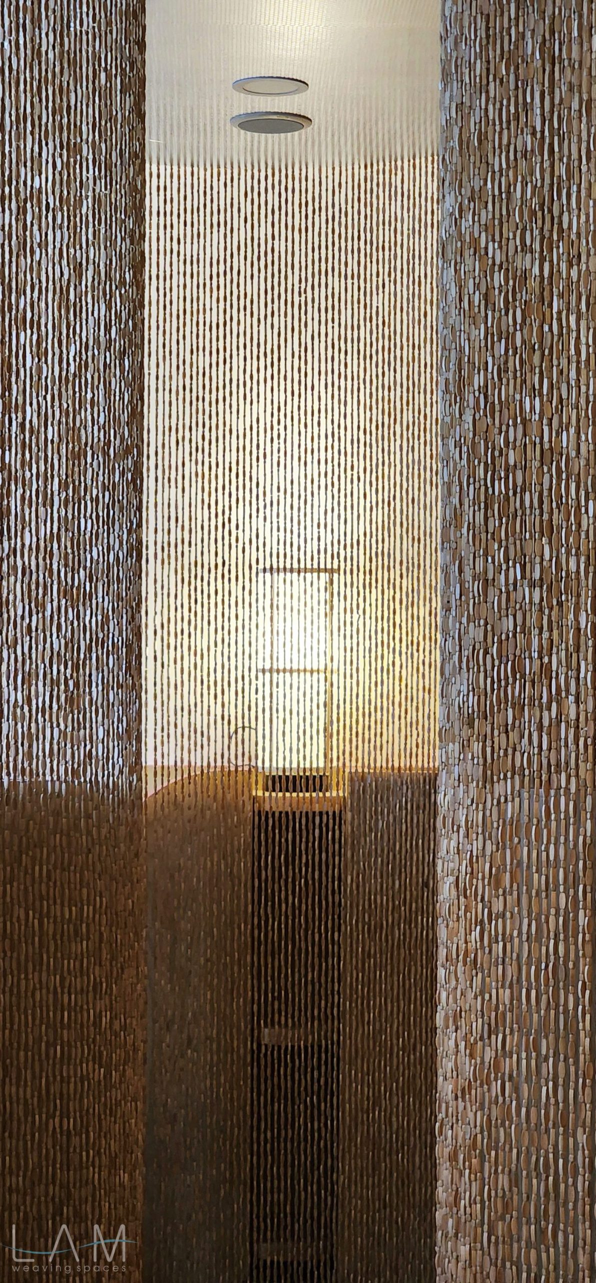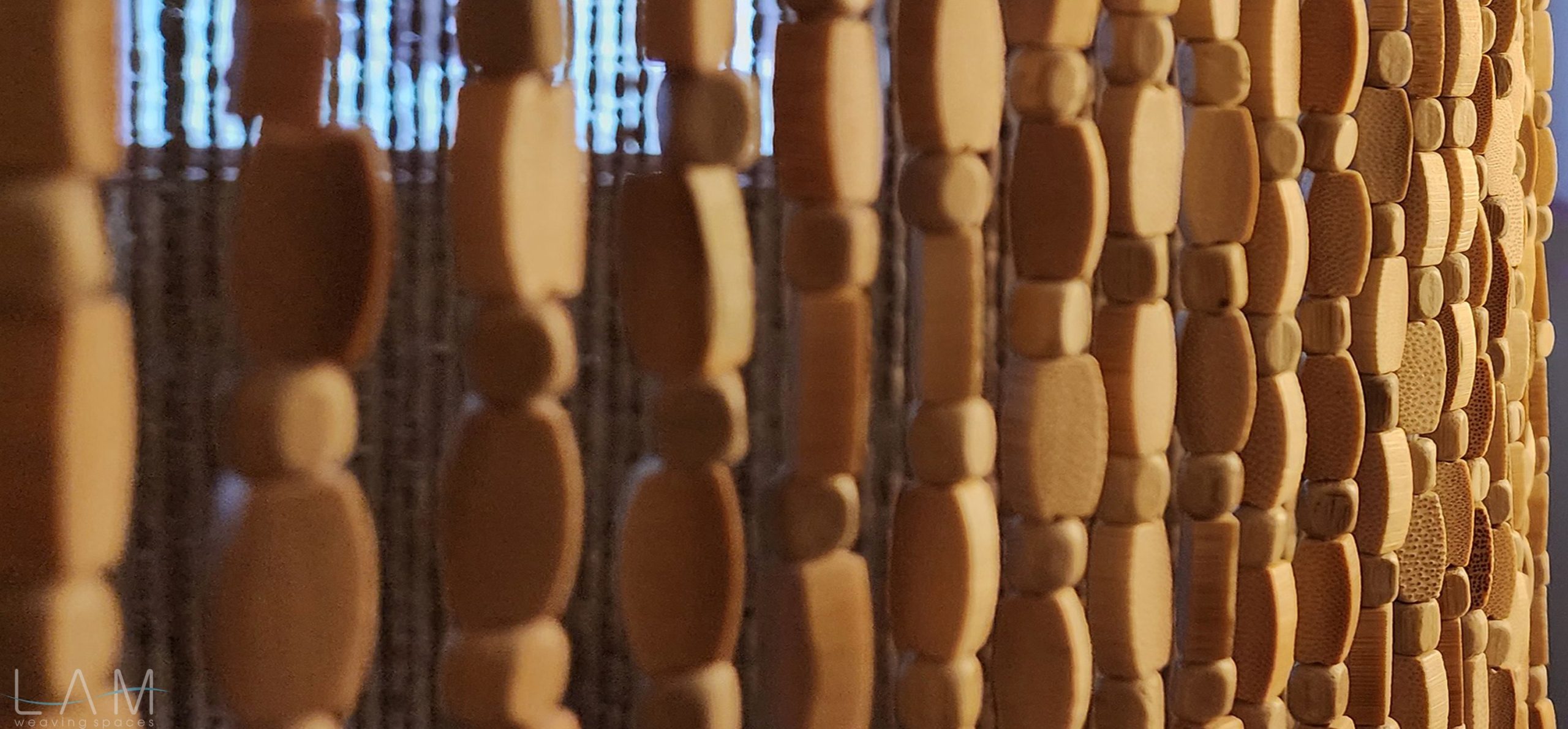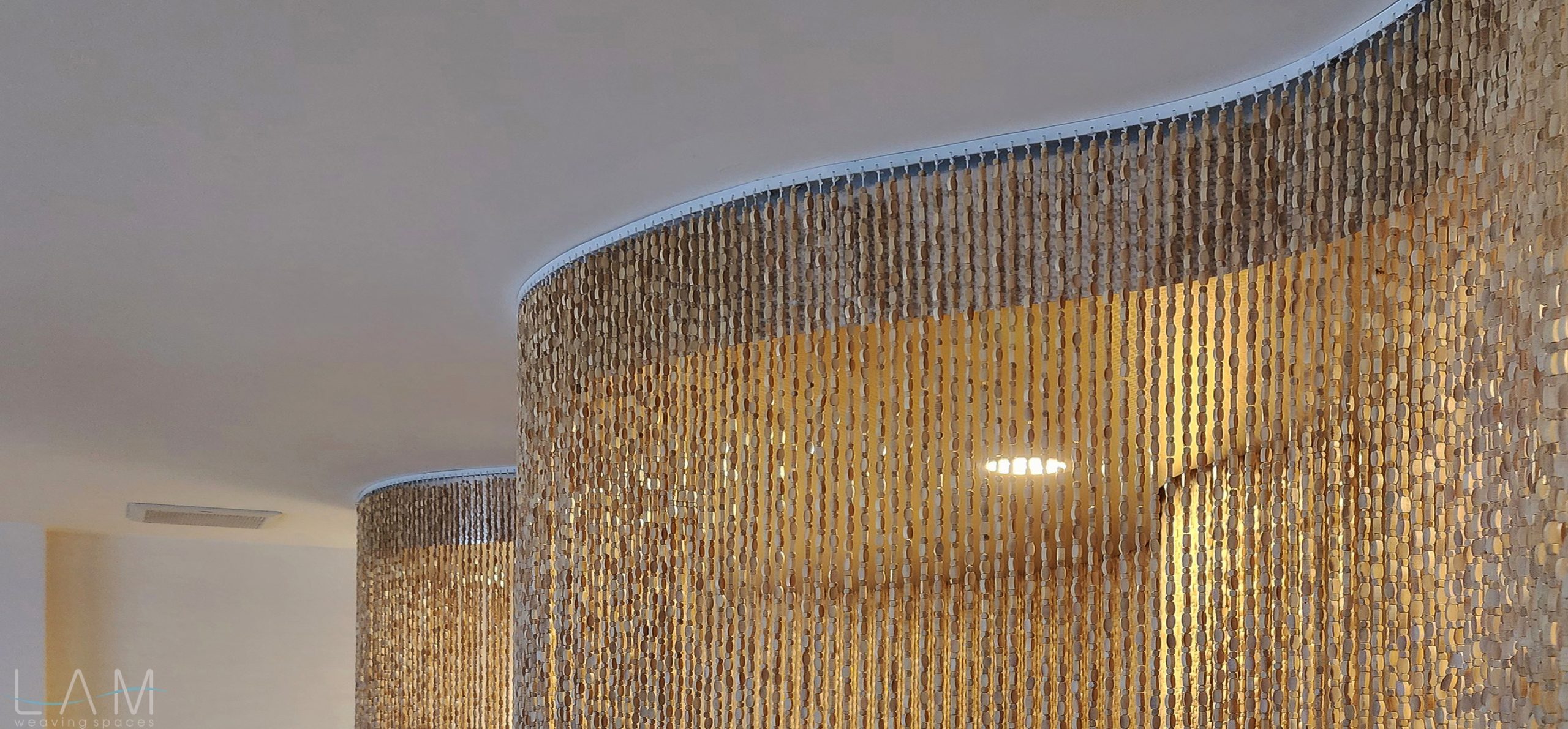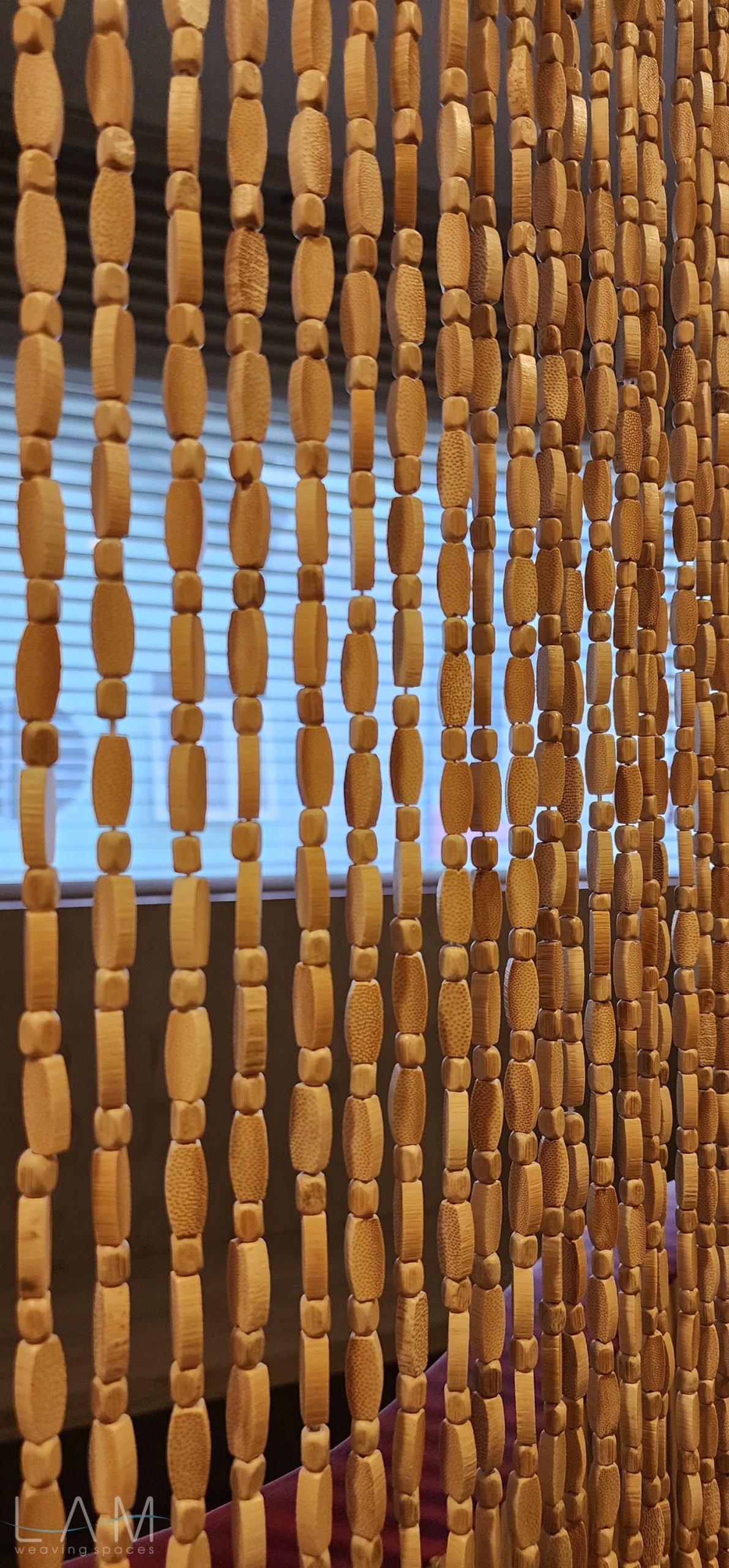 Hệ rèm trong ảnh sử dụng các chuỗi hạt gỗ với kiểu dáng độc đáo, tạo thành một lớp ngăn cách mềm mại nhưng vẫn giữ được tính kết nối không gian. Mỗi hạt gỗ được chế tác tinh tế với kích thước và hình dáng khác nhau, được kết nối với nhau theo chiều dọc tạo thành một tấm rèm tự nhiên, uốn lượn theo kiến trúc của trần nhà. Hệ rèm không chỉ đóng vai trò phân chia không gian mà còn tạo ra hiệu ứng thị giác ấn tượng khi ánh sáng chiếu qua, tạo ra các bóng đổ mềm mại lên bề mặt xung quanh.