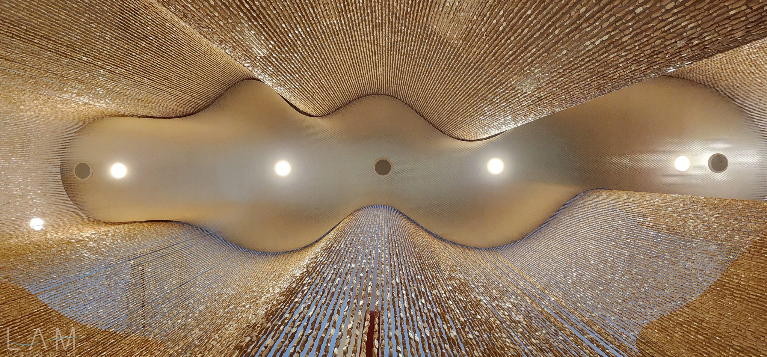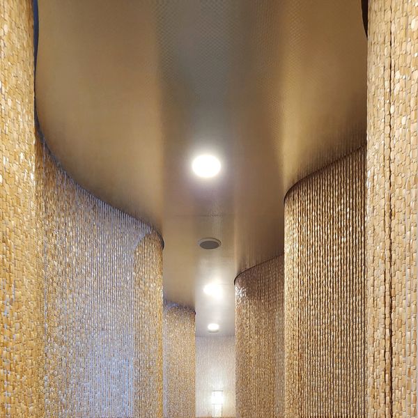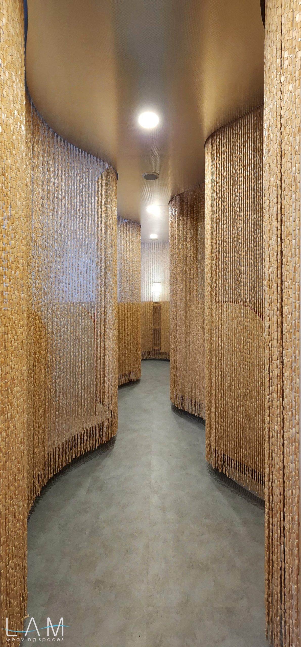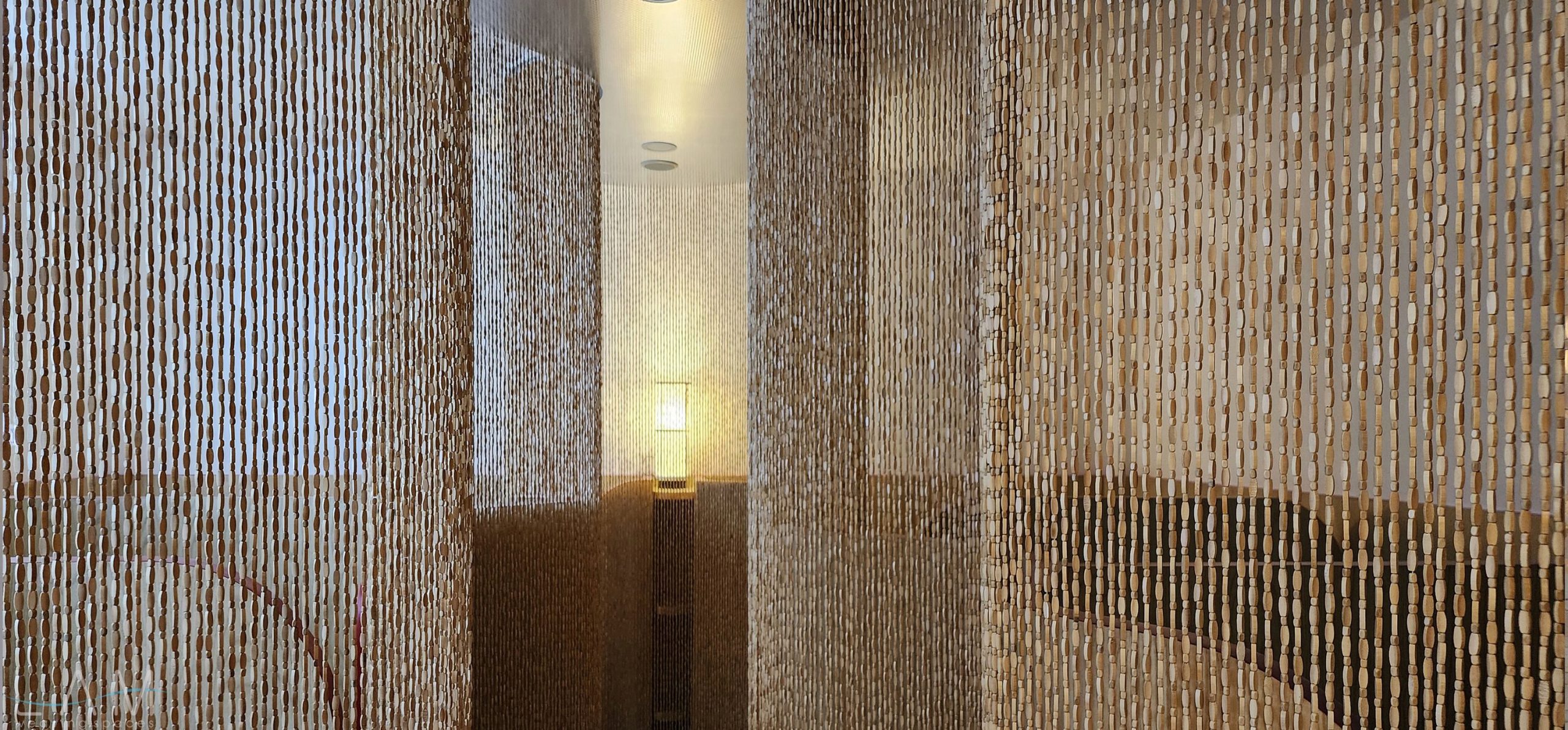 Hệ rèm trong ảnh sử dụng các chuỗi hạt gỗ với kiểu dáng độc đáo, tạo thành một lớp ngăn cách mềm mại nhưng vẫn giữ được tính kết nối không gian. Mỗi hạt gỗ được chế tác tinh tế với kích thước và hình dáng khác nhau, được kết nối với nhau theo chiều dọc tạo thành một tấm rèm tự nhiên, uốn lượn theo kiến trúc của trần nhà. Hệ rèm không chỉ đóng vai trò phân chia không gian mà còn tạo ra hiệu ứng thị giác ấn tượng khi ánh sáng chiếu qua, tạo ra các bóng đổ mềm mại lên bề mặt xung quanh.