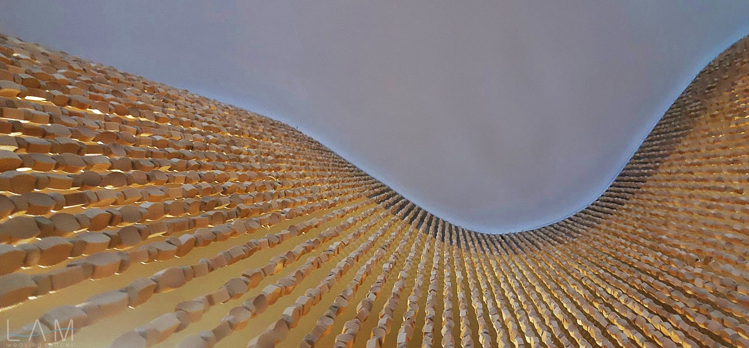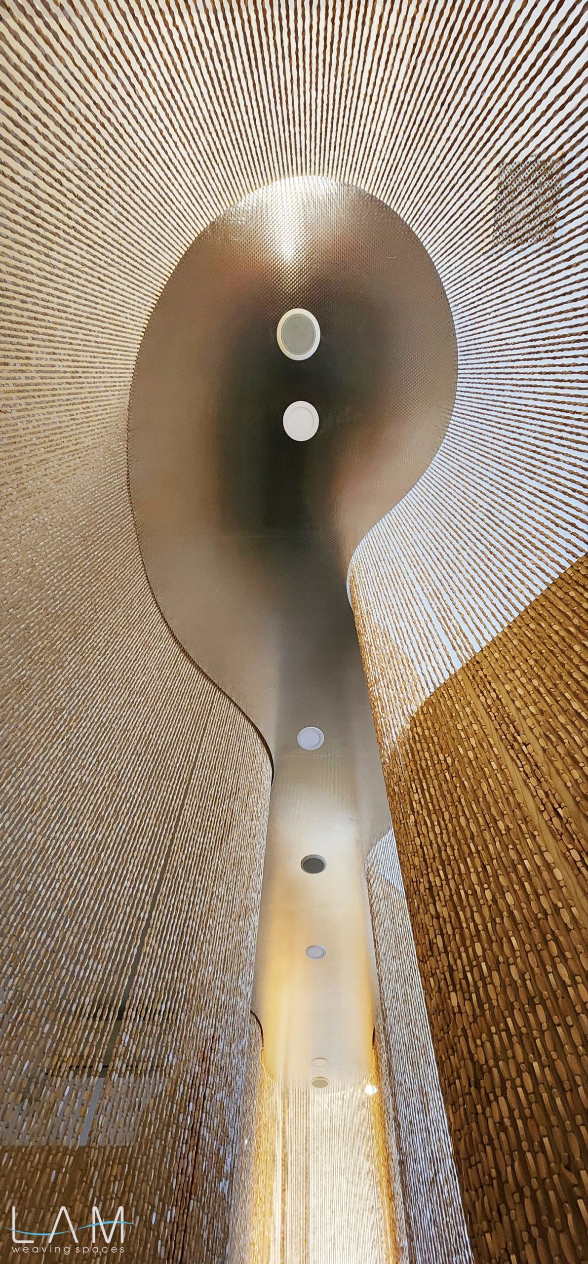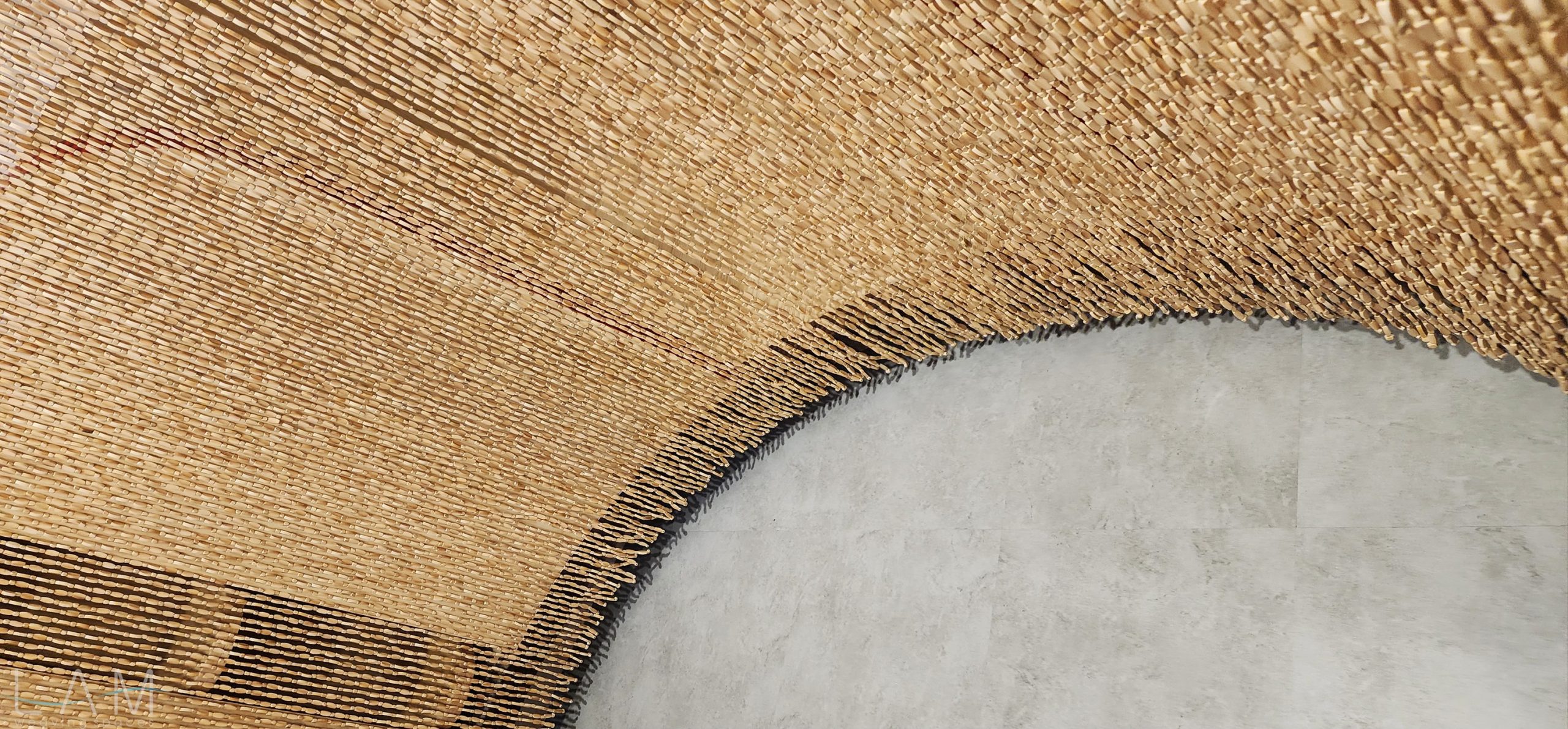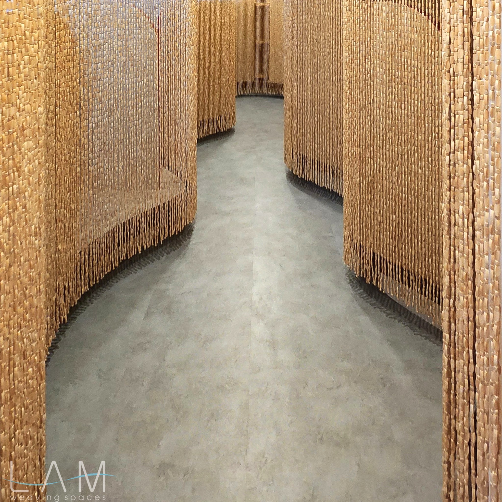 Hệ rèm trong ảnh sử dụng các chuỗi hạt gỗ với kiểu dáng độc đáo, tạo thành một lớp ngăn cách mềm mại nhưng vẫn giữ được tính kết nối không gian. Mỗi hạt gỗ được chế tác tinh tế với kích thước và hình dáng khác nhau, được kết nối với nhau theo chiều dọc tạo thành một tấm rèm tự nhiên, uốn lượn theo kiến trúc của trần nhà. Hệ rèm không chỉ đóng vai trò phân chia không gian mà còn tạo ra hiệu ứng thị giác ấn tượng khi ánh sáng chiếu qua, tạo ra các bóng đổ mềm mại lên bề mặt xung quanh.