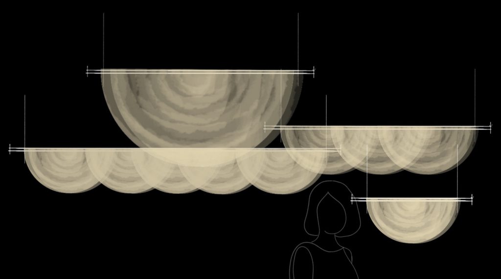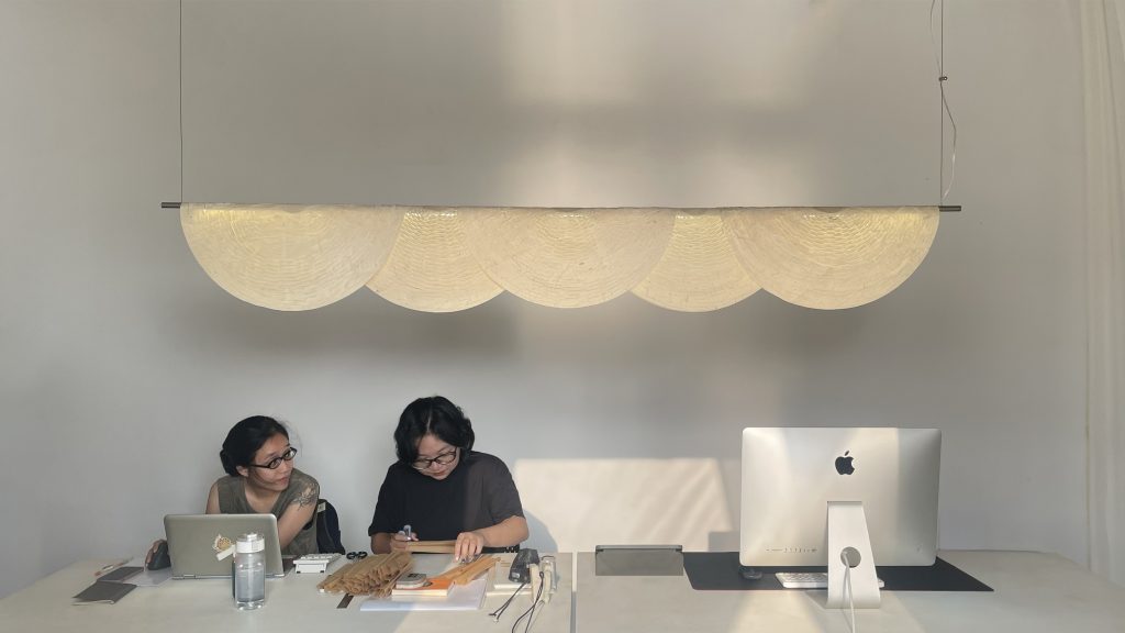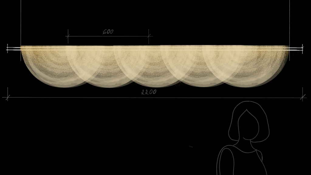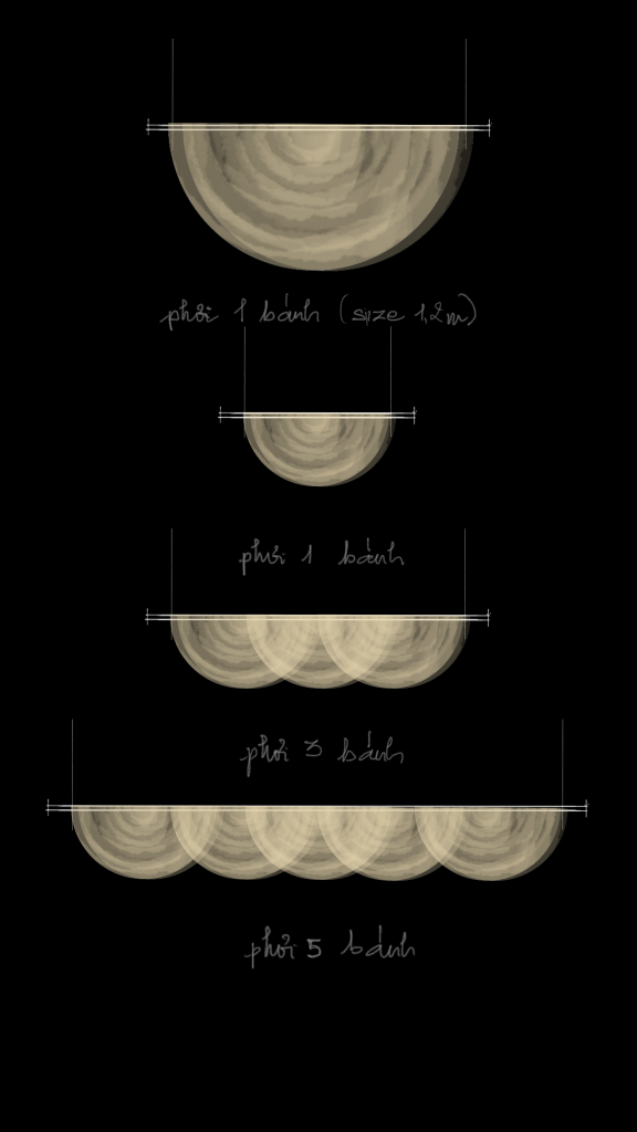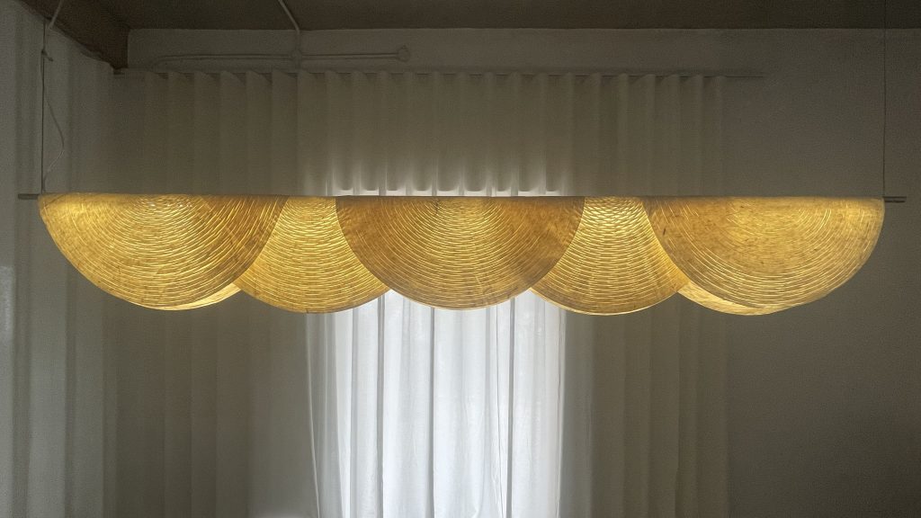 Đèn Phơi là một bước phát triển từ đèn BTS, kế thừa chất liệu giấy dó và kỹ thuật thủ công, nhưng mở rộng về hình thức và nhịp điệu thị giác. Thay vì một khối tròn tập trung, các lớp giấy được trải dài và lặp lại theo nhịp, gợi liên tưởng đến những bề mặt đang được phơi dưới ánh sáng. Ánh sáng đi qua từng lớp giấy, tạo nên sự chuyển tiếp mềm mại và có chiều sâu, như một dải sáng lan tỏa trong không gian. Ở phiên bản này, đèn không chỉ là nguồn sáng mà còn trở thành một cấu trúc treo, vừa nhẹ nhàng vừa có tính dẫn dắt không gian rõ ràng.