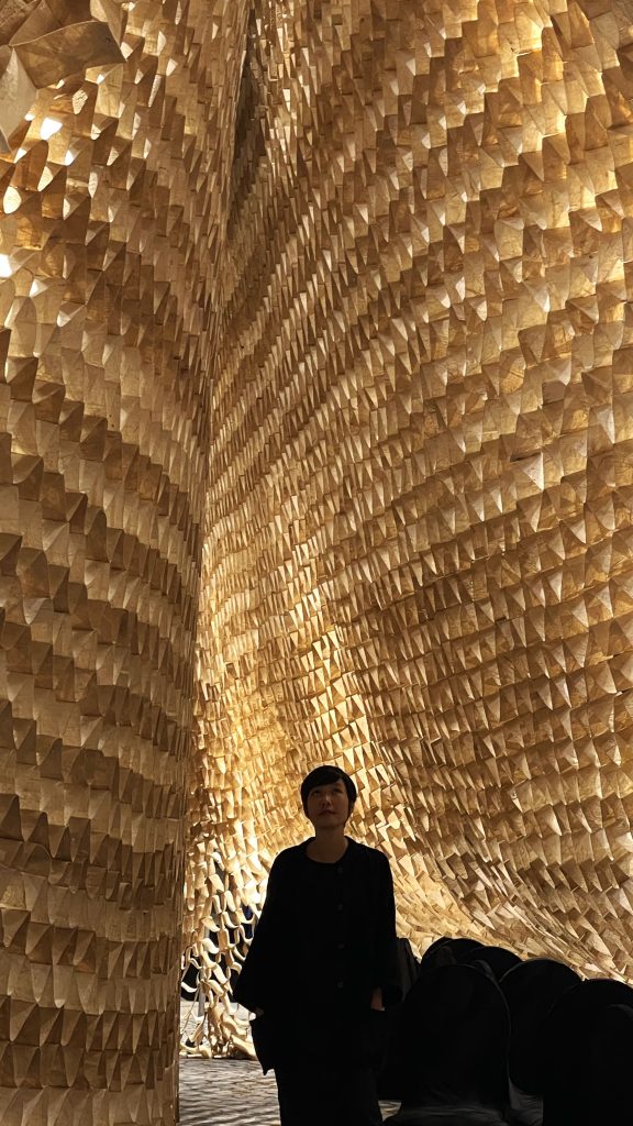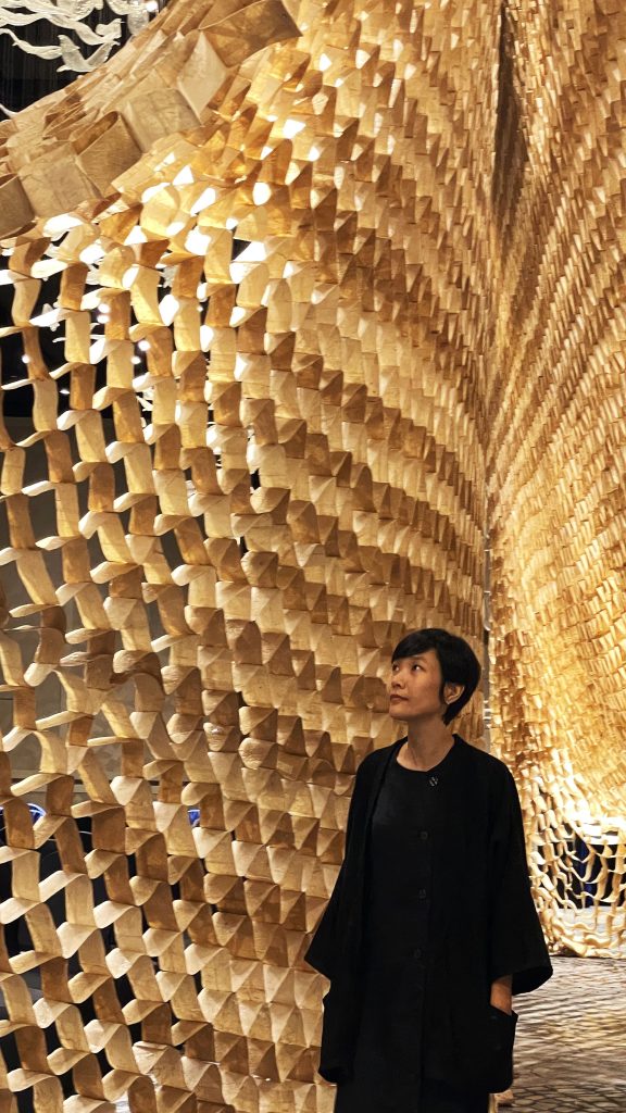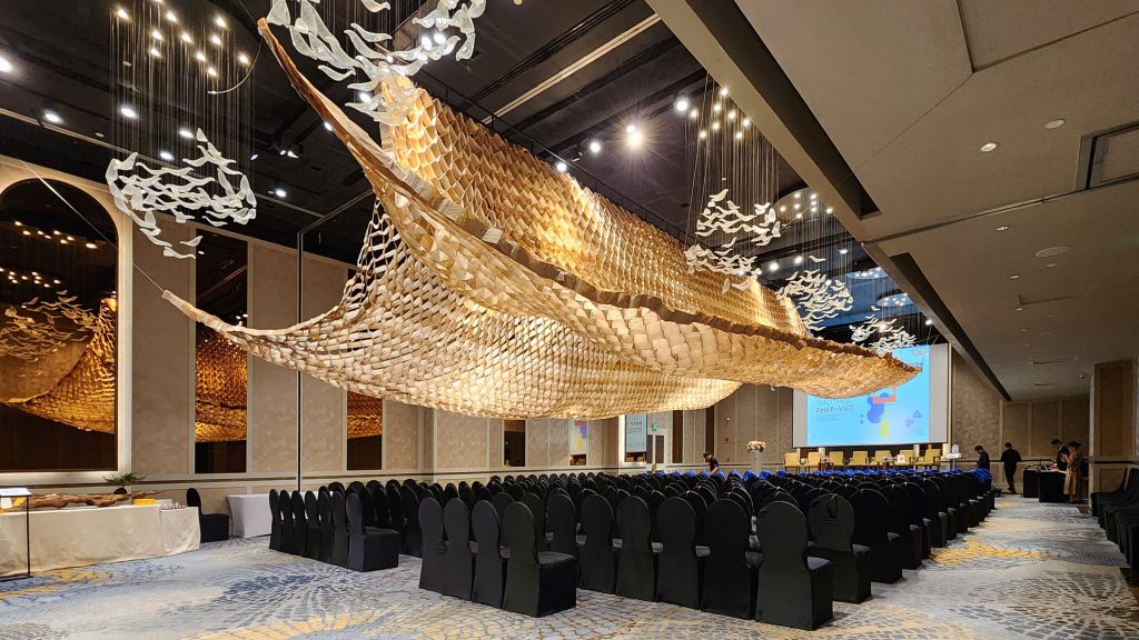 Trong không gian hội nghị của khách sạn Sofitel mang dấu ấn kiến trúc Pháp, LAM đề xuất một tác phẩm sắp đặt lấy cảm hứng từ mái đình làng – biểu tượng cho sự hội họp và kết nối cộng đồng trong văn hóa Việt. Hình ảnh này được sử dụng để định vị ước lệ khu vực hội thảo 250 khách, phản ánh tinh thần giao thoa văn hóa Pháp – Việt, chủ đề của hội thảo do Viện Pháp tại TP.HCM tổ chức. Mái đình là một dạng mái đặc trưng trong kiến trúc truyền thống Việt Nam, được hình thành từ điều kiện khí hậu, vùng miền và kỹ thuật xây dựng thủ công. Đặc điểm nhận diện gồm khối nhà thấp, mái viền dạng thuyền, góc mái cong tạo thành đầu đao. Cấu trúc lần này sử dụng lại vật liệu từ chuỗi workshop EVSDA. Hệ giấy bồi dài 60m từ dự án The Weaving Ring được cắt thành 3 đoạn, tổ hợp thành 2 khối mái lớn mang hình tượng mái đình. Nhờ trọng lượng nhẹ, cấu trúc có thể treo trực tiếp vào hệ kết cấu hiện trạng. Hình khối đơn giản, thi công trong vòng 6 tiếng. Đây là lần tái sử dụng thứ 4 của vật liệu. Việc tái cấu trúc liên tục giúp kéo dài vòng đời vật liệu và thích ứng linh hoạt với các ý tưởng thiết kế khác nhau.
