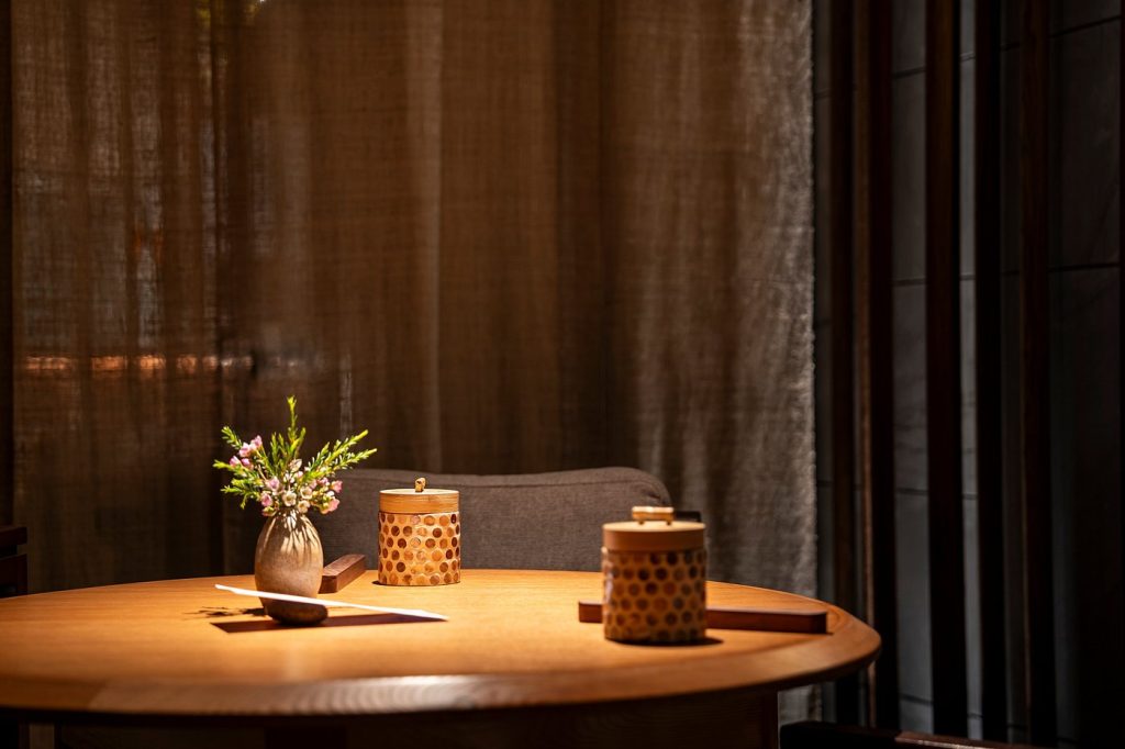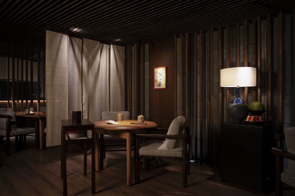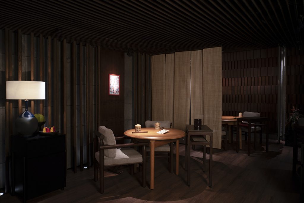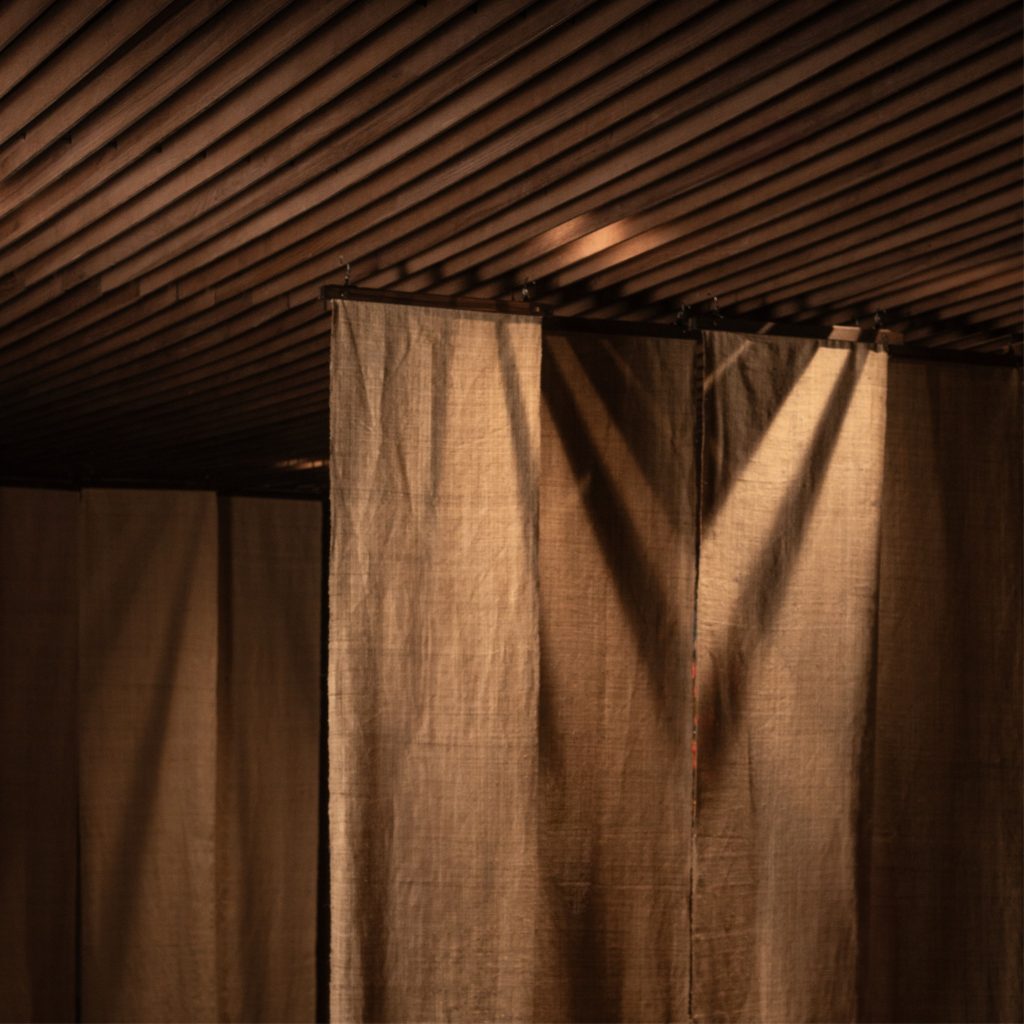 Hệ rèm được thiết kế như những vách ngăn nhẹ, tạo nên những khoảng không gian riêng tư vừa phải. Vật liệu có tính mộc, thủ công, hài hòa với bầu không khí chung mà kts muốn tạo nên. Vải gai dầu dệt thủ công được LAM tính toán gia công kỹ lưỡng để sử dụng được chất cảm của vật liệu. Một số khuyết điểm của vải cần được chú ý như biên vải thường không thẳng, vải dễ bị rút nhúm không phẳng, treo nhiều mảng dài gần nhau dễ rối do các biên vải không song song nhau… Vì vậy để đảm bảo được độ phẳng phiu và thẩm mỹ không gian cần khắc chế được những đặc điểm này.