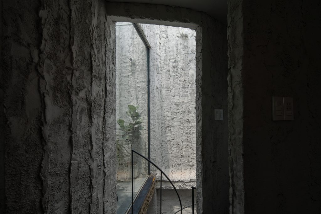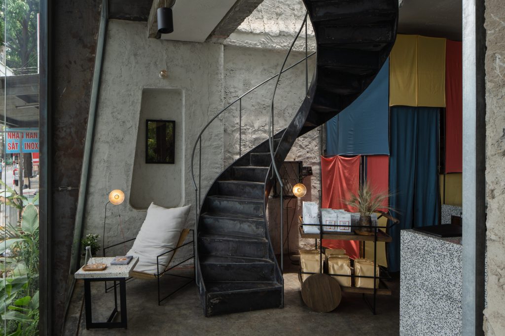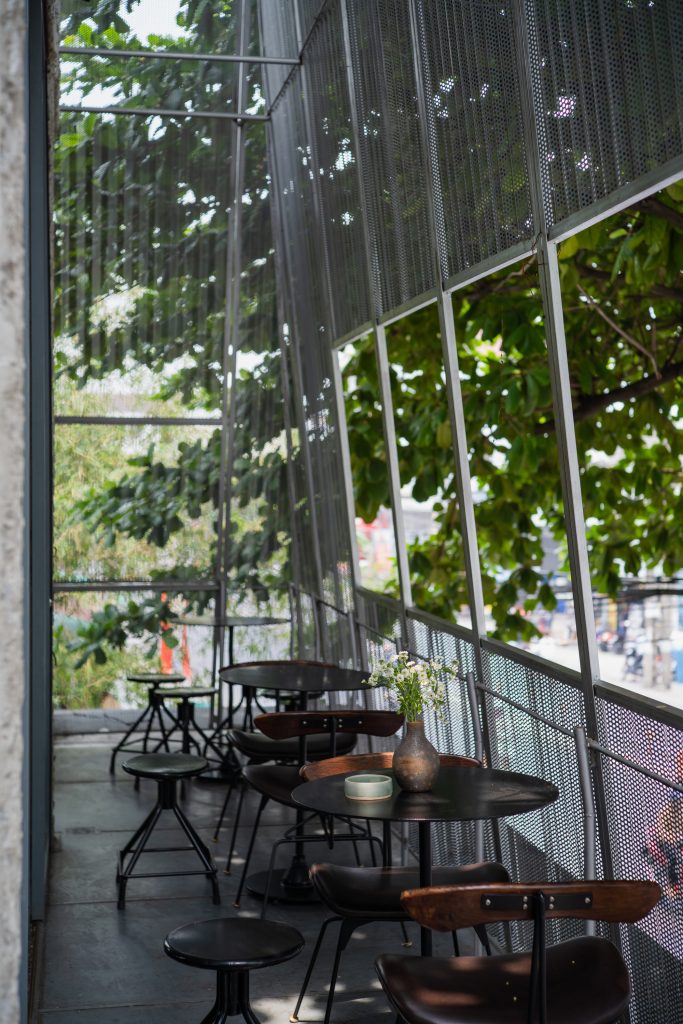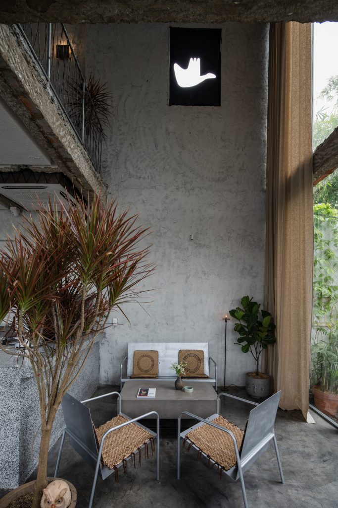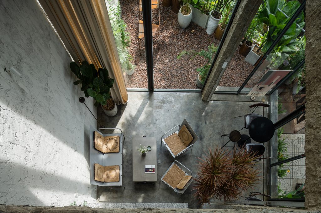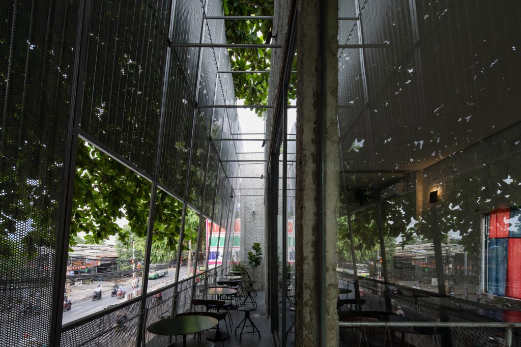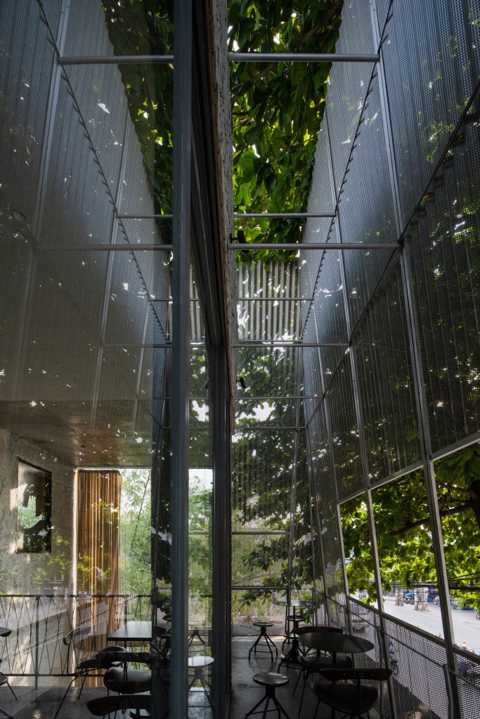 Mảng rèm kéo dài 2 tầng có kích thước: 6420 x 2830mm, sóng rèm tự do. Với kích thước lớn phải xử lý thêm các vấn đề phụ kiện phù hợp để chịu được khối lượng của rèm và kéo qua lại dễ dàng. Mảng rèm lớn tại vị trí chuyển tiếp không gian trong và ngoài nhà, được bố trí dọc theo các khung cửa kính lớn, cho phép điều chỉnh ánh sáng tự nhiên vào không gian một cách linh hoạt. Sự kết hợp giữa vật liệu thô của bê tông, mềm của vải, ánh sáng môi trường, cây xanh tạo ra không khí thú vị cho khu vực thông tầng này.