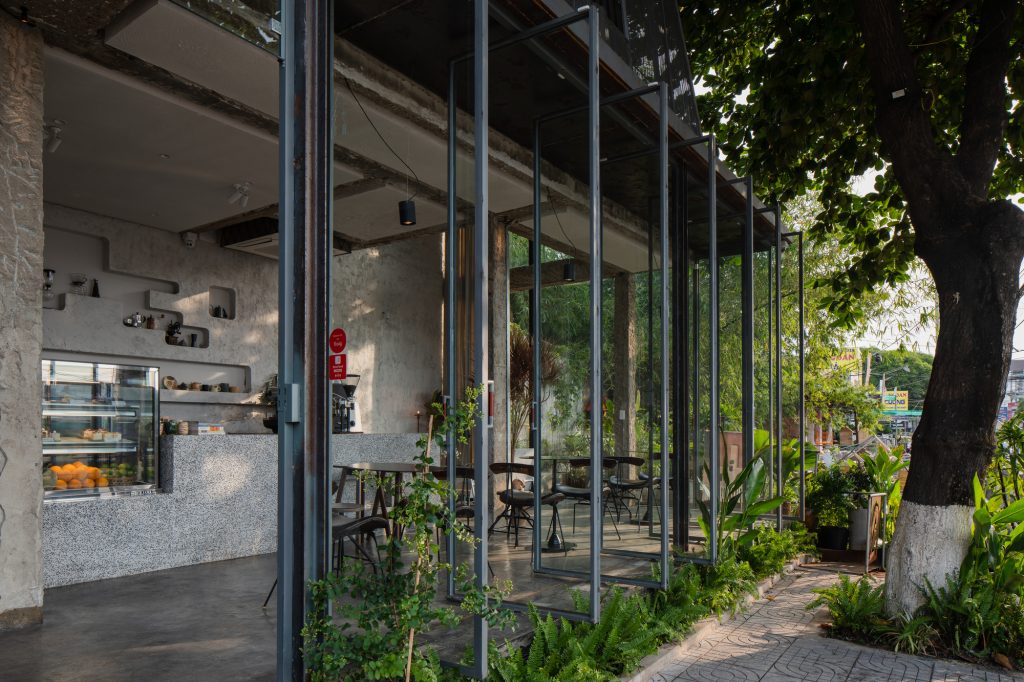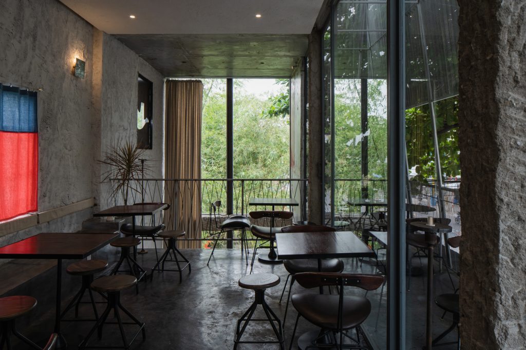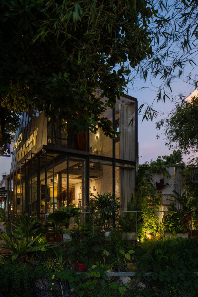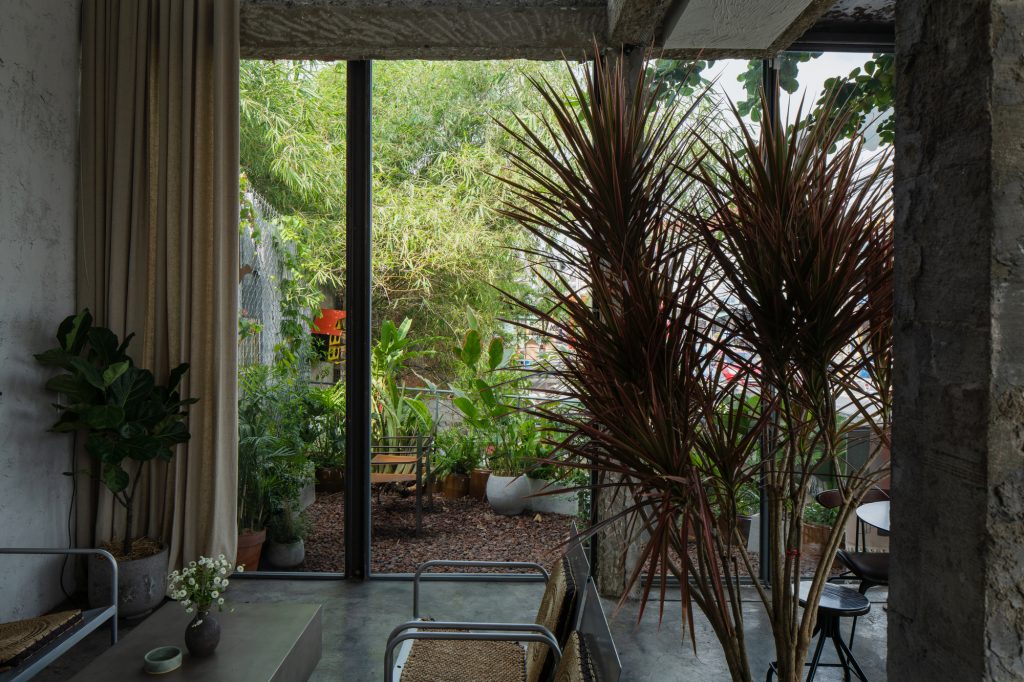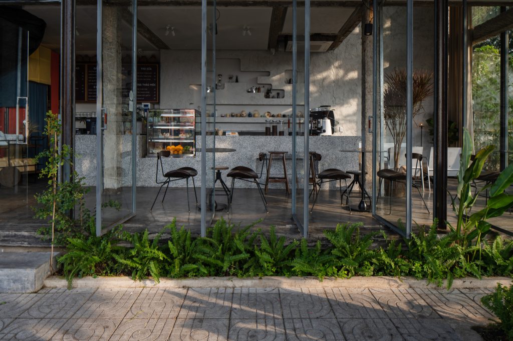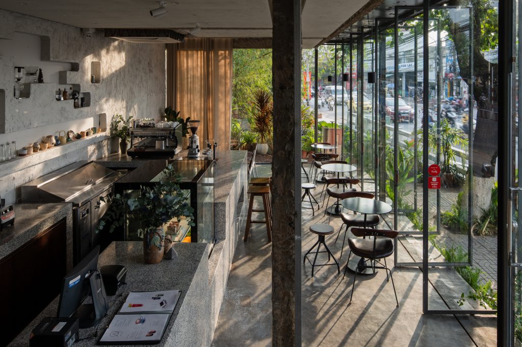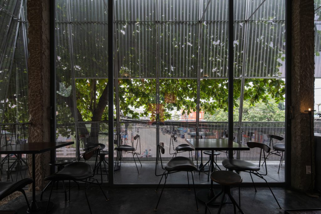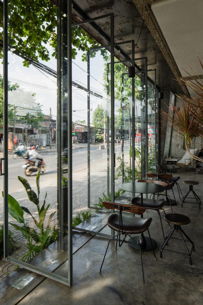 Mảng rèm kéo dài 2 tầng có kích thước: 6420 x 2830mm, sóng rèm tự do. Với kích thước lớn phải xử lý thêm các vấn đề phụ kiện phù hợp để chịu được khối lượng của rèm và kéo qua lại dễ dàng. Mảng rèm lớn tại vị trí chuyển tiếp không gian trong và ngoài nhà, được bố trí dọc theo các khung cửa kính lớn, cho phép điều chỉnh ánh sáng tự nhiên vào không gian một cách linh hoạt. Sự kết hợp giữa vật liệu thô của bê tông, mềm của vải, ánh sáng môi trường, cây xanh tạo ra không khí thú vị cho khu vực thông tầng này.