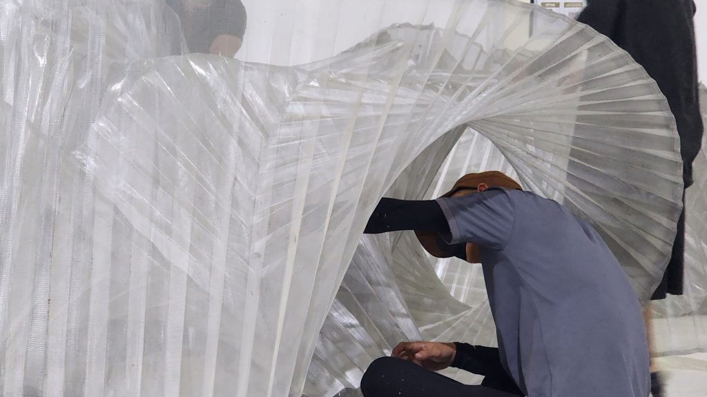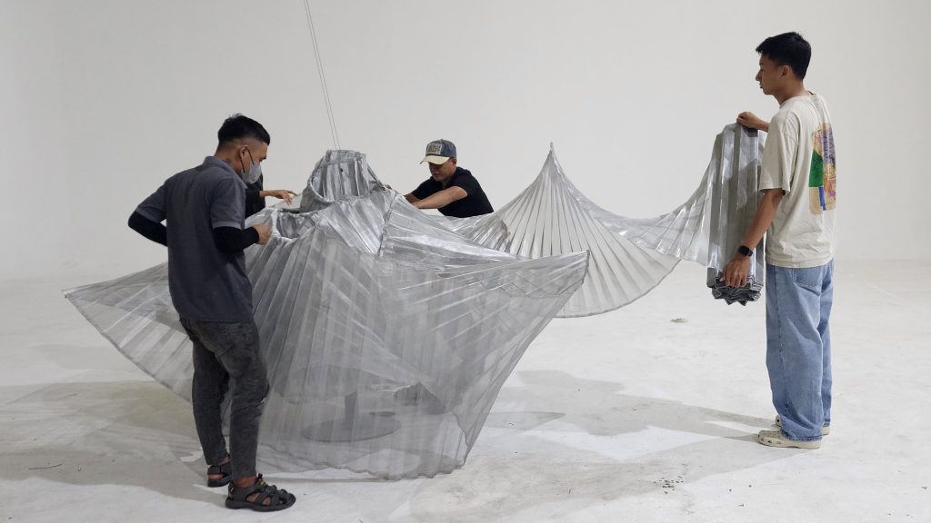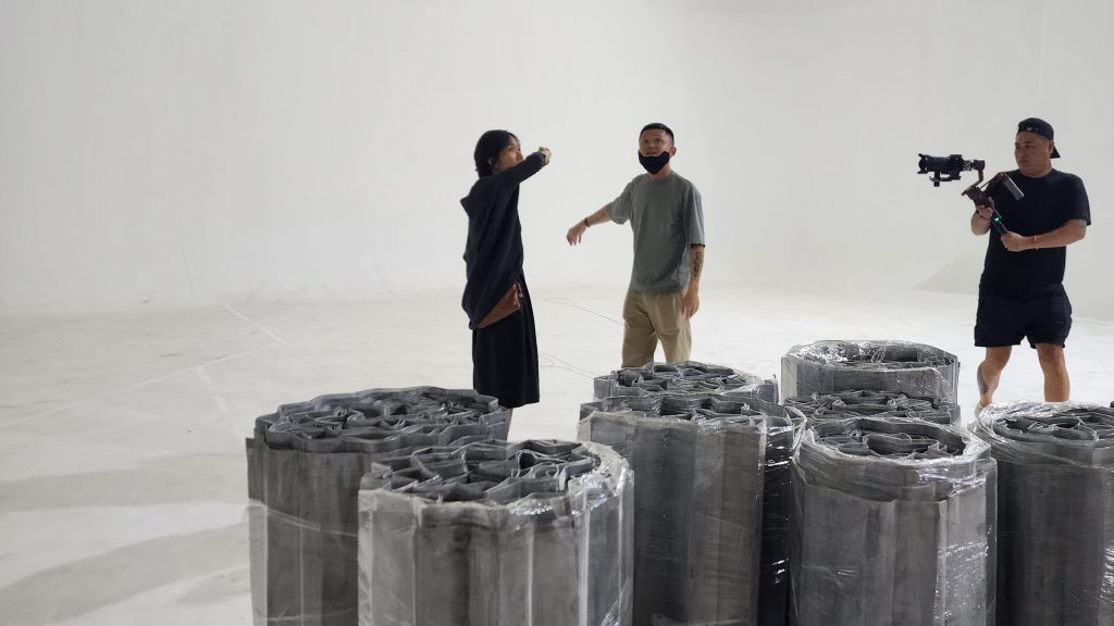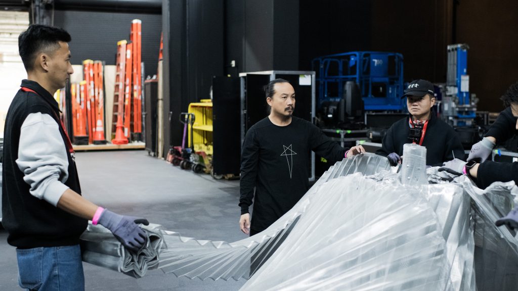 Artwork lần này là nét SKETCH A ROSE trong không trung. Cấu trúc đóa hồng được ‘vẽ lại’ bằng cấu trúc xoắn vặn được tính toán, thử nghiệm, sản xuất, xếp gọn đưa sang và ‘nở’ tại Mỹ. Từ phác thảo, mô hình, thử nghiệm đến lắp dựng trong không gian giả lập, ekip đã luyện tập kỹ năng triển khai và kiểm soát kỹ thuật từng bước. Vật liệu lưới thép, phụ kiện được chuẩn tại xưởng, 15 kiện hàng gọn gàng vượt nửa vòng trái đất để ‘nở’ thành một đóa hồng kim loại có đường kính hơn 6m, nặng 23kg. Những dải lụa dài 15m xoắn tựa vào nhau, lơ lửng trong không gian background sân khấu. Toàn bộ công việc được thực hiện thủ công tại hiện trường cùng đội ngũ kỹ thuật Dolby.