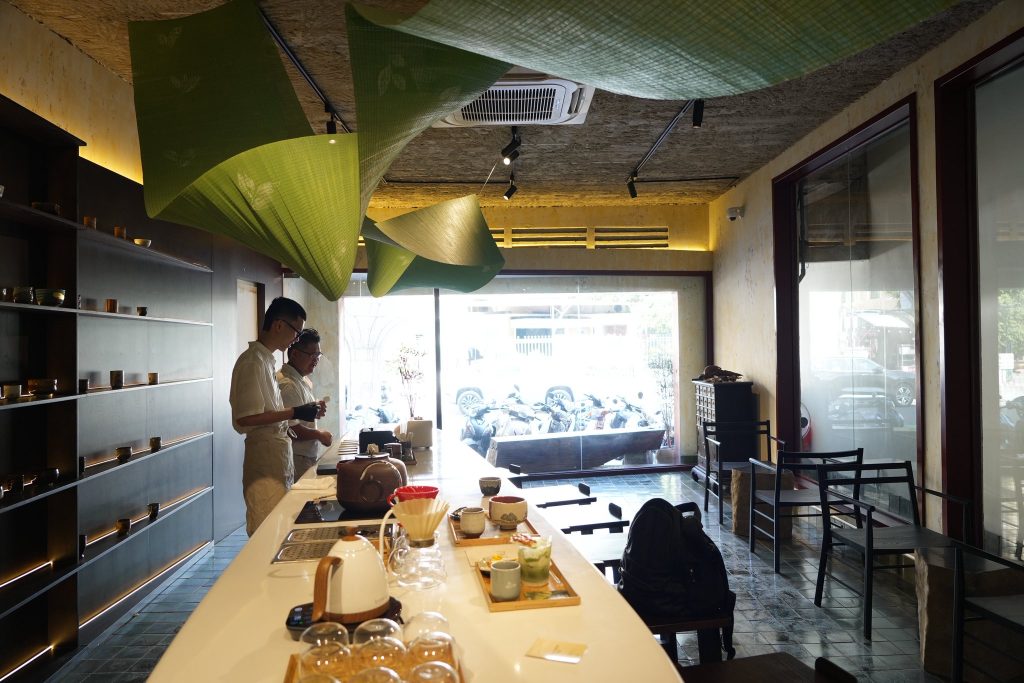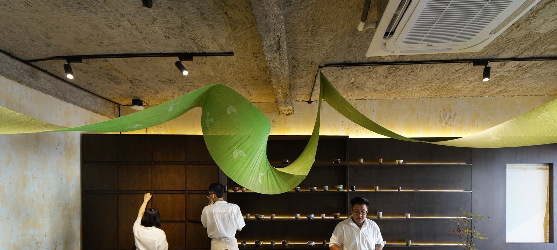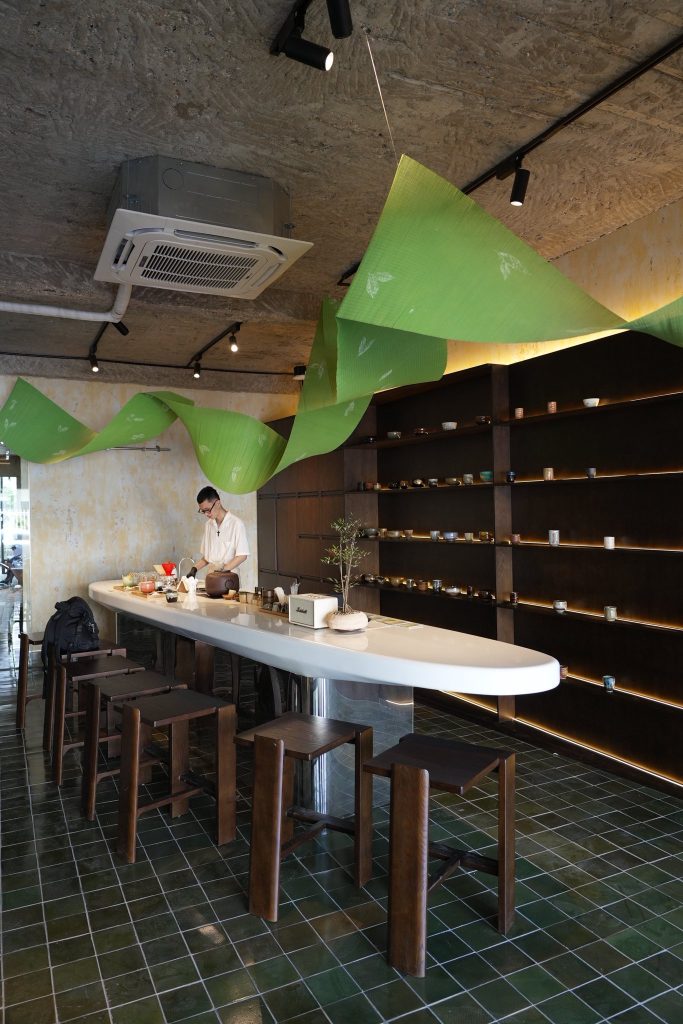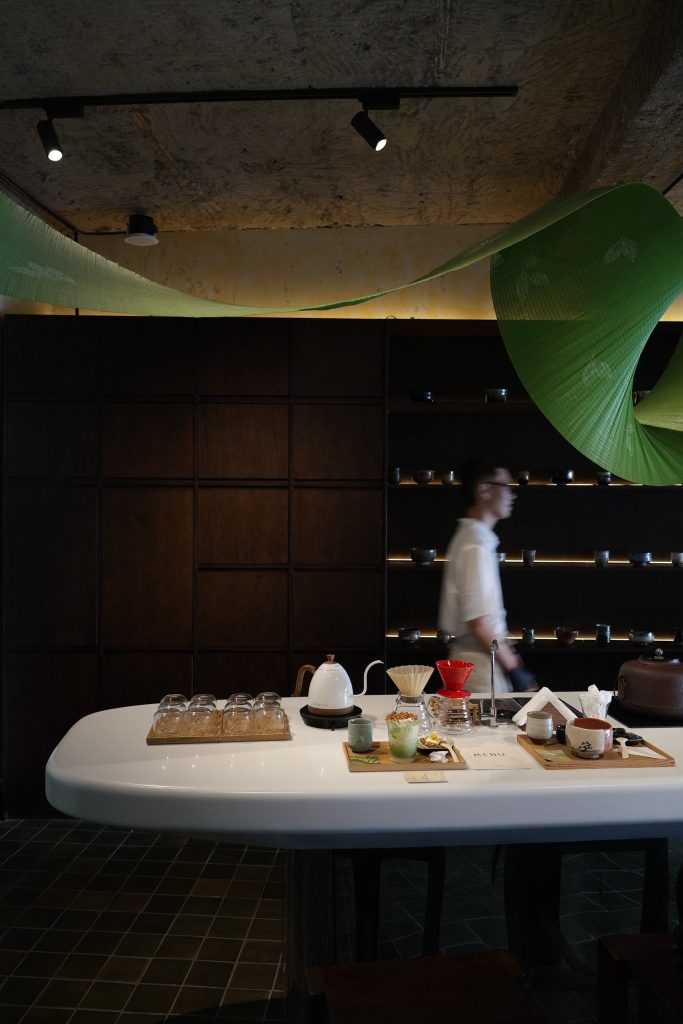 Matcha Flow là một dòng chảy mềm của vật liệu và cảm xúc, được tạo nên từ những tấm mành tre nhẹ, uốn lượn xuyên qua không gian như một dải lá đang chuyển động. Trên bề mặt mành, pattern đọt lá trà non được in thủ công, hiện lên mờ nhẹ như ký ức về một vùng nguyên liệu, vừa gần gũi vừa trừu tượng. Tác phẩm trải dài qua khu vực quầy bar chính và lan sang không gian đón tiếp, dẫn dắt ánh nhìn và nhịp di chuyển của khách như một dòng chảy liên tục. Không phô trương, Matcha Flow hiện diện như một lớp nền sống động, nơi vật liệu, ánh sáng và chuyển động cùng kể một câu chuyện về trà một cách tinh khiết, chậm rãi, và sâu.