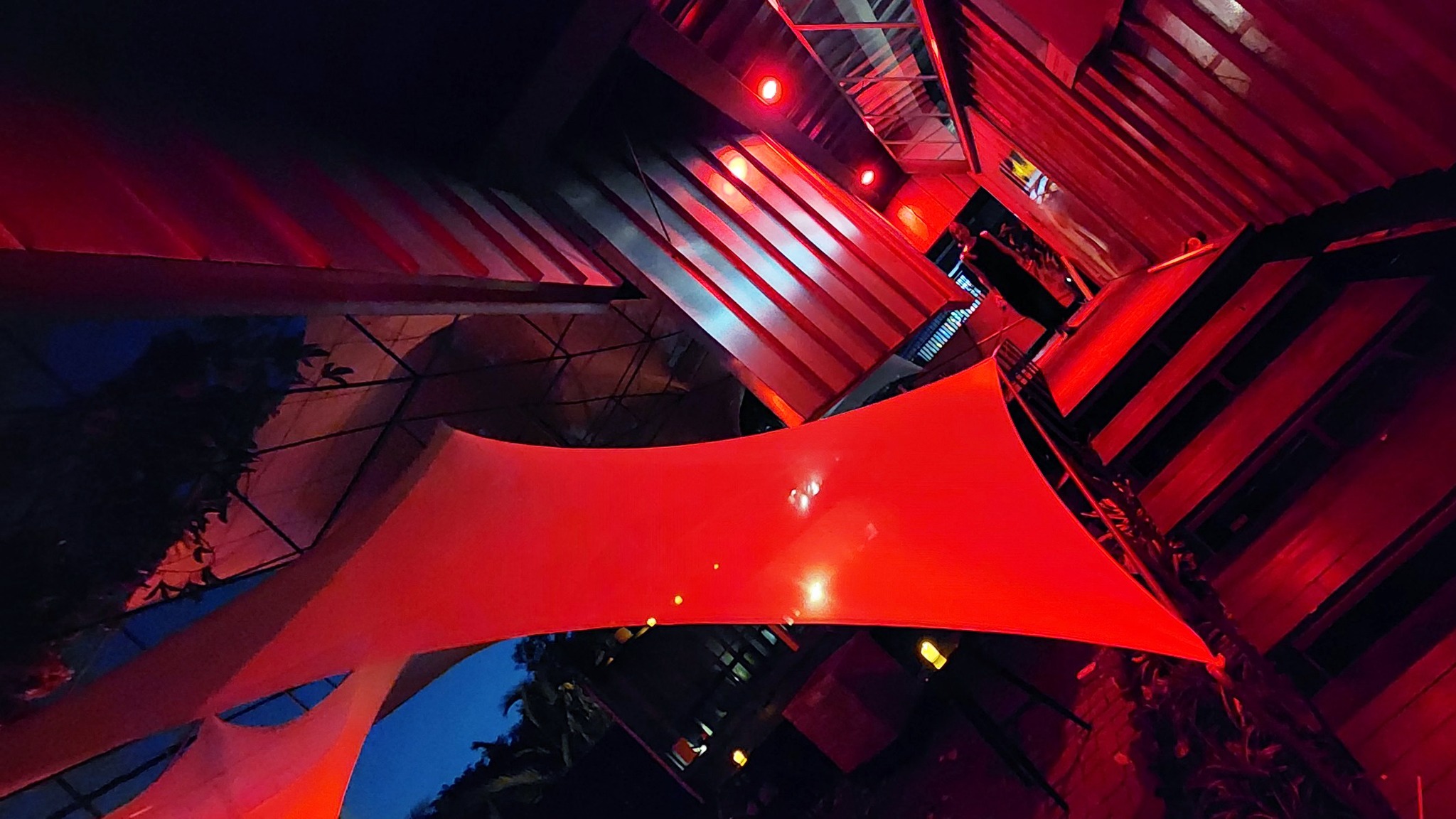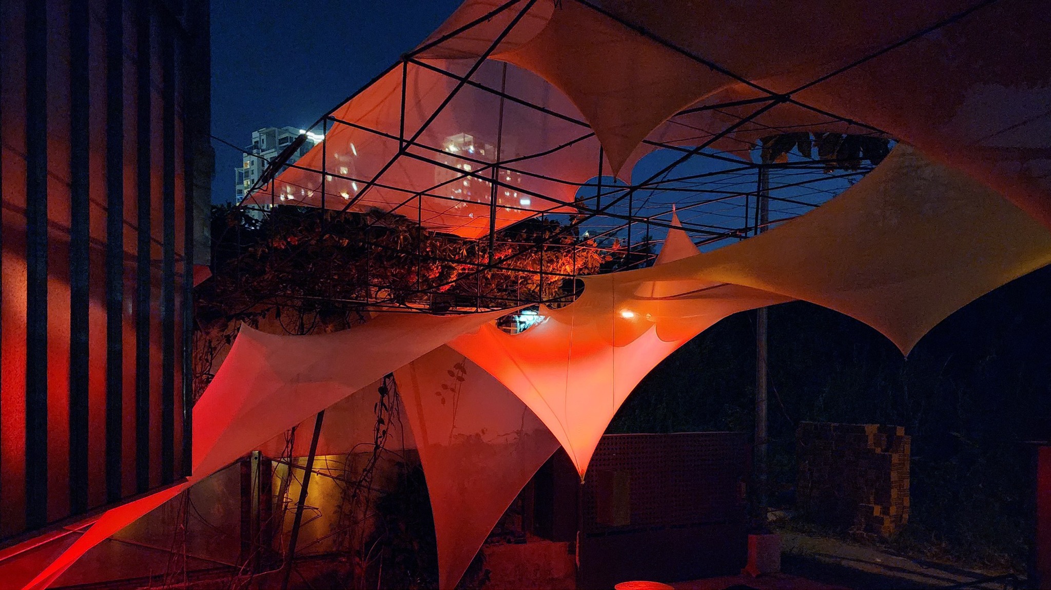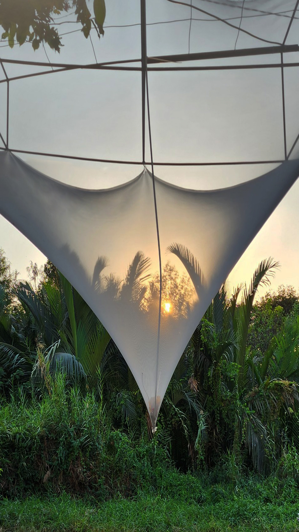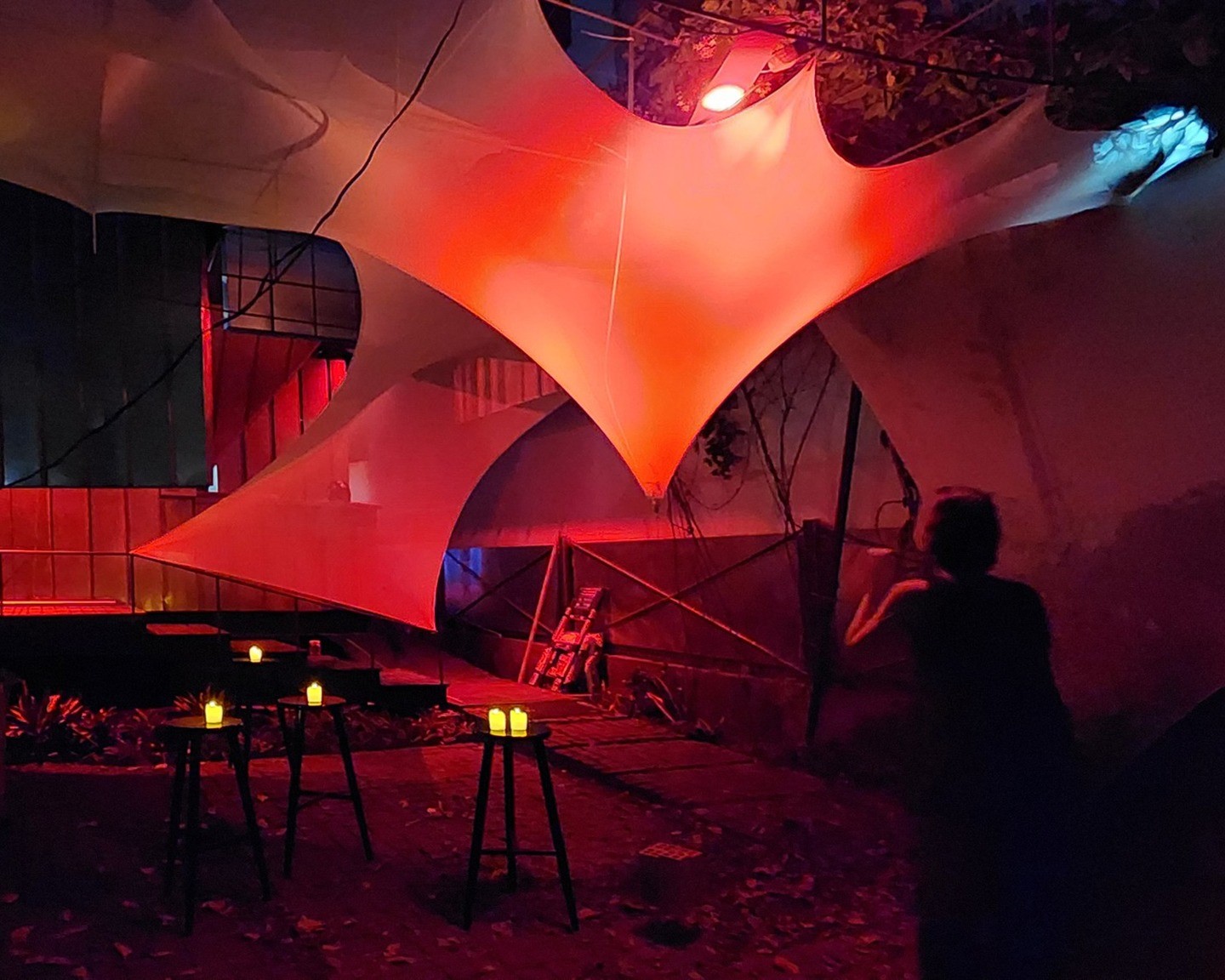 Sự phối hợp của ánh sáng và các lớp rèm trắng tinh khôi tạo nên một không gian lãng mạn, nhẹ nhàng vào ban ngày và huyền bí, nổi bật vào buổi tối khi ánh sáng màu đỏ chiếu rọi qua các lớp vải. Cách xử lý kỹ thuật khéo léo từ việc sử dụng chất liệu cho đến cách căng vải giúp hệ rèm trở thành điểm nhấn trong không gian tiệc ngoài trời, đồng thời tạo sự thoải mái và mang tính nghệ thuật cao.
