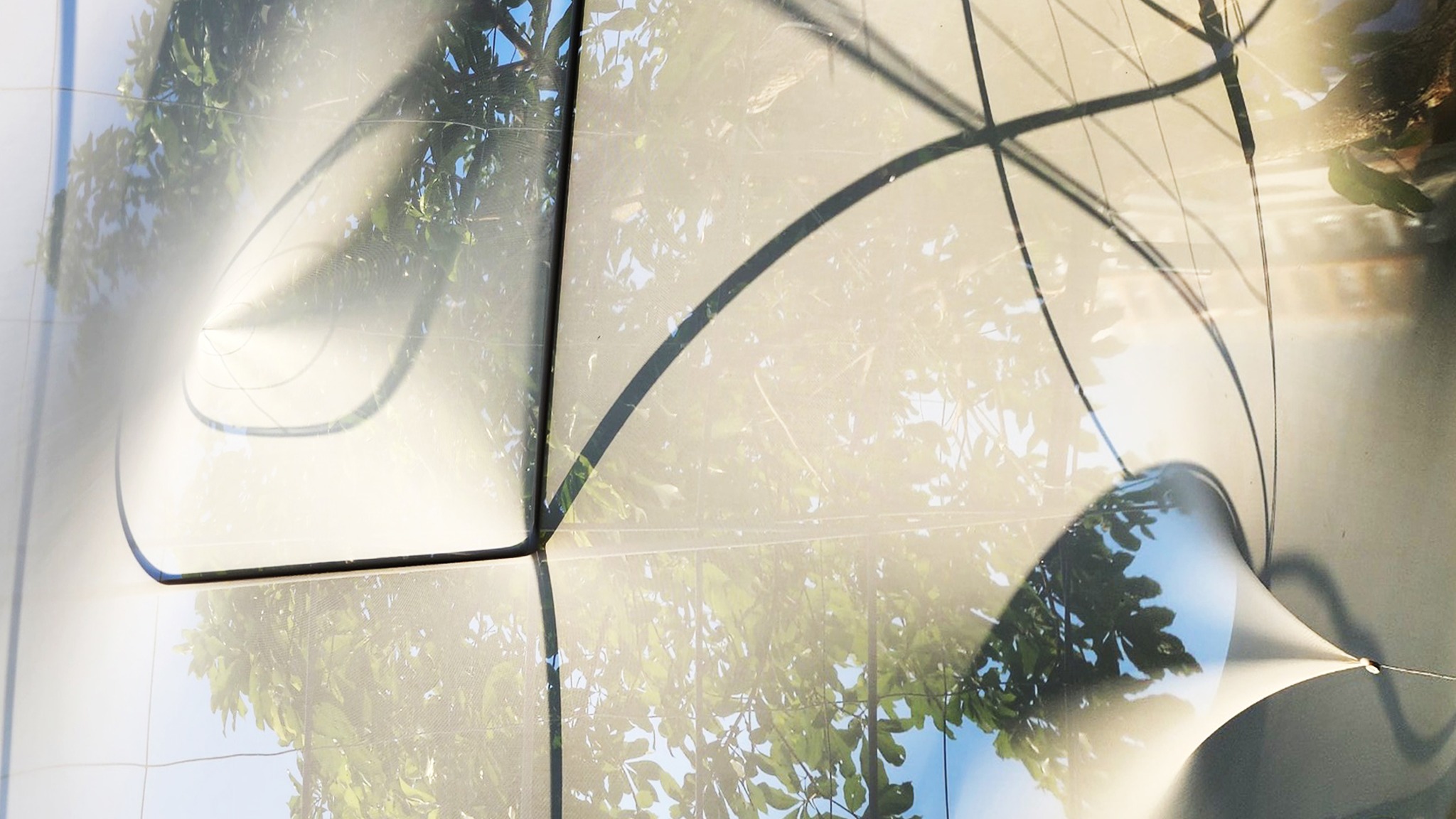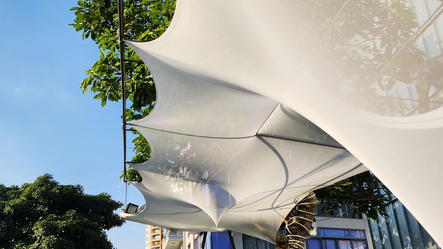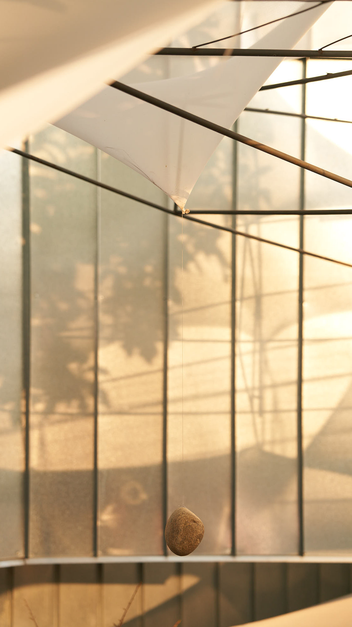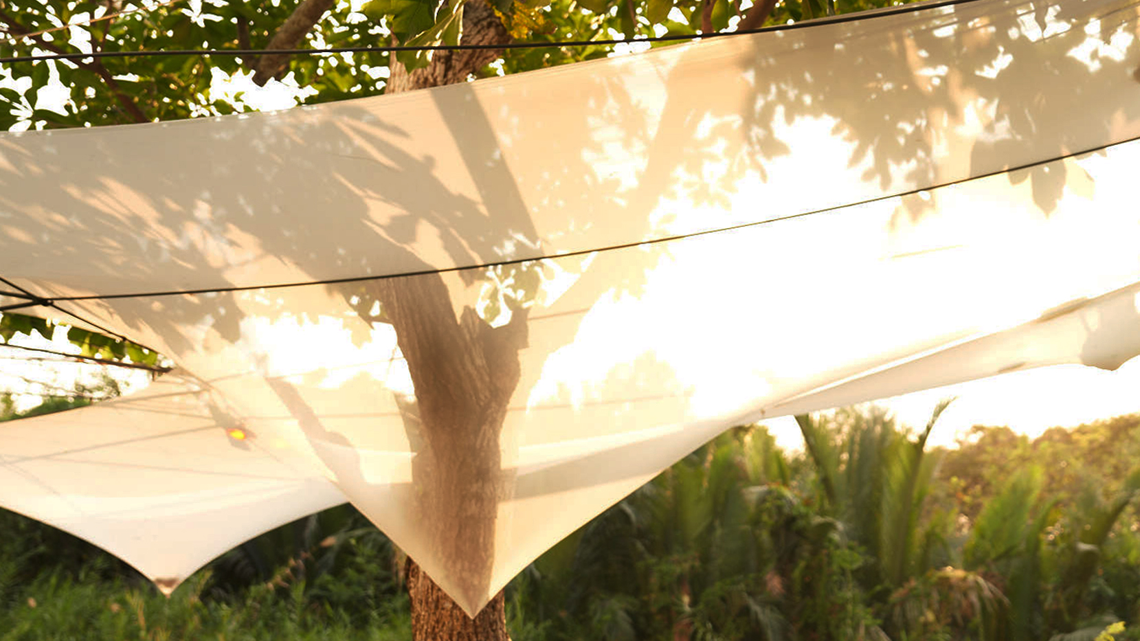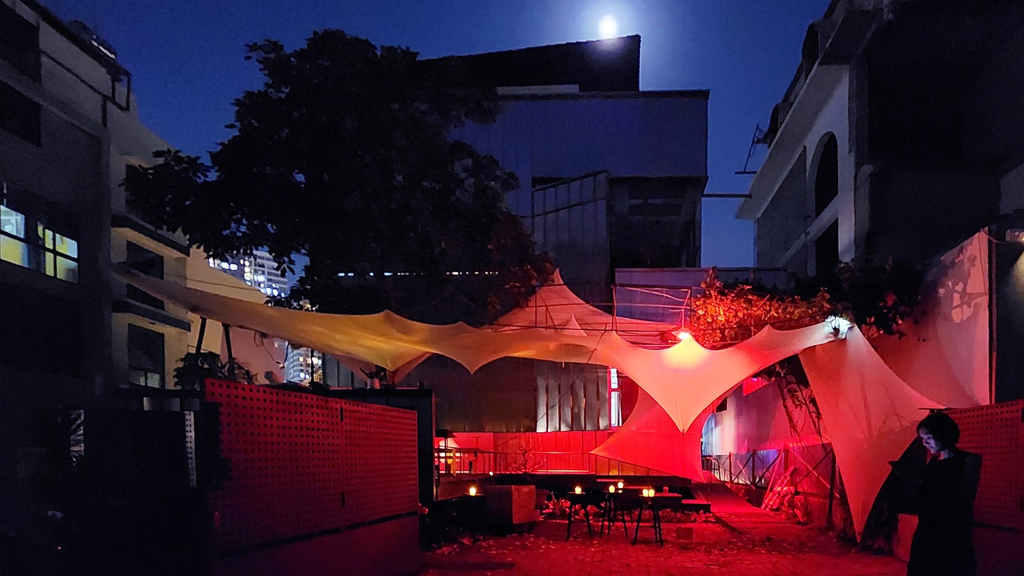 Sự phối hợp của ánh sáng và các lớp rèm trắng tinh khôi tạo nên một không gian lãng mạn, nhẹ nhàng vào ban ngày và huyền bí, nổi bật vào buổi tối khi ánh sáng màu đỏ chiếu rọi qua các lớp vải. Cách xử lý kỹ thuật khéo léo từ việc sử dụng chất liệu cho đến cách căng vải giúp hệ rèm trở thành điểm nhấn trong không gian tiệc ngoài trời, đồng thời tạo sự thoải mái và mang tính nghệ thuật cao.