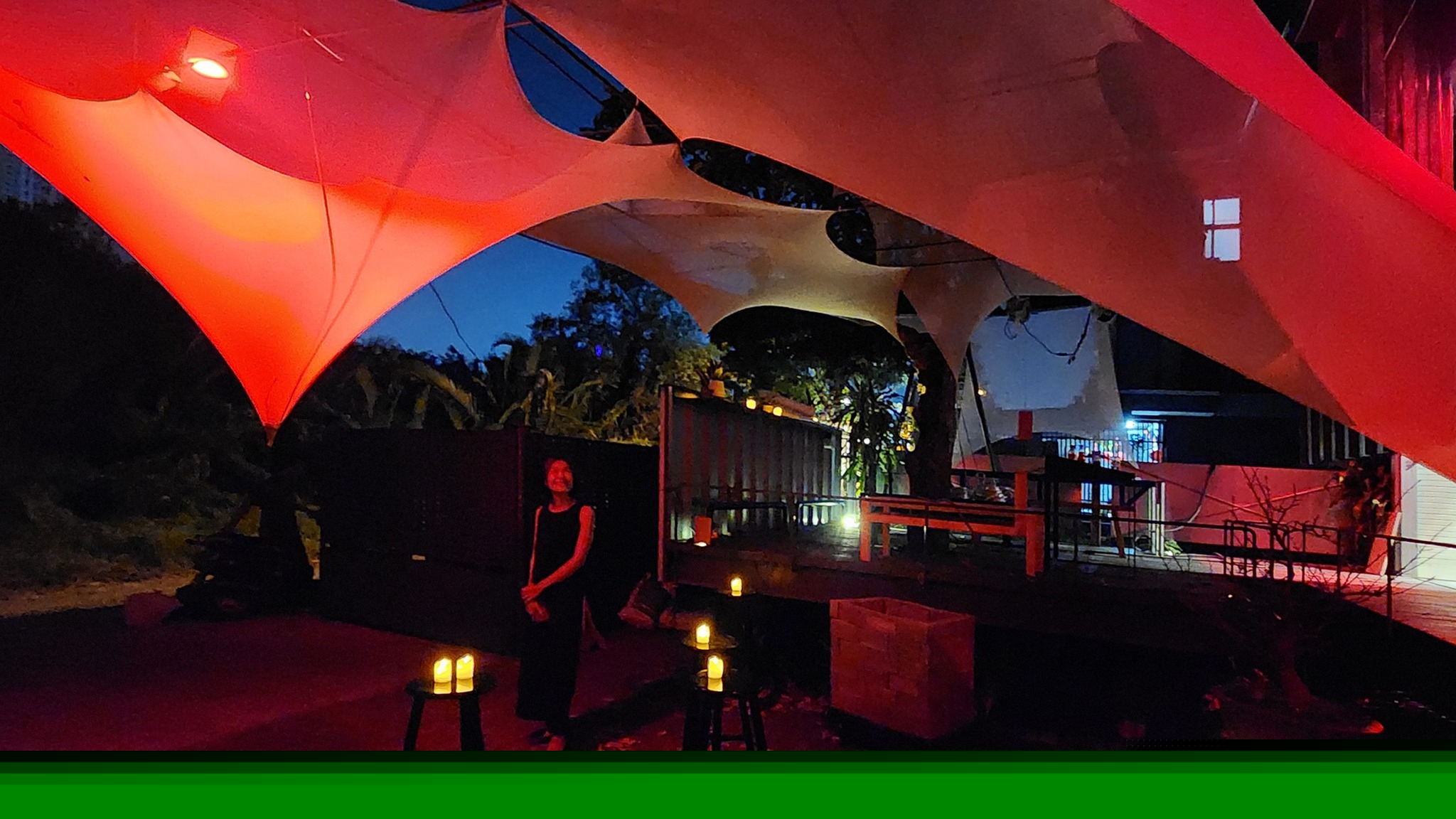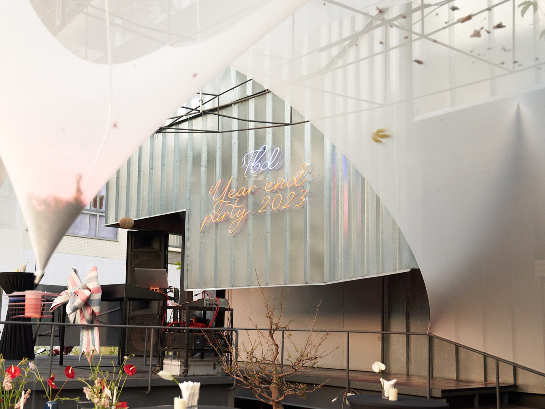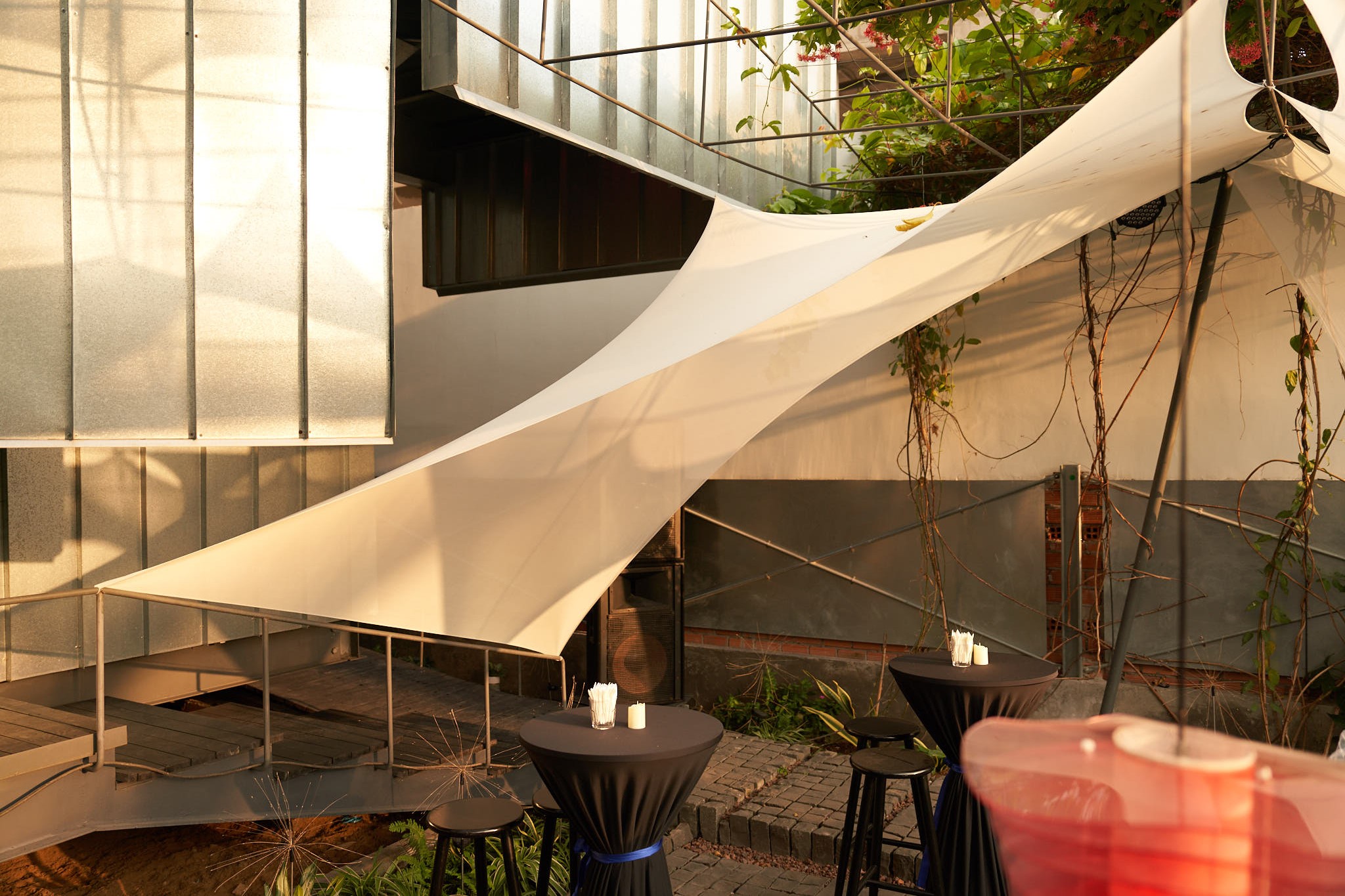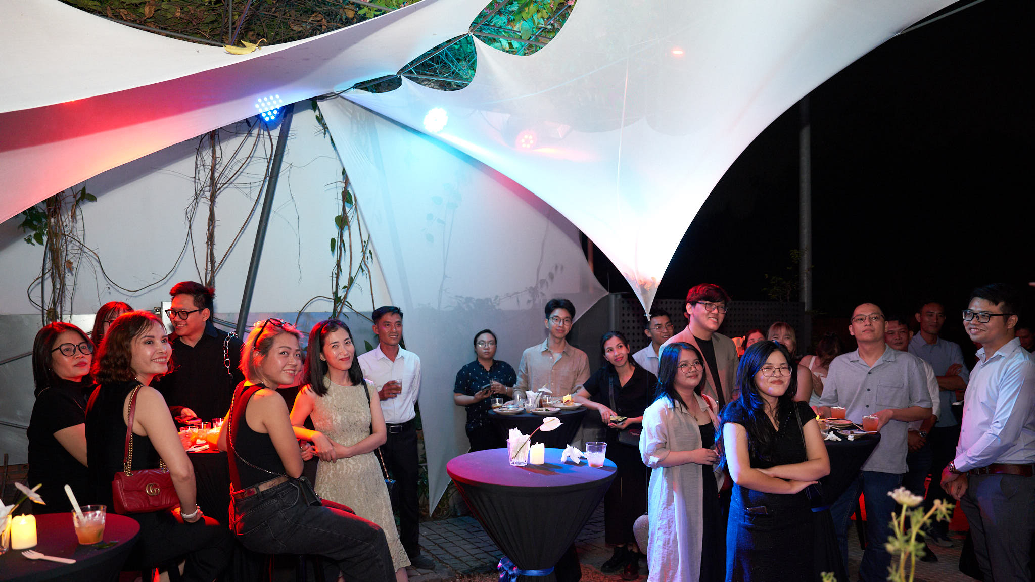 Hệ rèm trong buổi tiệc Year End Party được thiết kế bởi Lam Weaving Spaces mang một vẻ đẹp sáng tạo và hiện đại. Rèm được tạo thành từ các tấm vải căng, kết nối giữa các điểm treo cố định và linh hoạt, tạo ra những mảng vải căng lượn sóng mềm mại nhưng vẫn chắc chắn. Hệ rèm này không chỉ đóng vai trò trang trí mà còn có tác dụng tạo ra không gian phân chia một cách tự nhiên, giúp làm mềm các cạnh góc của không gian ngoài trời.