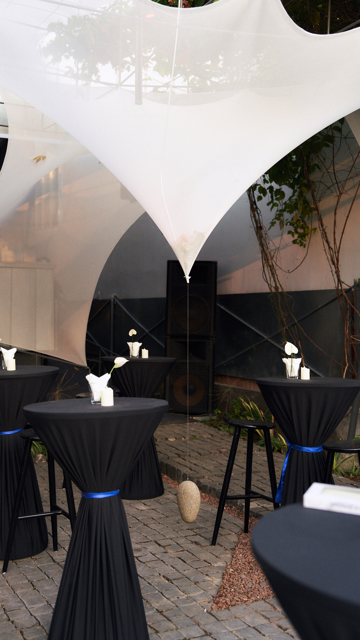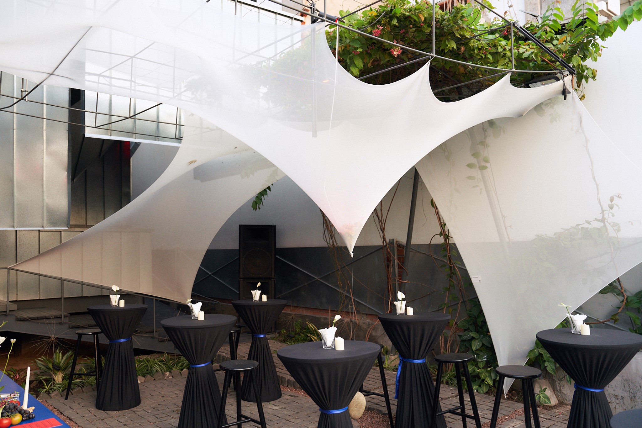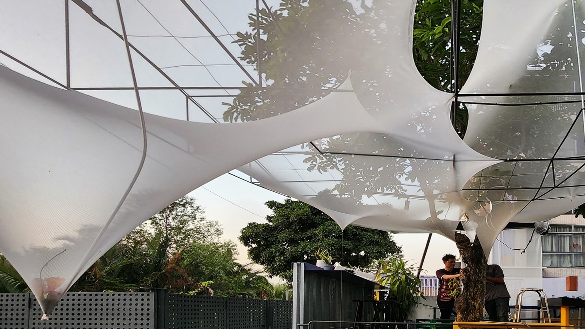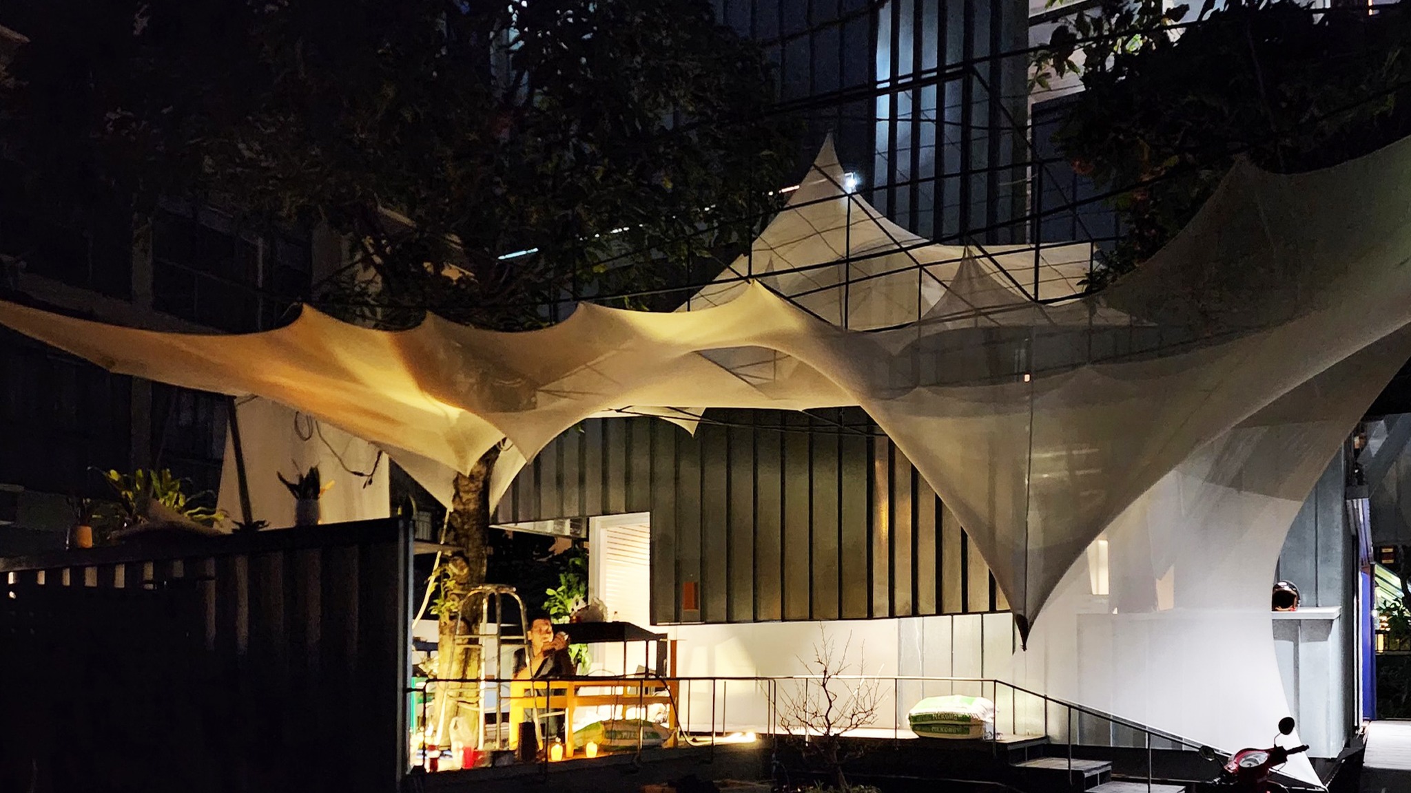 Hệ rèm trong buổi tiệc Year End Party được thiết kế bởi Lam Weaving Spaces mang một vẻ đẹp sáng tạo và hiện đại. Rèm được tạo thành từ các tấm vải căng, kết nối giữa các điểm treo cố định và linh hoạt, tạo ra những mảng vải căng lượn sóng mềm mại nhưng vẫn chắc chắn. Hệ rèm này không chỉ đóng vai trò trang trí mà còn có tác dụng tạo ra không gian phân chia một cách tự nhiên, giúp làm mềm các cạnh góc của không gian ngoài trời.