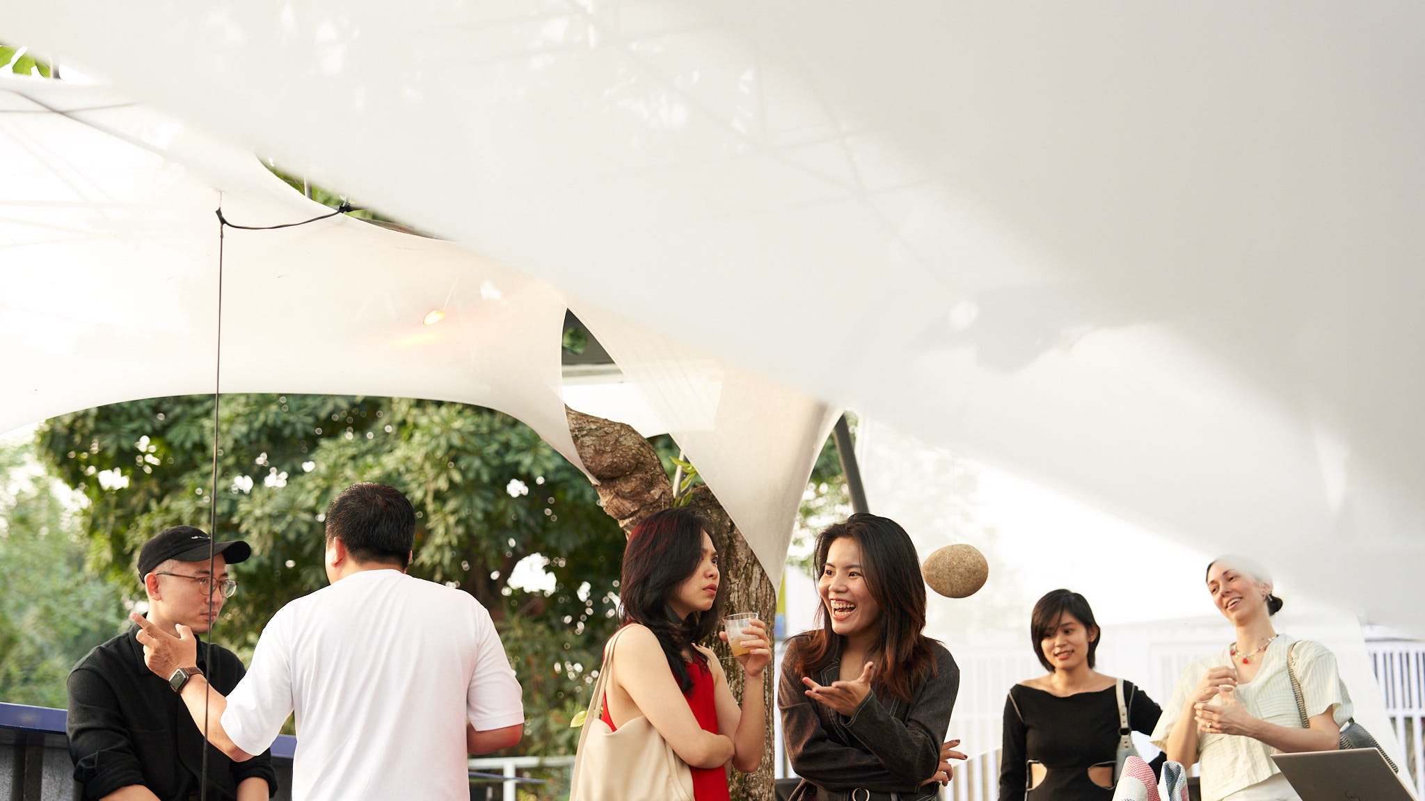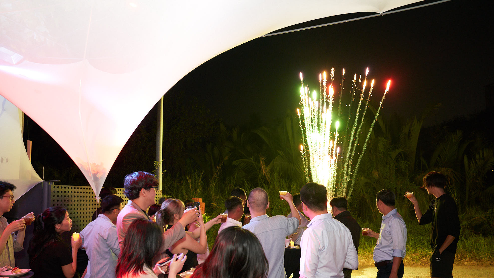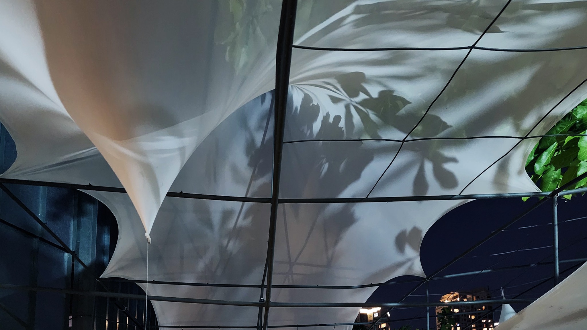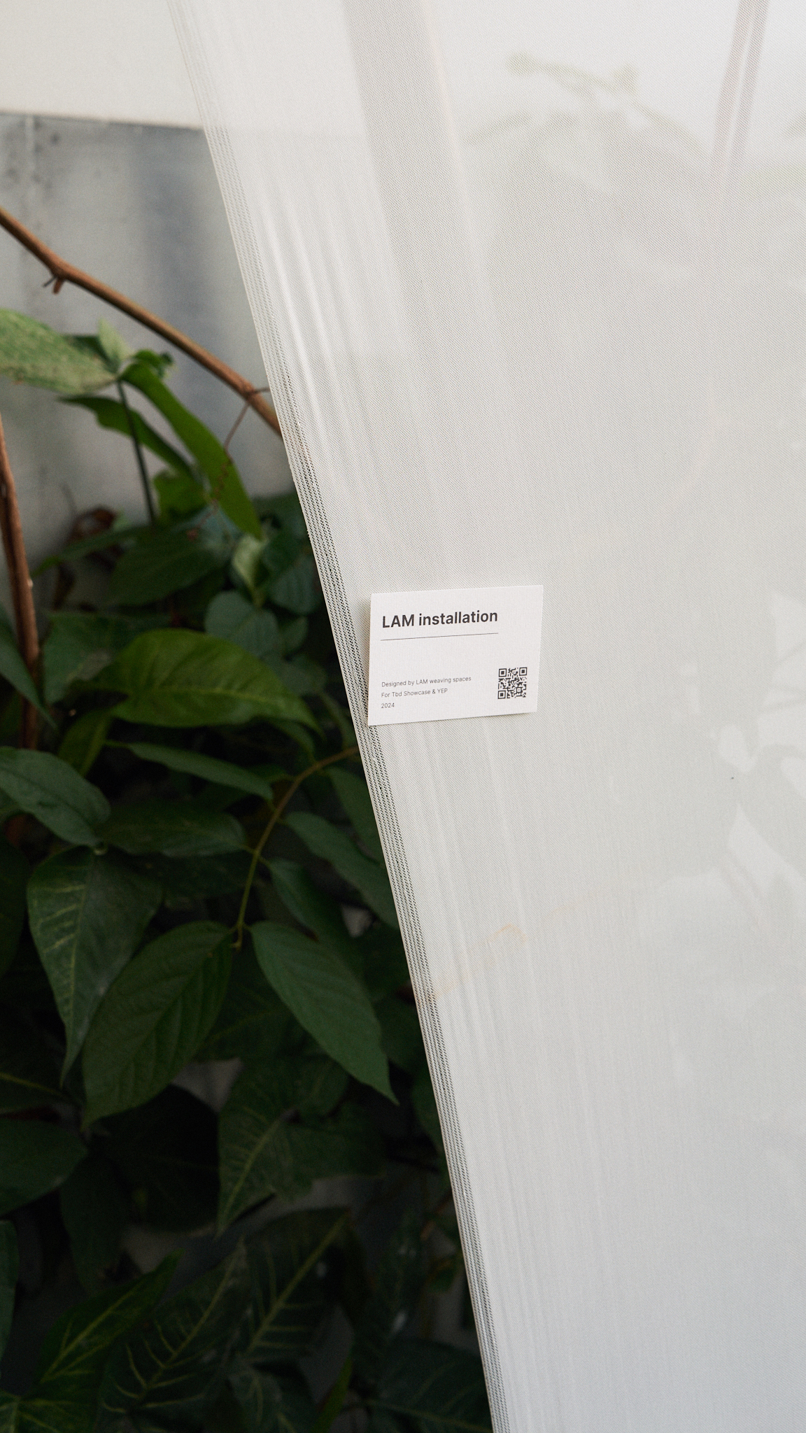Hệ rèm trong buổi tiệc Year End Party được thiết kế bởi Lam Weaving Spaces mang một vẻ đẹp sáng tạo và hiện đại. Rèm được tạo thành từ các tấm vải căng, kết nối giữa các điểm treo cố định và linh hoạt, tạo ra những mảng vải căng lượn sóng mềm mại nhưng vẫn chắc chắn. Hệ rèm này không chỉ đóng vai trò trang trí mà còn có tác dụng tạo ra không gian phân chia một cách tự nhiên, giúp làm mềm các cạnh góc của không gian ngoài trời.