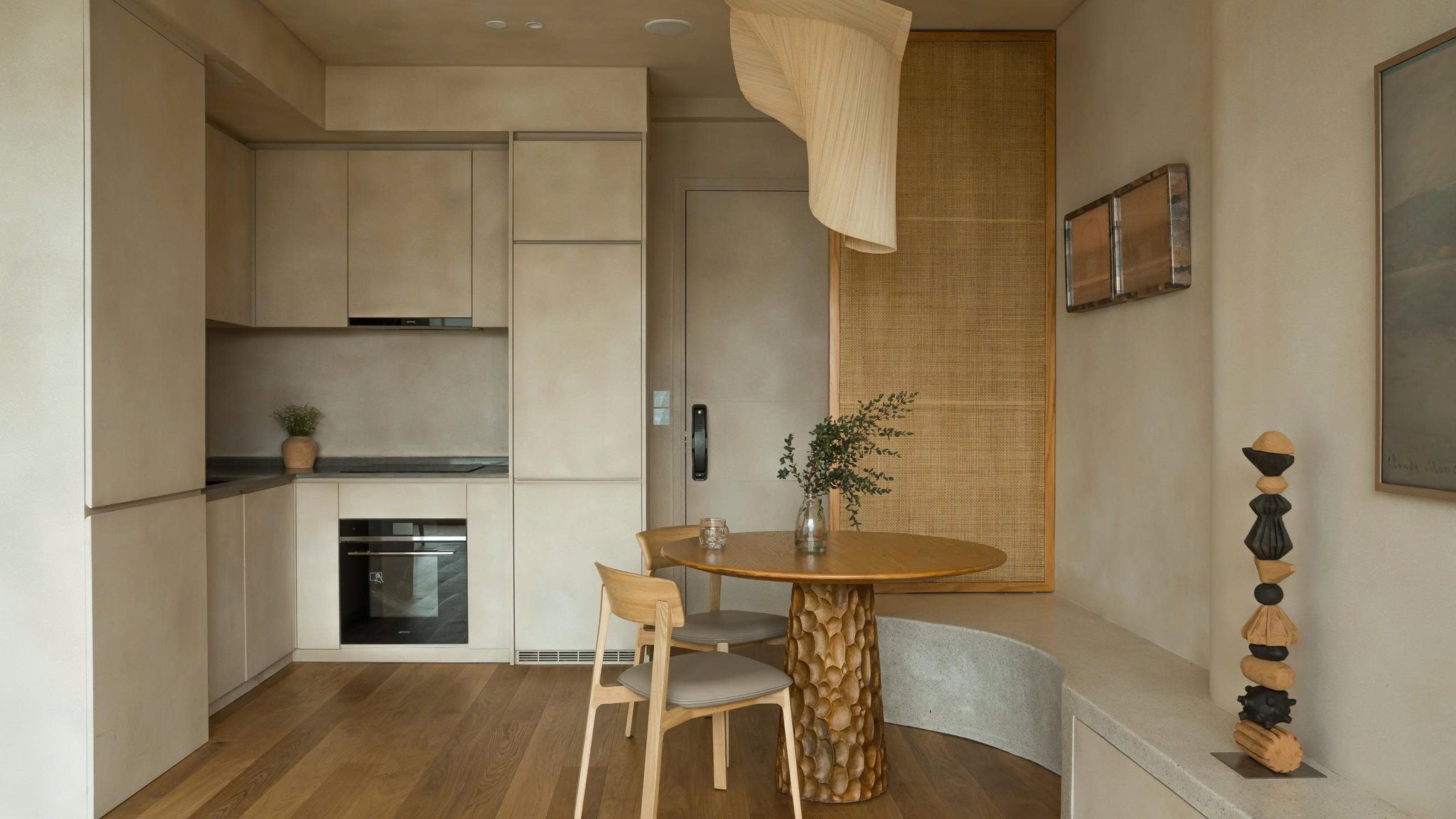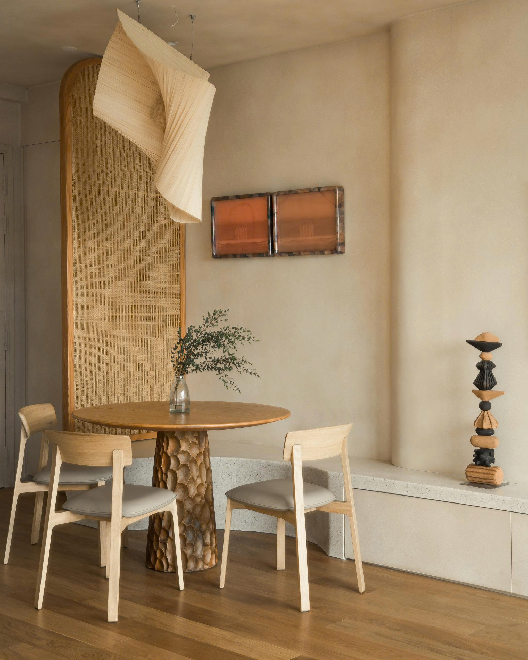 The Bamboo Screen Lamp serves as a refined focal point within the interior designed by architect Quốc Bình. The material, simple and familiar bamboo screens, is reinterpreted through LAM’s handling to create a soft and unexpected visual effect with a sense of movement. This result comes from a long process of engaging with the material, understanding its structure, and applying precise, decisive gestures of folding and twisting.