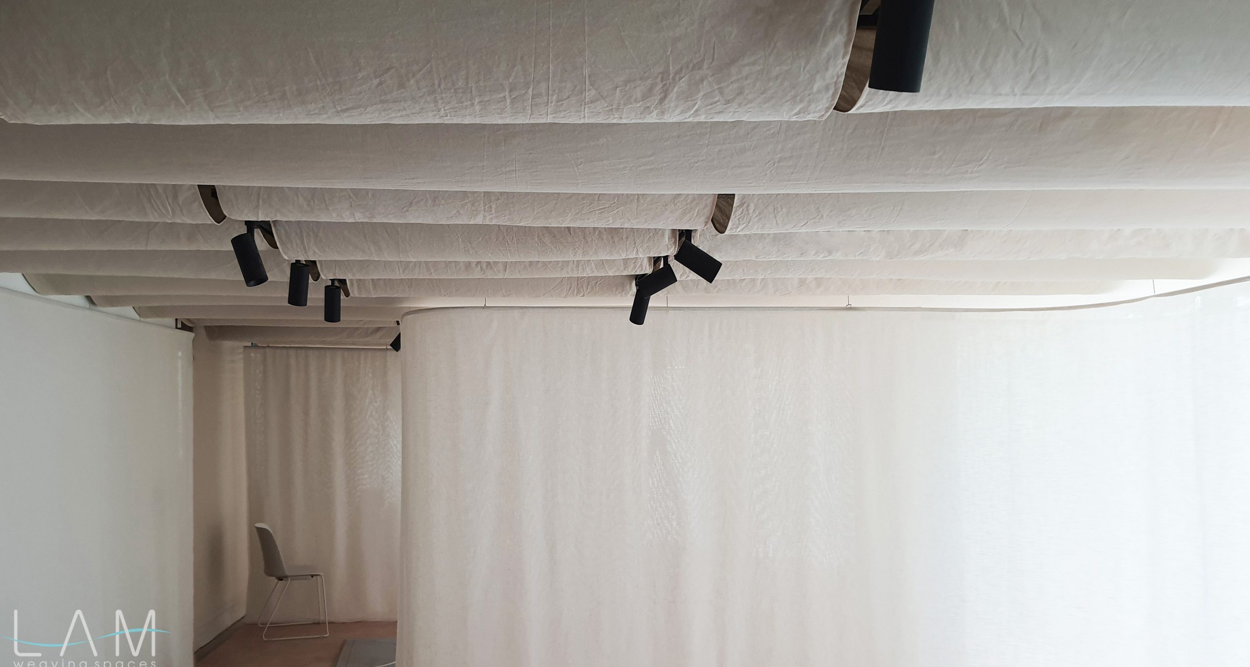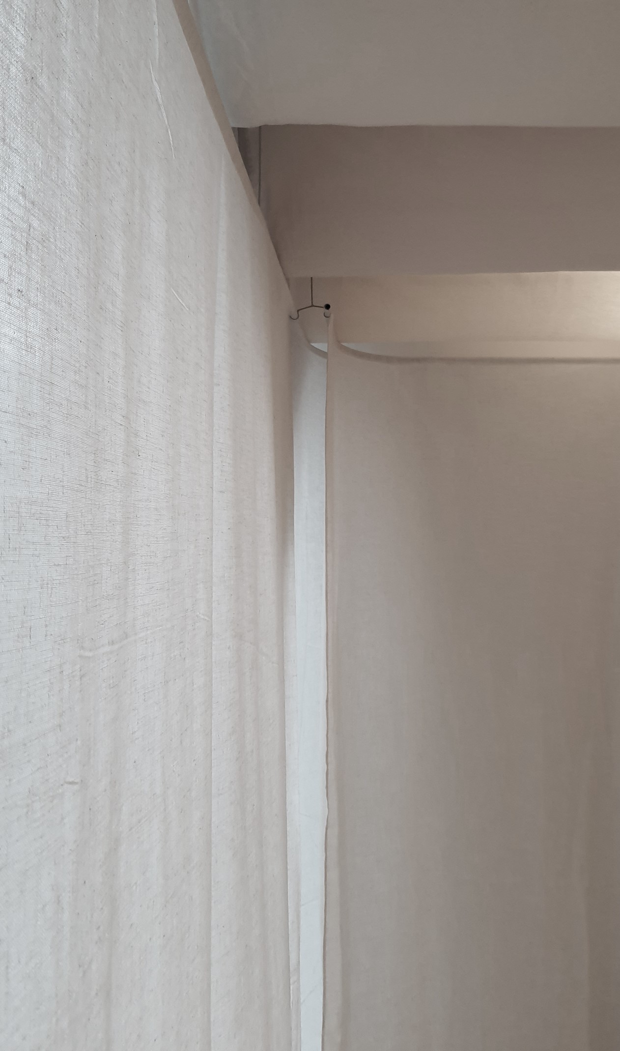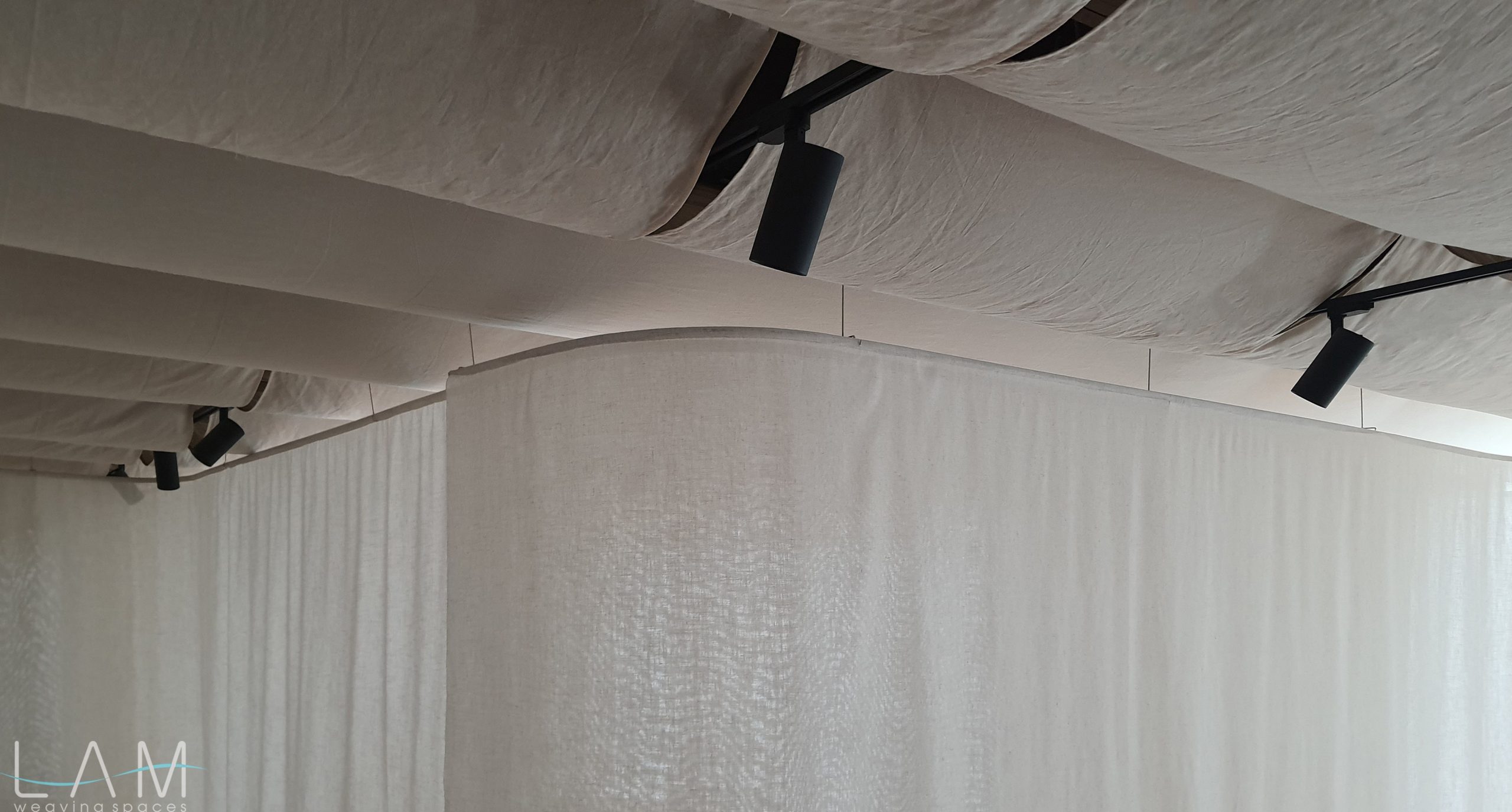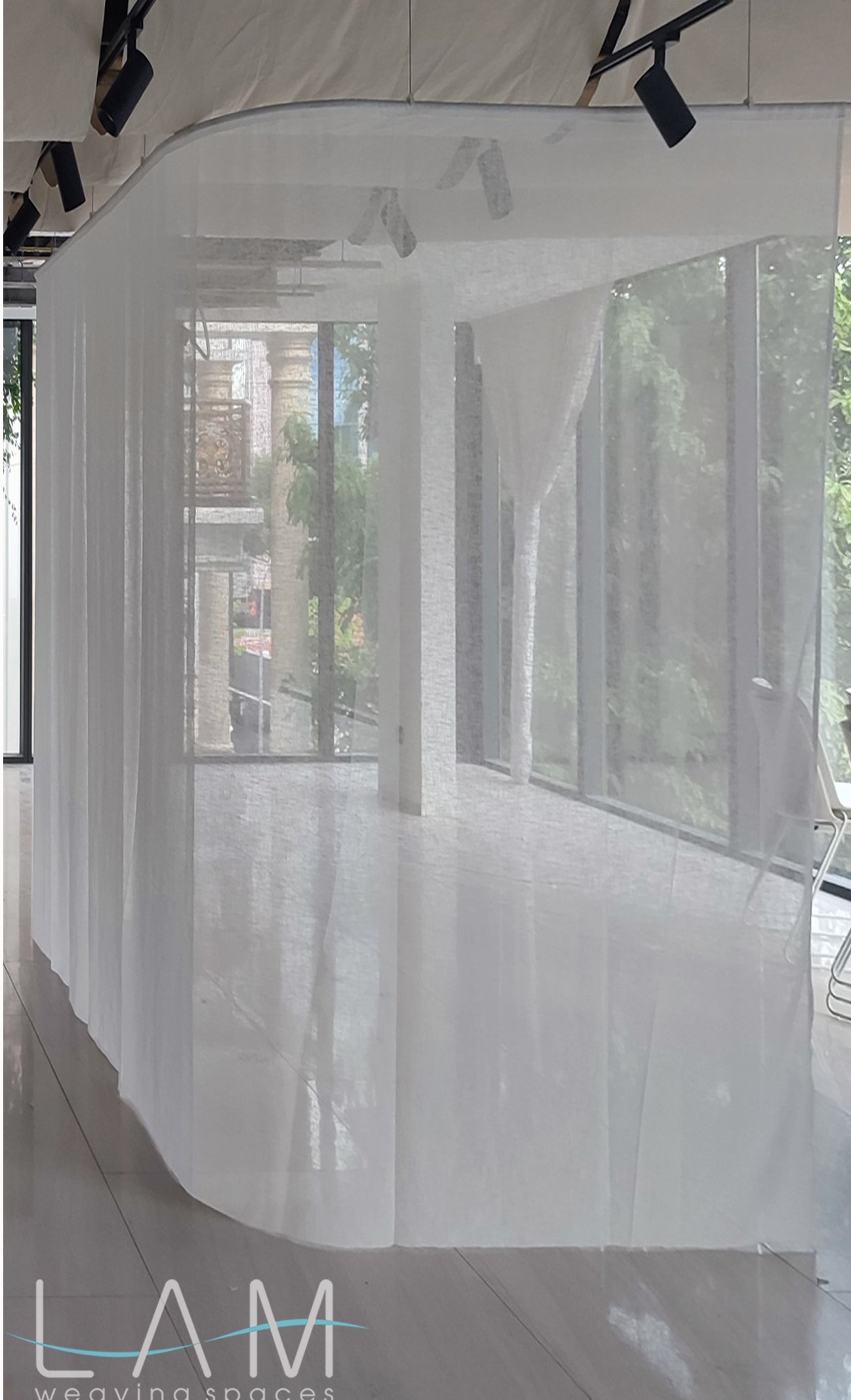 The mobile partition curtains are made of natural fabric, which is breathable and lightweight, allowing easy movement to adjust the space as needed. The simple yet effective design, combined with a flexible rail system, enables open or closed spaces to be adjusted according to the user’s requirements. The translucent quality of the curtains subtly divides the space without compromising its openness.