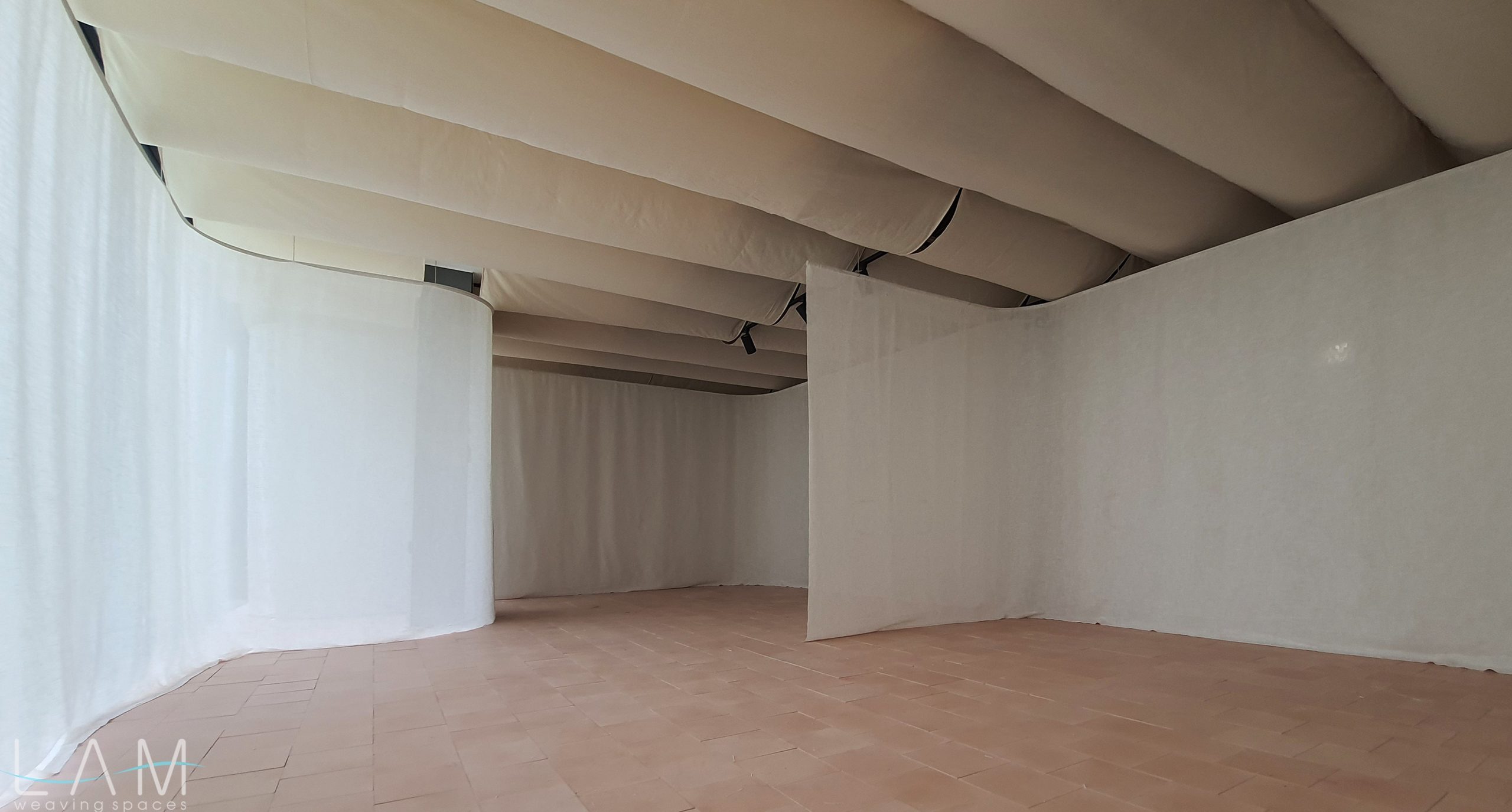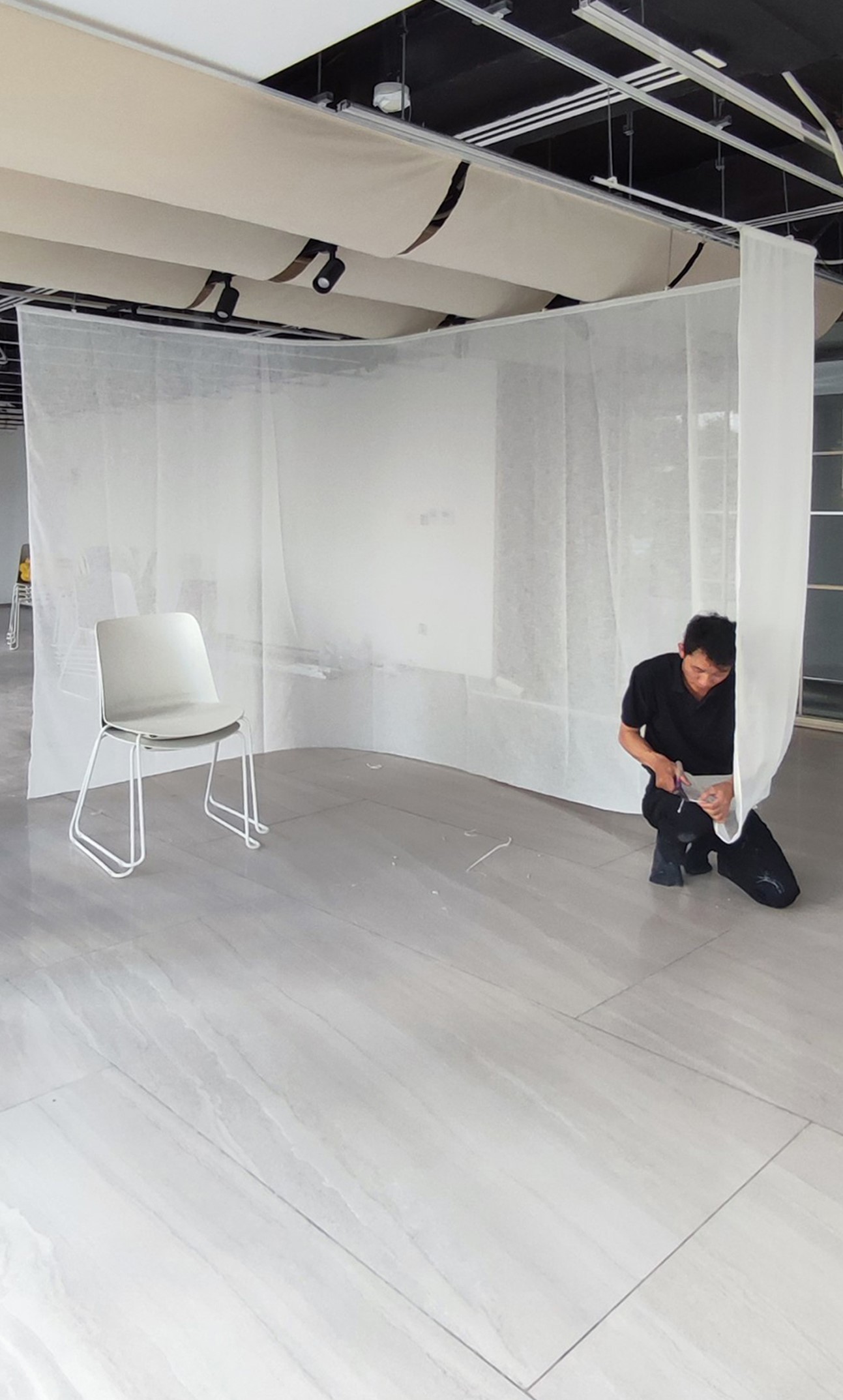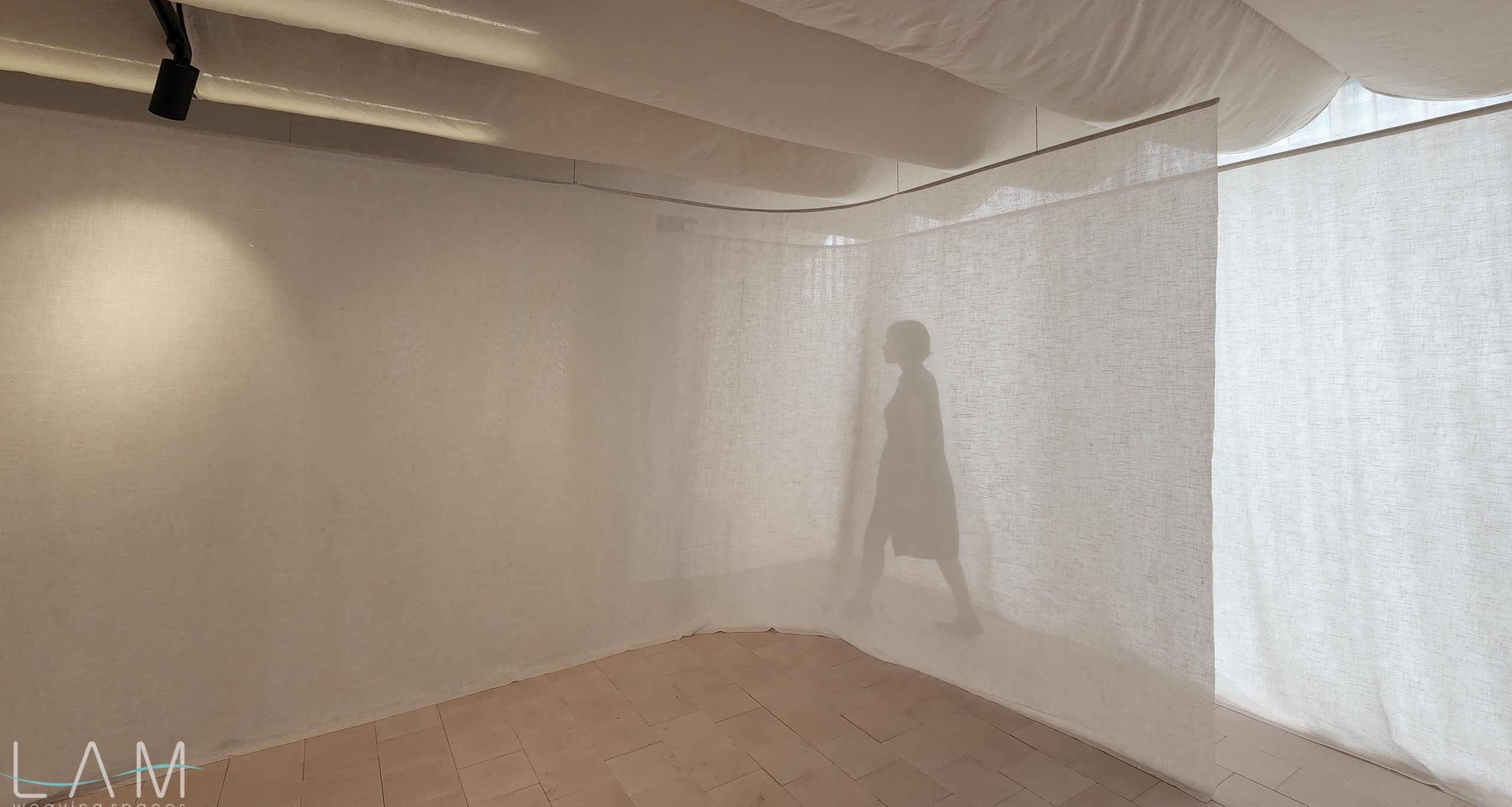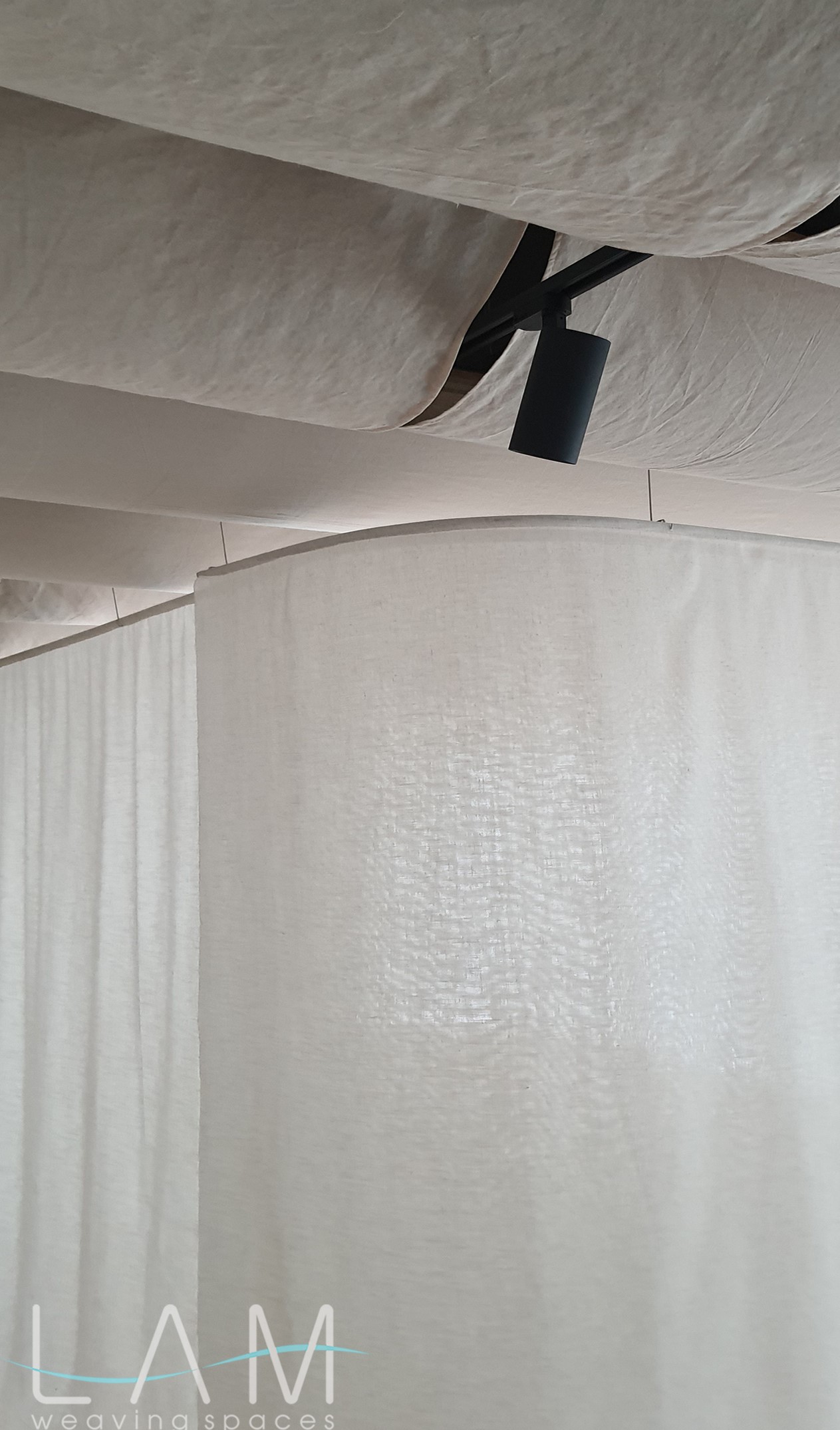 The mobile partition curtains are made of natural fabric, which is breathable and lightweight, allowing easy movement to adjust the space as needed. The simple yet effective design, combined with a flexible rail system, enables open or closed spaces to be adjusted according to the user’s requirements. The translucent quality of the curtains subtly divides the space without compromising its openness.