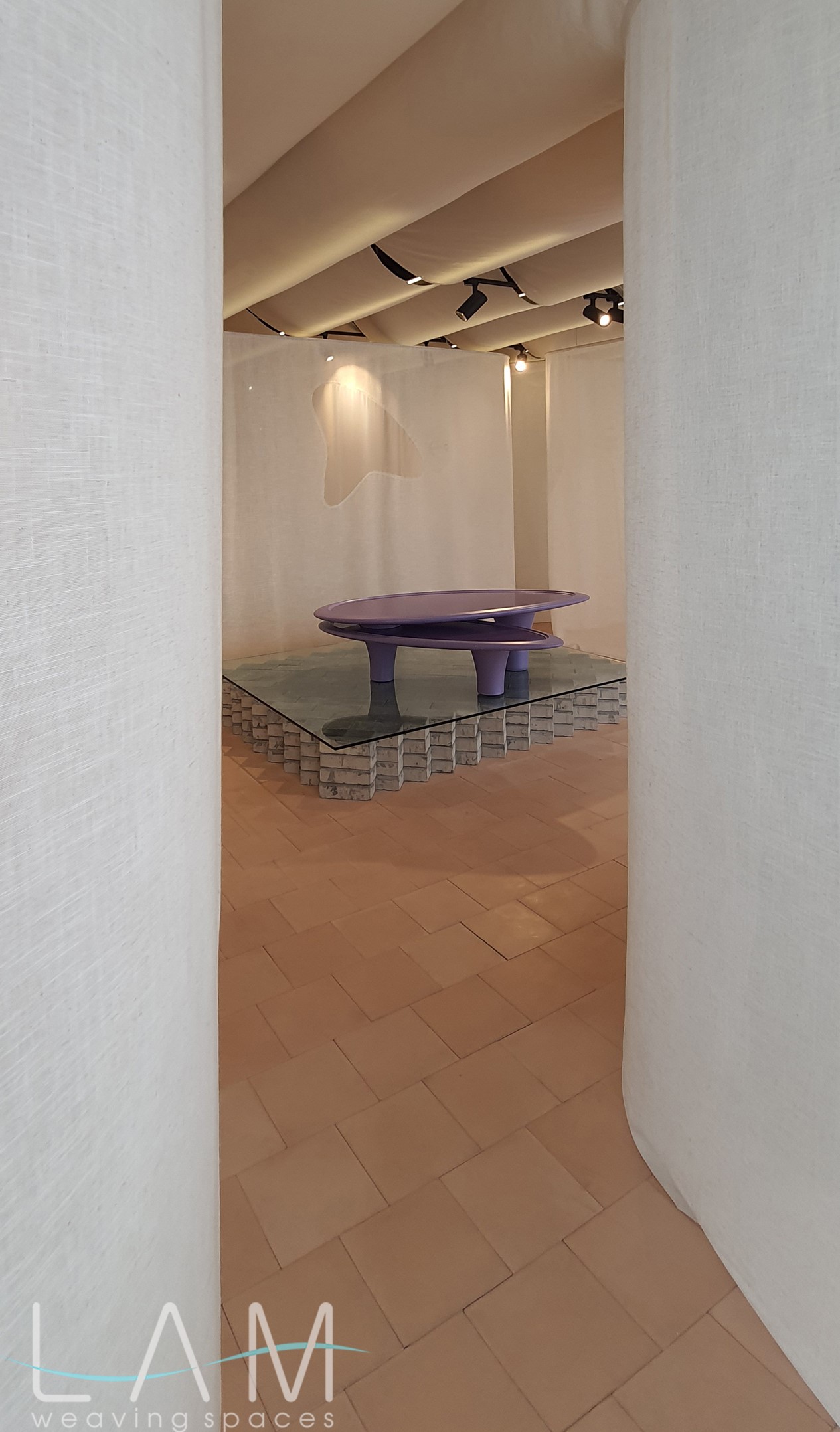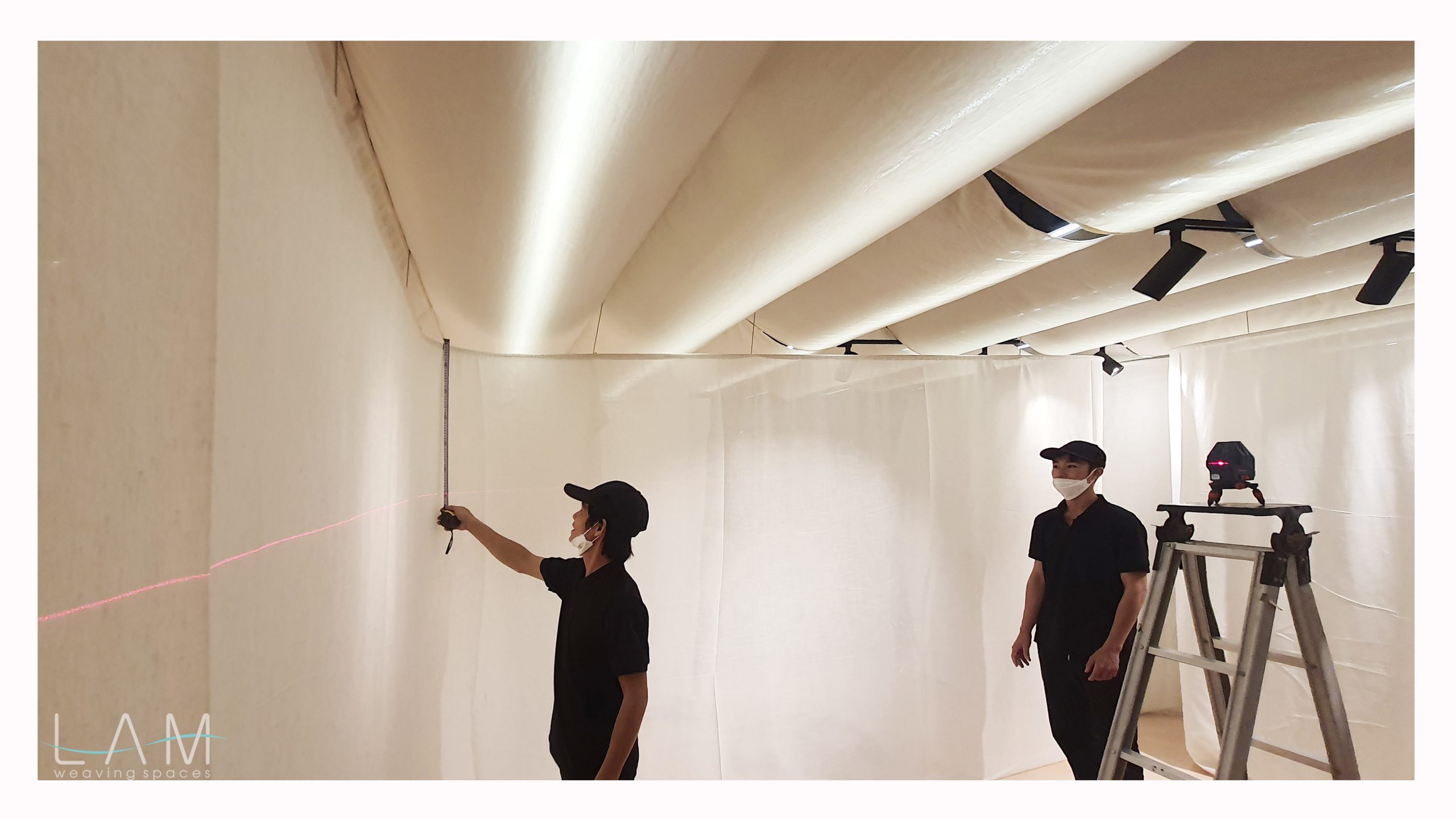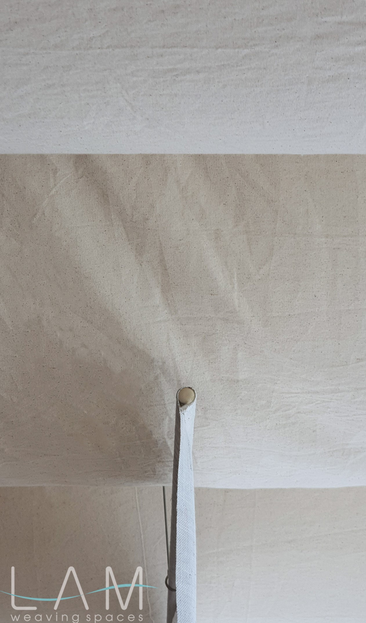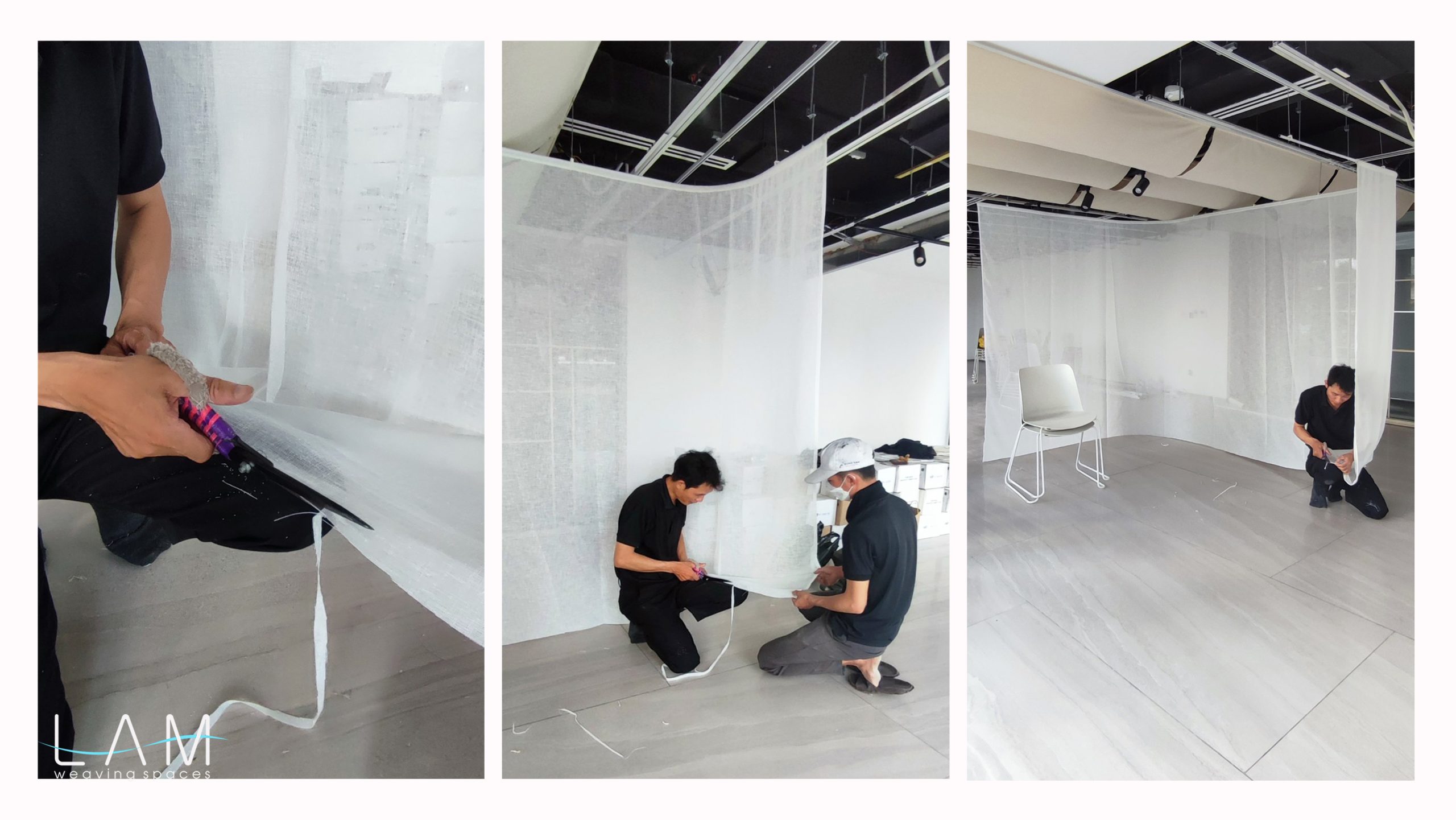 The mobile partition curtains are made of natural fabric, which is breathable and lightweight, allowing easy movement to adjust the space as needed. The simple yet effective design, combined with a flexible rail system, enables open or closed spaces to be adjusted according to the user’s requirements. The translucent quality of the curtains subtly divides the space without compromising its openness.