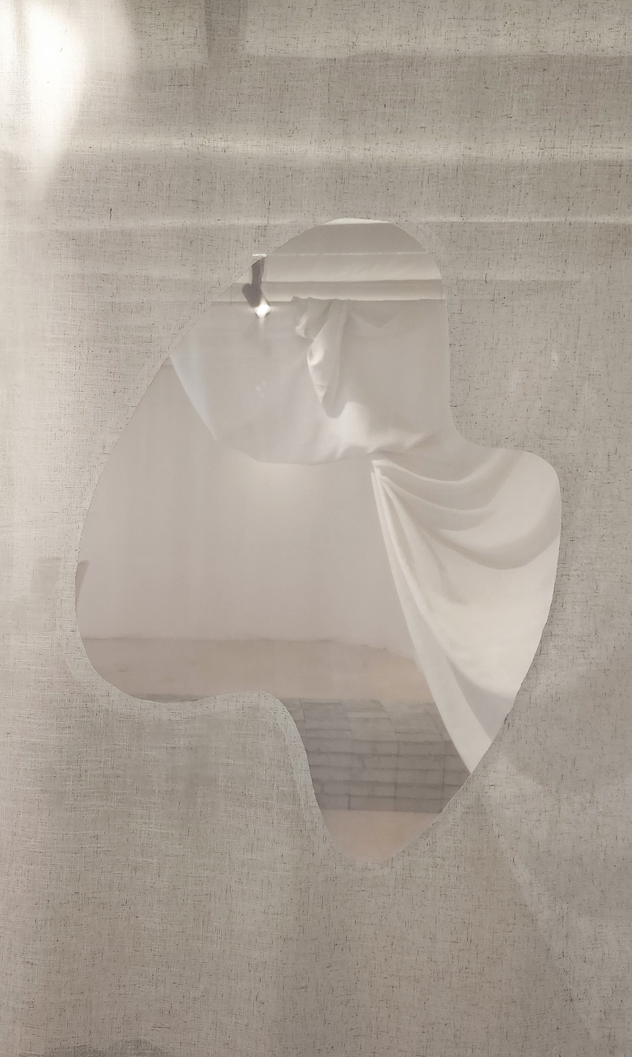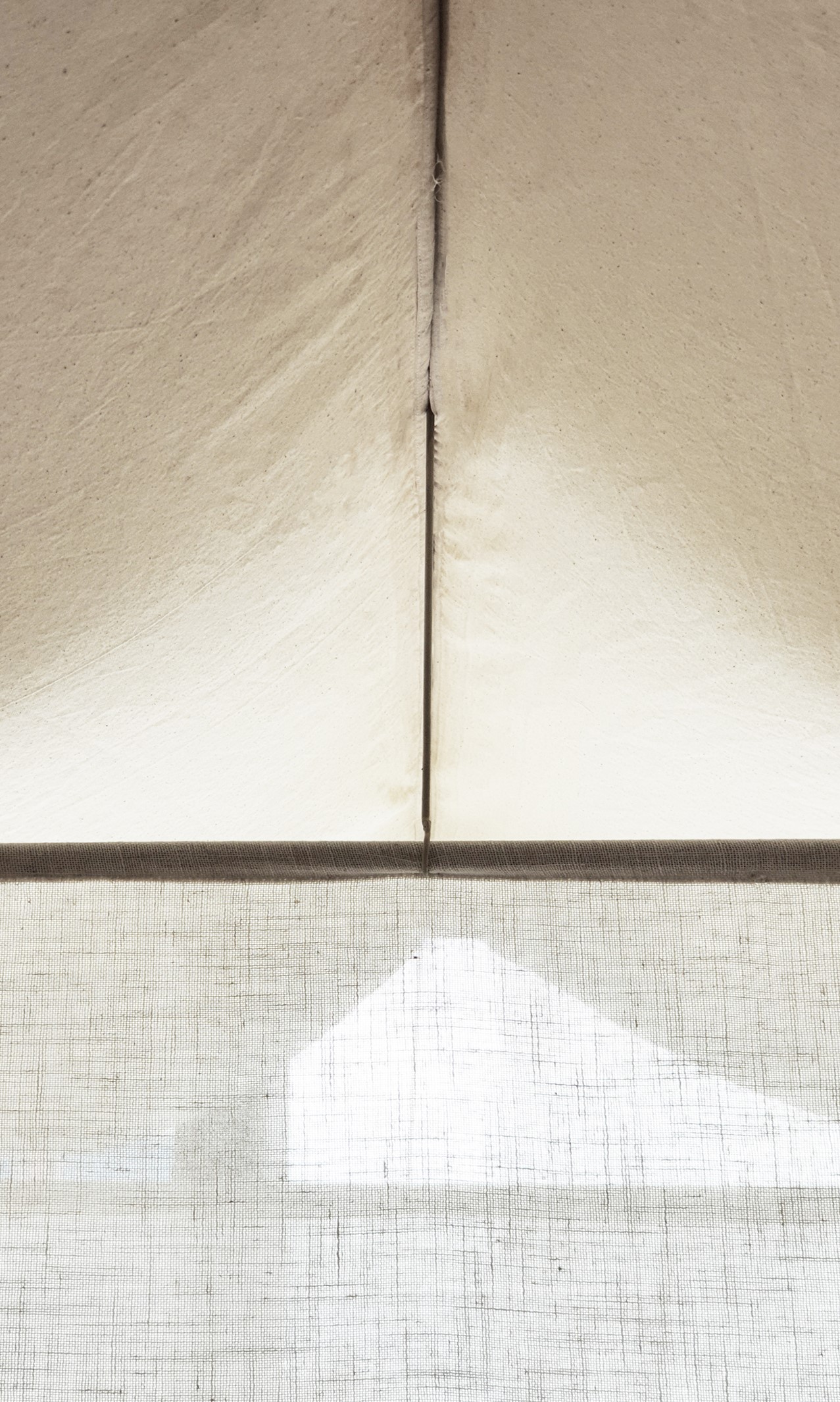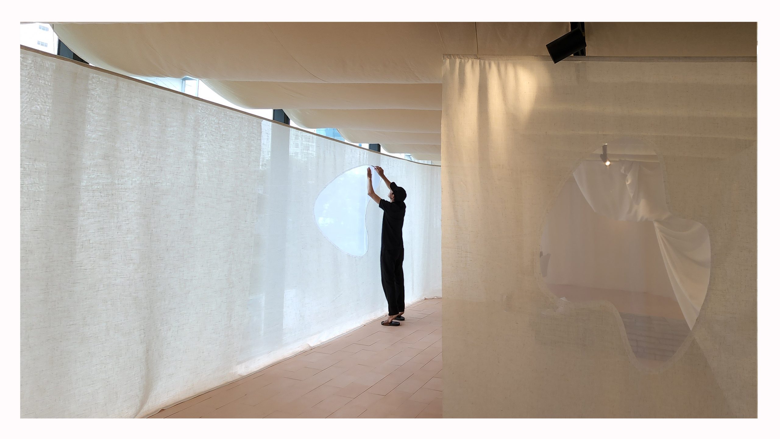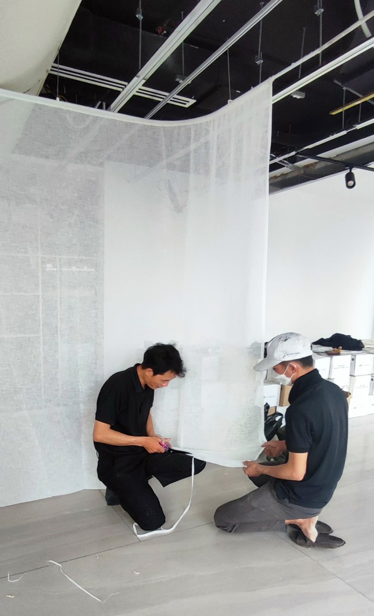 The mobile partition curtains are made of natural fabric, which is breathable and lightweight, allowing easy movement to adjust the space as needed. The simple yet effective design, combined with a flexible rail system, enables open or closed spaces to be adjusted according to the user’s requirements. The translucent quality of the curtains subtly divides the space without compromising its openness.