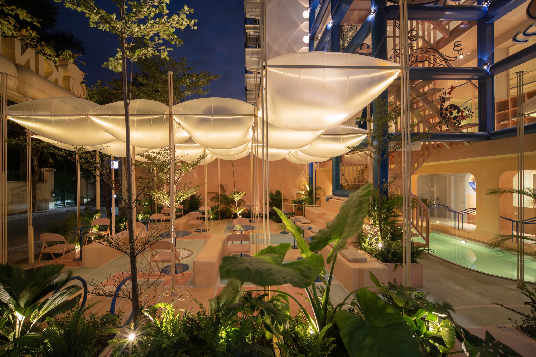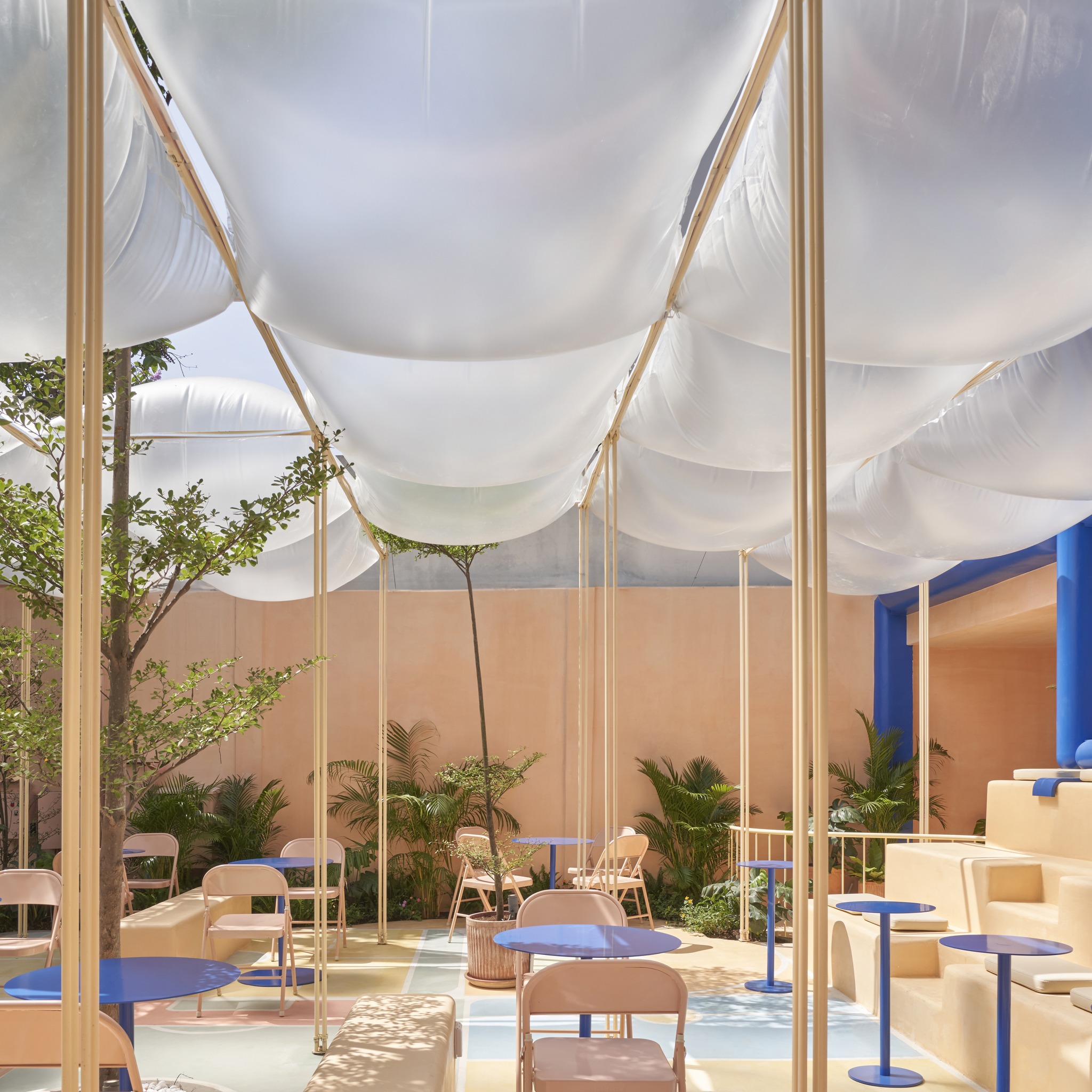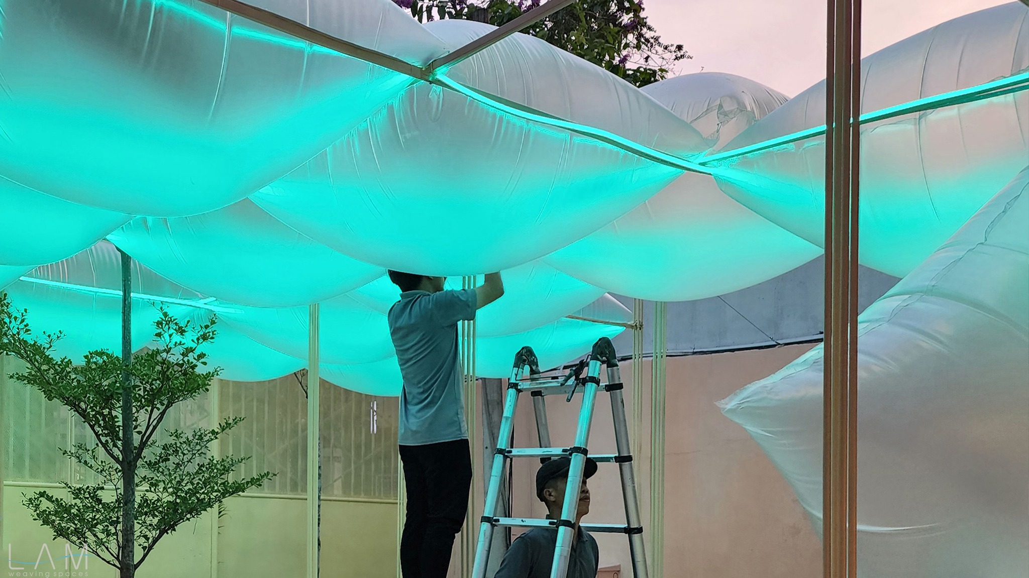The outdoor canopy space at MAME Shiba Cafe, a collaboration between Lam Weaving Spaces and Red5Studio, showcases an inventive blend of functionality and artistry. The sturdy steel frame supports translucent PVC plastic balloons, creating a soft and ethereal effect as light passes through. The tensioned cables are carefully designed to hold the balloons in place, forming shapes reminiscent of floating clouds gently covering the space below.