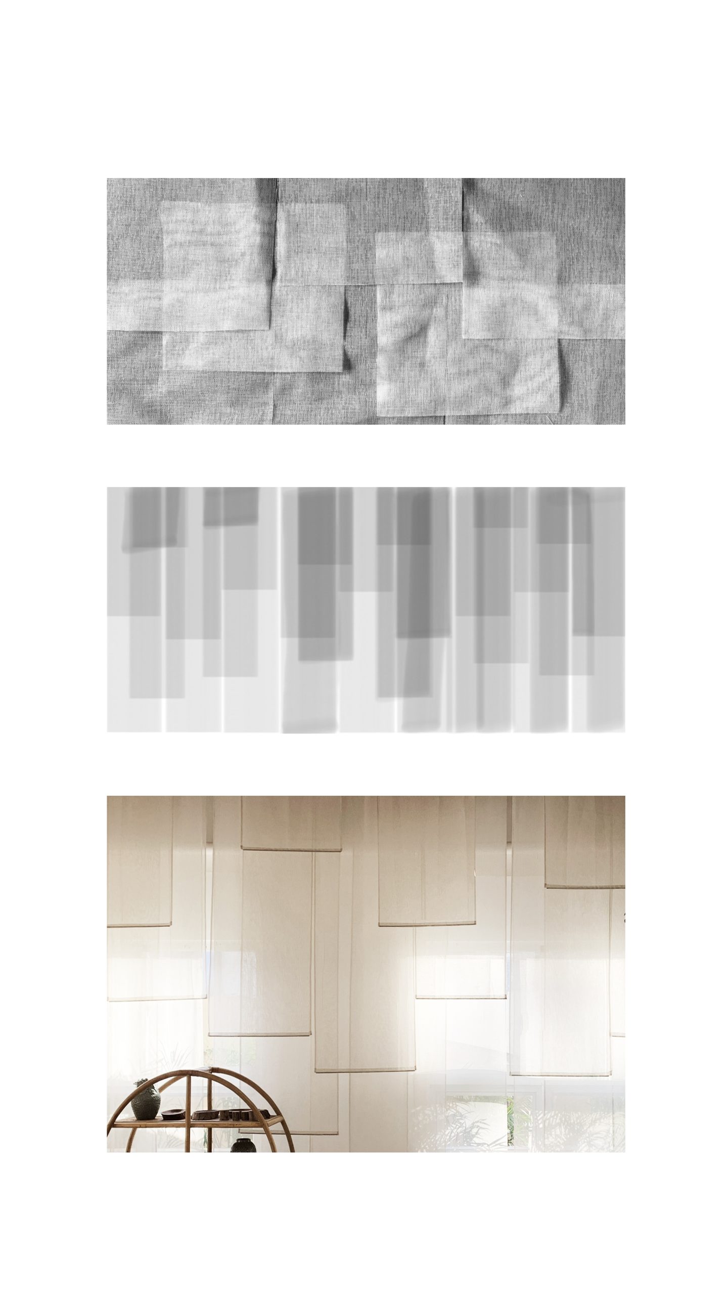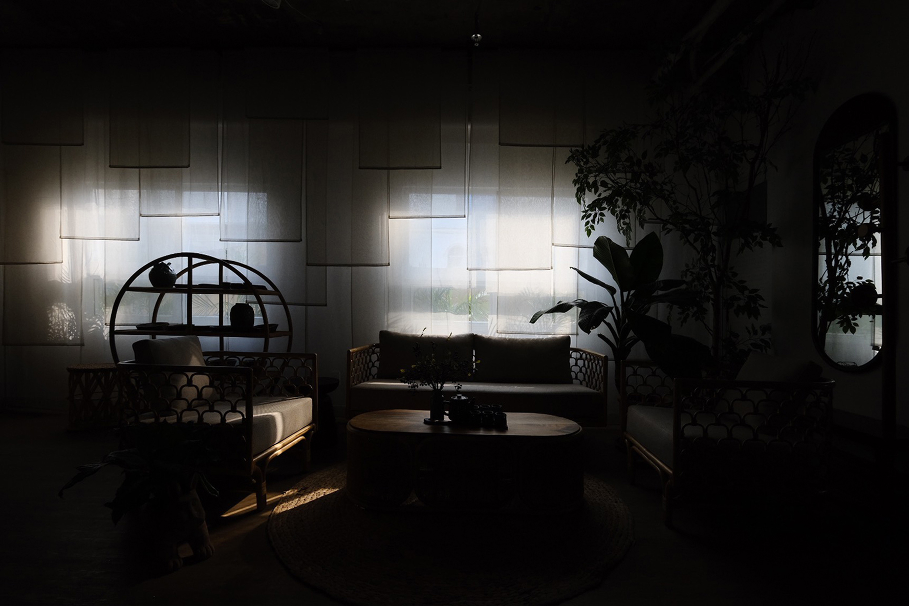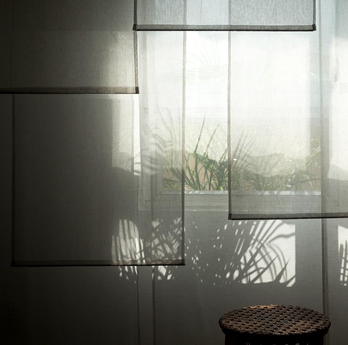 “Voile fabric always interacts well with light. When intentionally using layers of monochromatic voile interwoven and backlit, it creates translucent effects of depth, proximity, brightness, and shadow. Even on a nearly flat surface, these layers can produce a sense of spatial depth. The connecting accessories are custom-designed and manufactured to ensure they best match the desired effects. The display products here are meticulously designed and crafted, with even the smallest details on the furniture requiring just the right amount of space and lighting for proper observation. The use of multiple layers of translucent voile, arranged freely but thoughtfully, helps blur the stark light-and-shadow boundary of natural light from the window, making the display area soft and simple, while creating a gentle background for the products on display.”