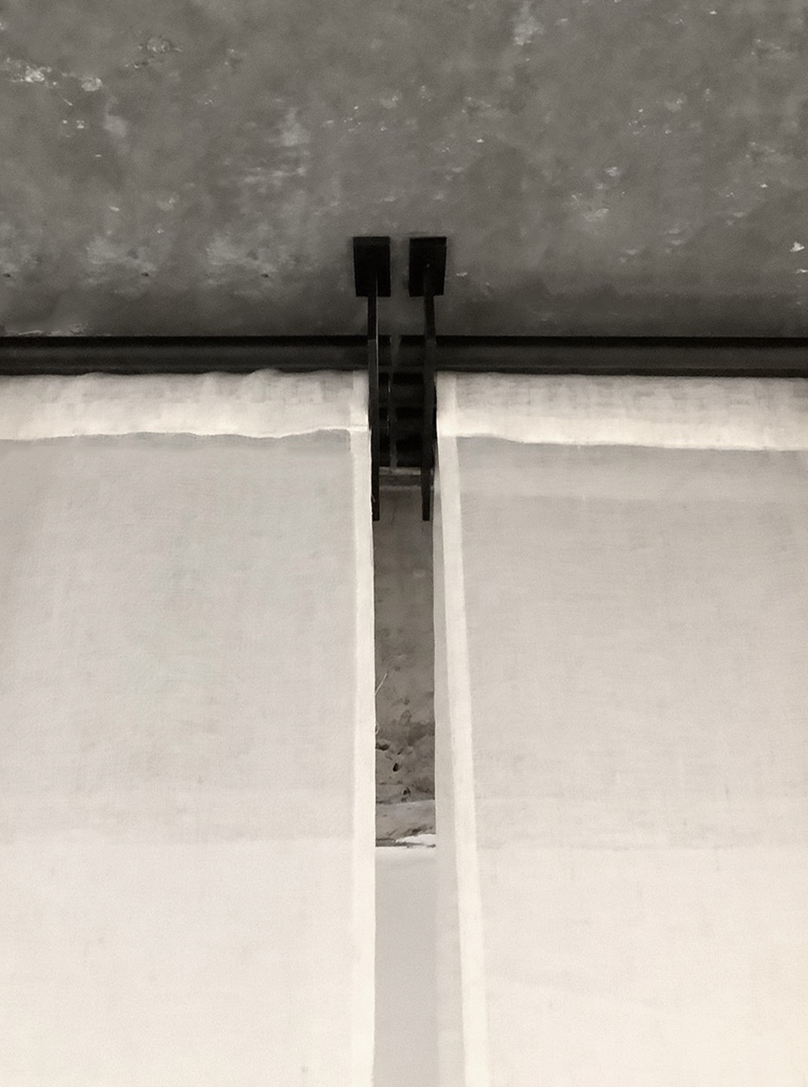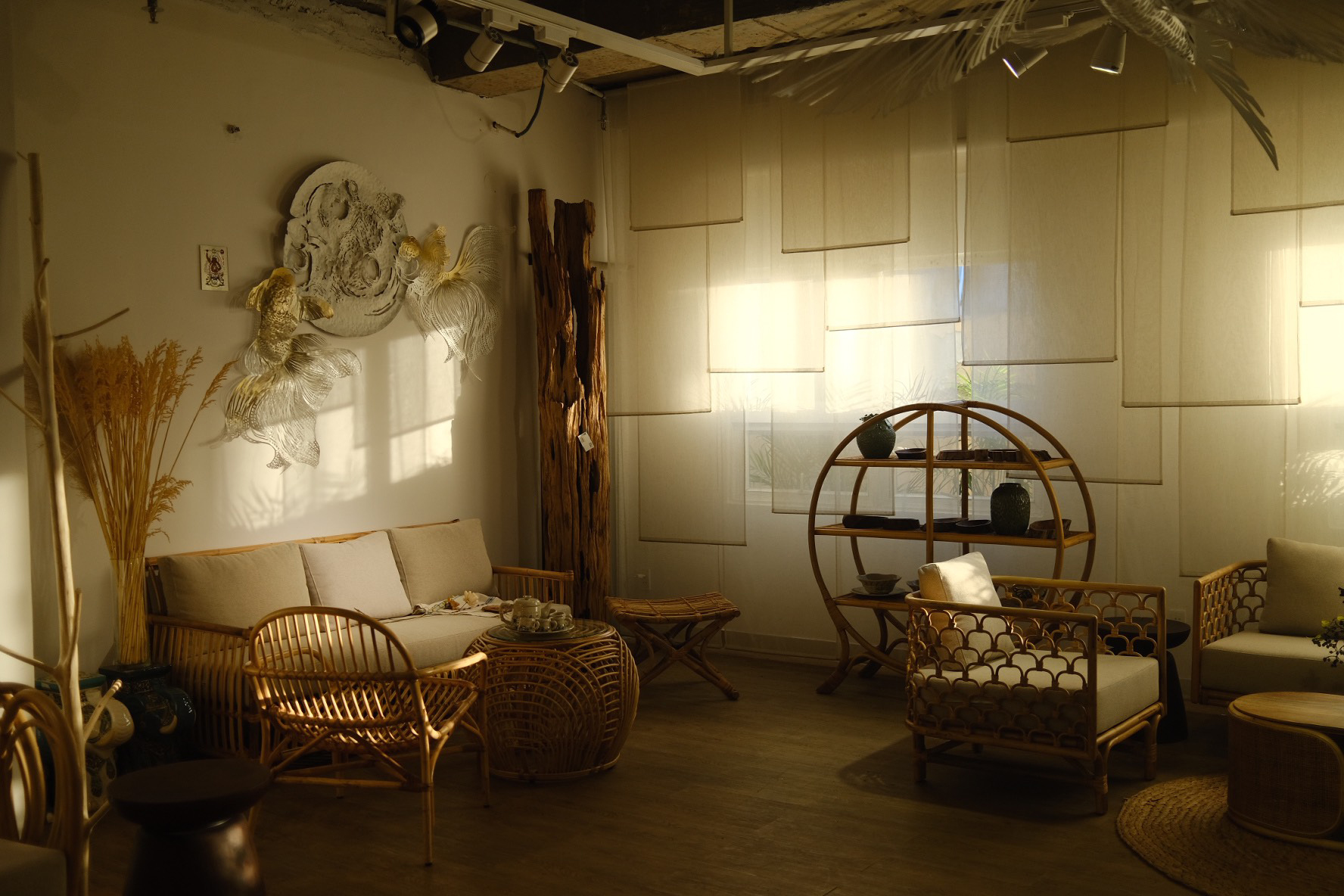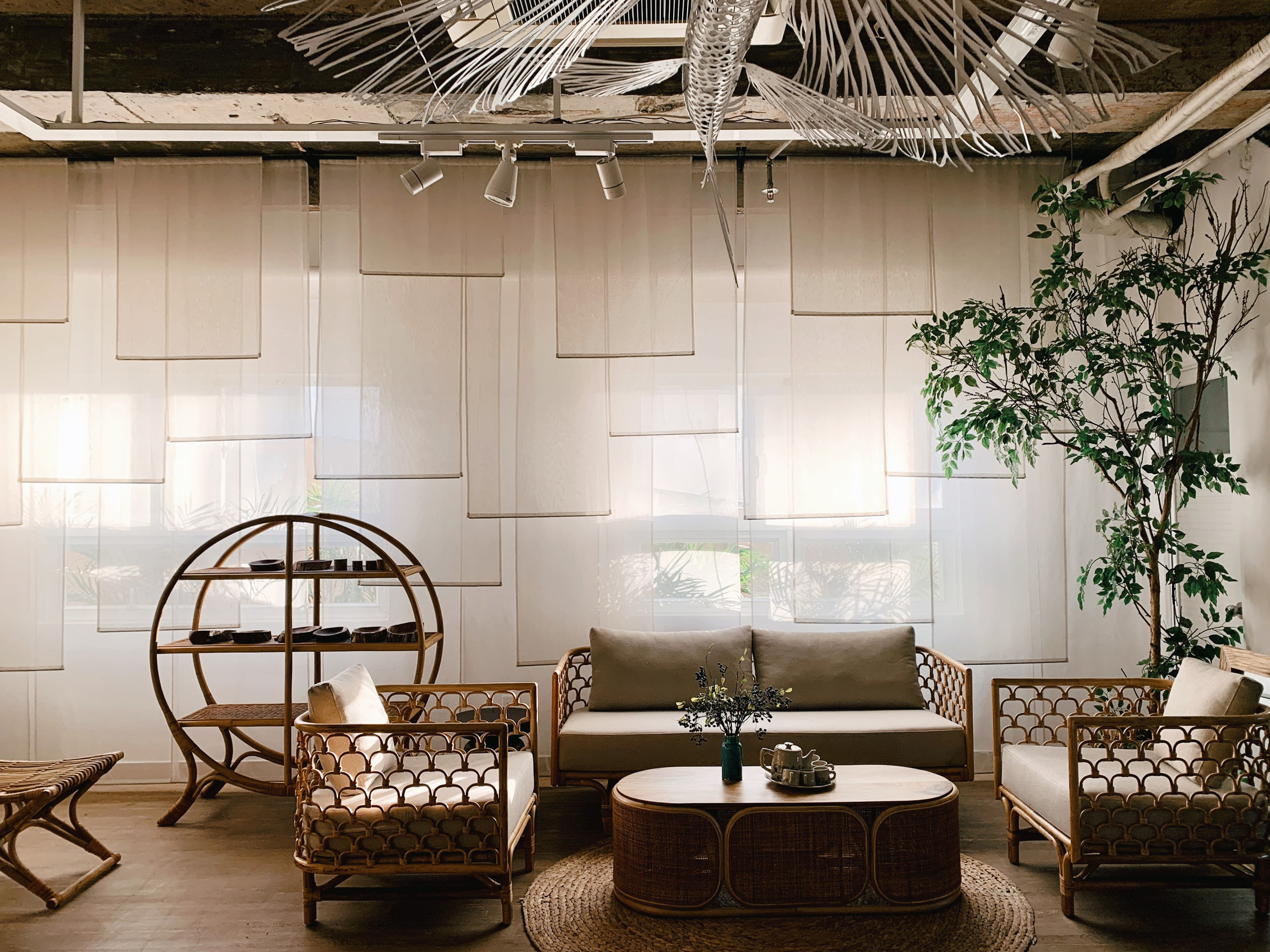 “Voile fabric always interacts well with light. When intentionally using layers of monochromatic voile interwoven and backlit, it creates translucent effects of depth, proximity, brightness, and shadow. Even on a nearly flat surface, these layers can produce a sense of spatial depth. The connecting accessories are custom-designed and manufactured to ensure they best match the desired effects. The display products here are meticulously designed and crafted, with even the smallest details on the furniture requiring just the right amount of space and lighting for proper observation. The use of multiple layers of translucent voile, arranged freely but thoughtfully, helps blur the stark light-and-shadow boundary of natural light from the window, making the display area soft and simple, while creating a gentle background for the products on display.”