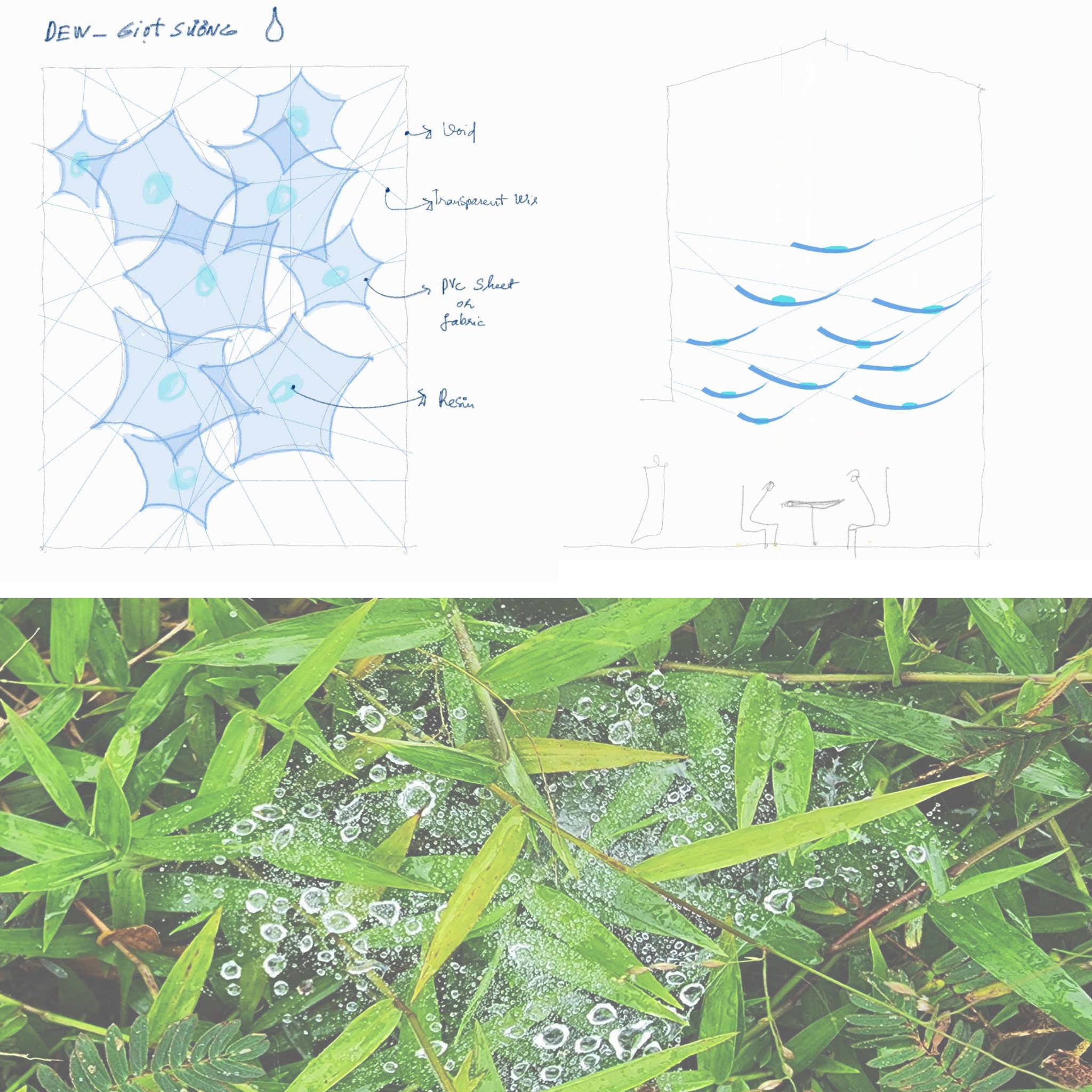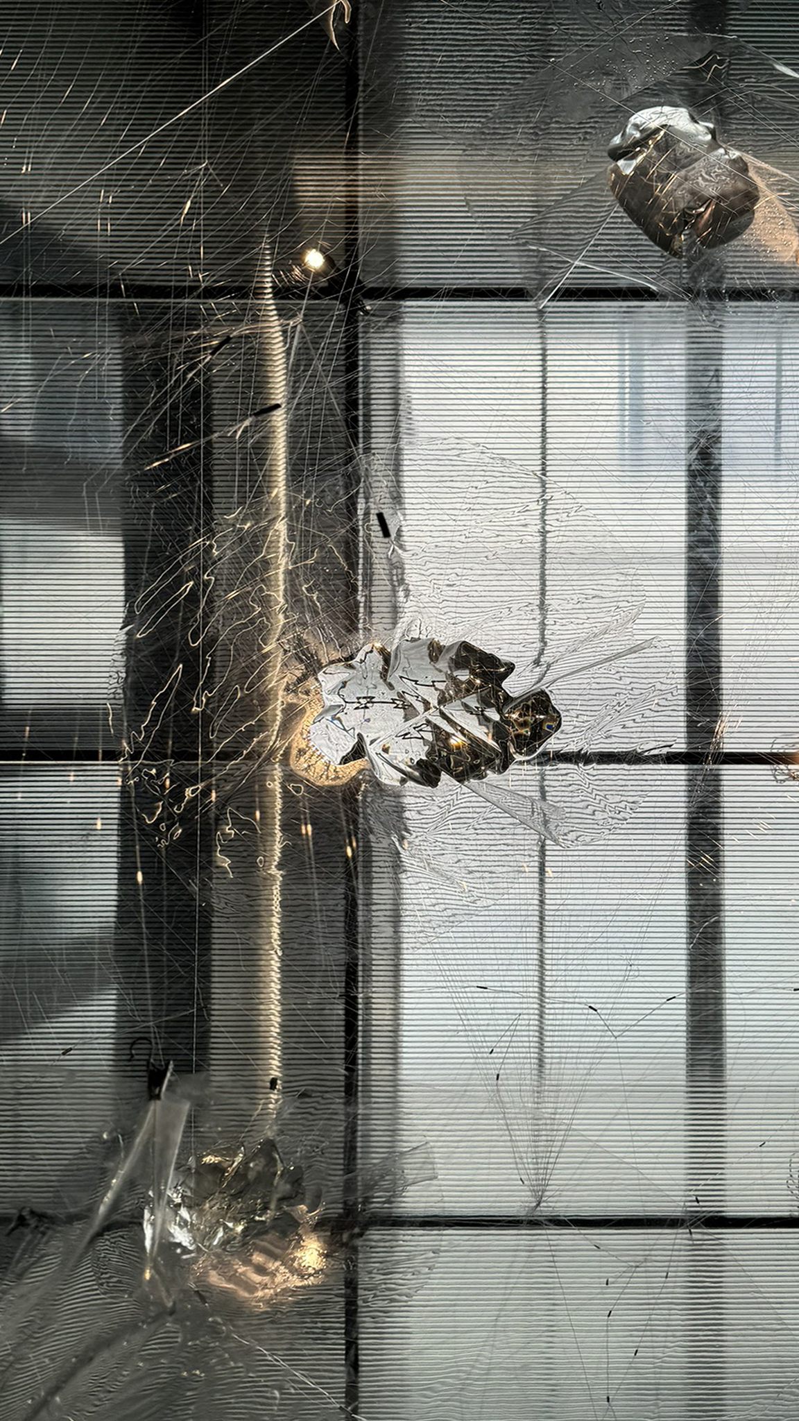 This time, the inspiration from a spider web structure was explored more intensely. The contrast between the weight of dew droplets and the nearly invisible delicacy of the threads became a central focus. Unable to replicate the skill of a spider, the process was approached in reverse. A heavy “dew drop” was first created on a stretched mesh system, anchored firmly to surrounding structures. From there, the mesh was gradually “carved away,” strand by strand, reducing it to the minimum required for structural integrity. The entire network remained almost fully tensioned, with each intersection acting as a critical node for maintaining stability.