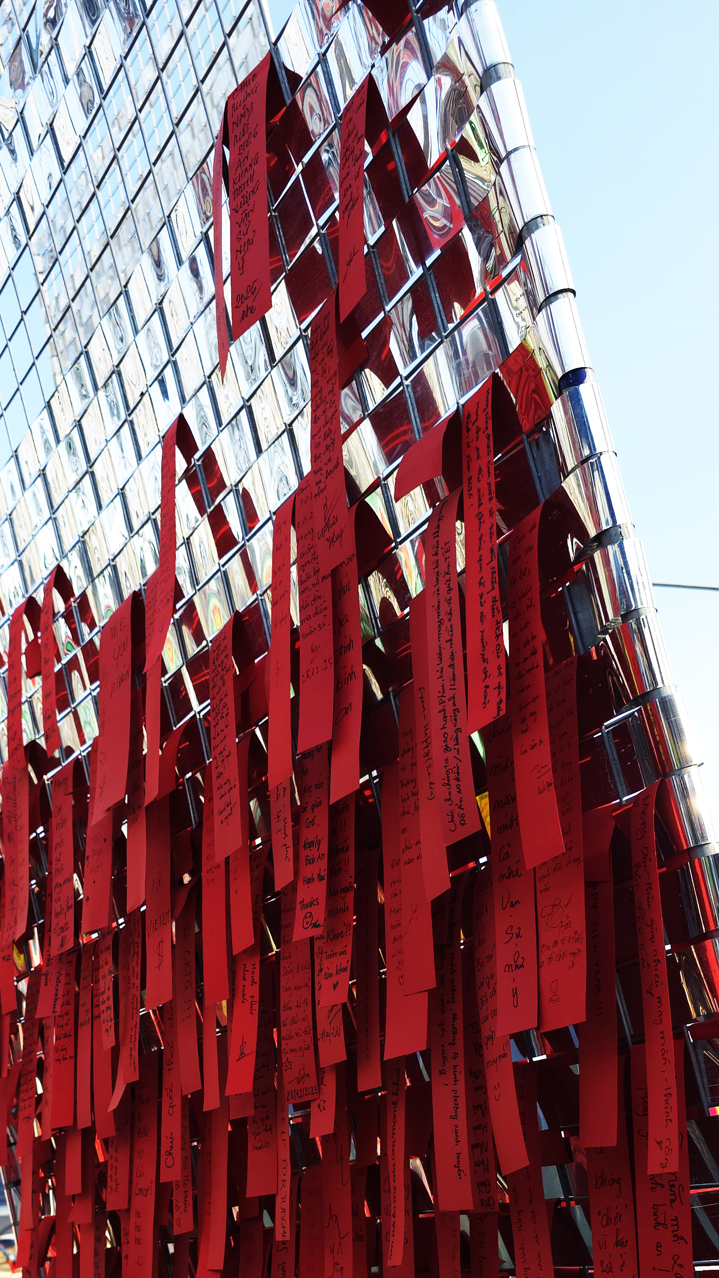 Đối was an experiential space and also the central artwork of Maze-Zô within City Tet Fest. The project drew inspiration from the familiar image of the cuốn thư and the red parallel scrolls traditionally seen during Tet. Built at an enlarged scale, the structure formed an interactive spatial experience that can be engaged with both from the outside and within. Beyond the visual reference to the scroll, Đối here also implied a dialogue with the context and festive atmosphere surrounding it. The installation employed three primary materials: welded steel mesh, reflective foil, and red note papers for writing wishes. The reflective foil interacted with changing environmental conditions. In the morning, under gentle sunlight and clear skies, it shimmered softly. As evening approached, the sunset casted vivid golden-orange reflections. At night, beneath the colorful lights of the festival and the constant movement of visitors, the installation continuously transformed in tone and visual effect. The foil was woven with calculated density to reduce wind pressure at higher levels. The higher the structure rose, the looser the weave became, descending toward the ground, the density gradually increased, with the base woven most densely to achieve optimal reflective performance. The red note papers created a strong sense of participation for visitors. Countless wishes and greetings from people of all ages were written and carefully attached within arm’s reach onto the frame. This became the key interactive element, and the final layer that completed the artwork.