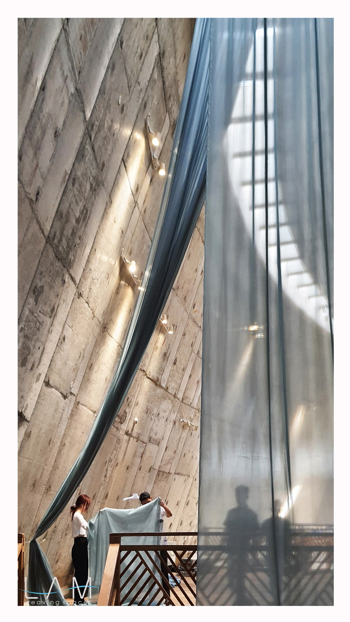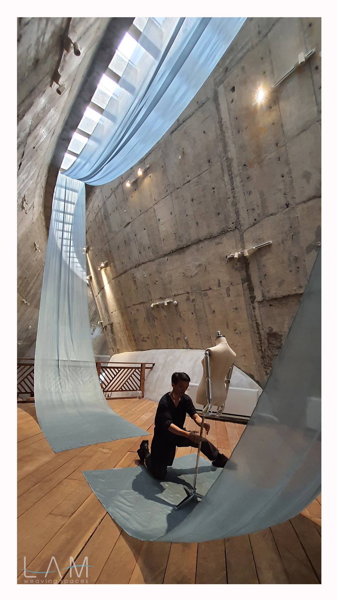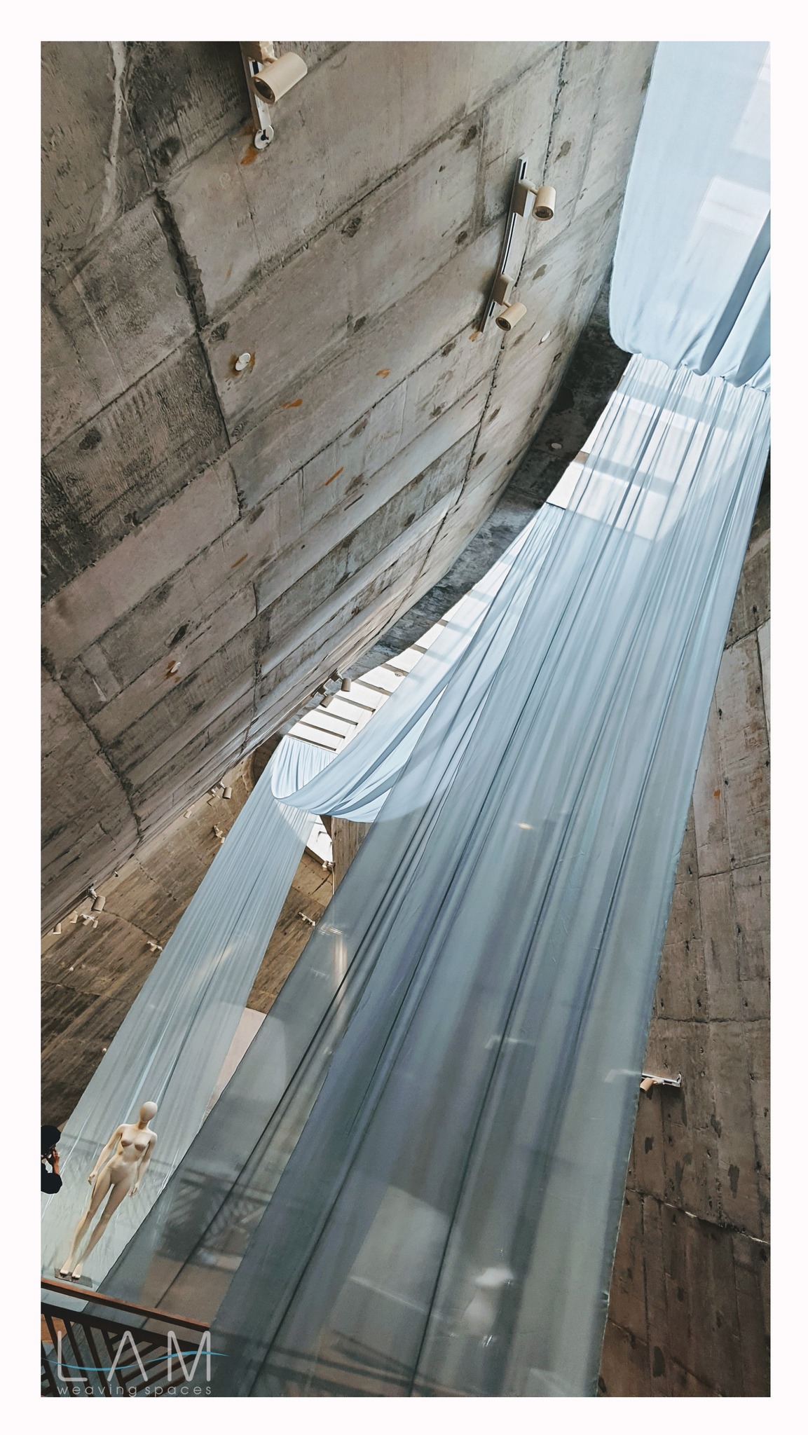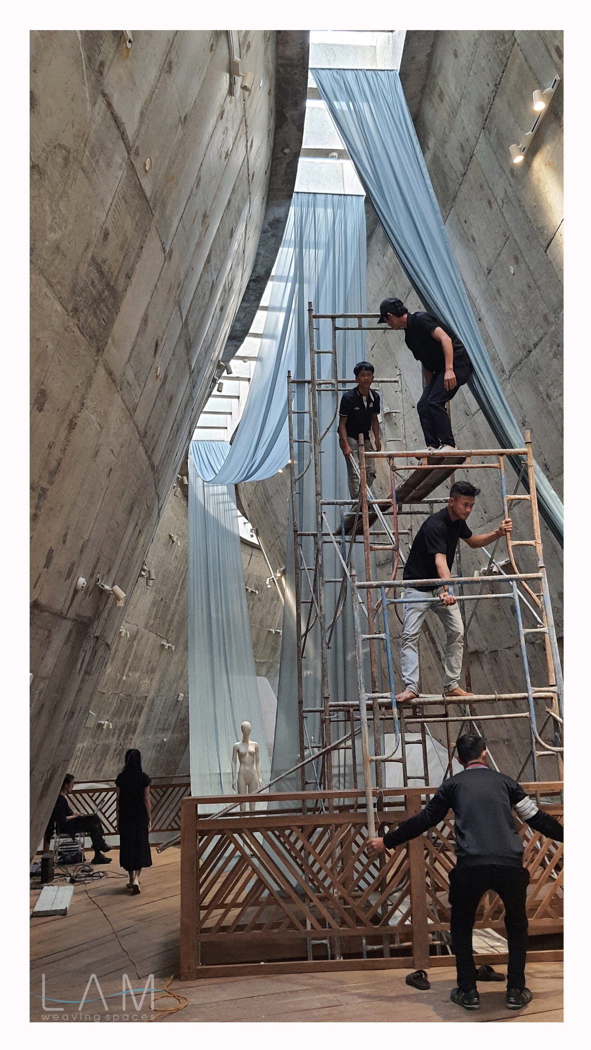 “Tây Nguyên are renowned for their waterfalls, with streams of water cascading from high rocky crevices, creating majestic scenes. The striking yet harmonious contrast between the towering mountains and the soft or fierce waterfalls, depending on the time of year, is awe-inspiring. The exhibition space at the museum has a particularly interesting layout. Between two slanted, curving concrete walls runs a narrow skylight along the length of the museum structure. With the proportions, volume, materials, lighting, and local characteristics in mind, the designer aimed to make the arrangement of the exhibits an integral part of this fascinating connection. The idea was to mimic the soft flow of water running along the skylight and cascading down grandly, much like the magnificent waterfalls of the Central Highlands. The concept is simple, concise, and fairly easy to execute. The primary task was to select the fabric material and color that would achieve the best effect. Smooth, soft, and thin silk voile with a slight shimmer was chosen to interact well with the light. Every moment of the high-altitude installation process was also fascinating. Long stretches of fabric draped over the tall scaffolding, shifting as the workers carefully guided them into place. The designer was able to adjust the real-life proportions directly on-site. The construction process is a key part of the experience that LAM rarely skips, as it offers potential inspiration for other ideas.”
