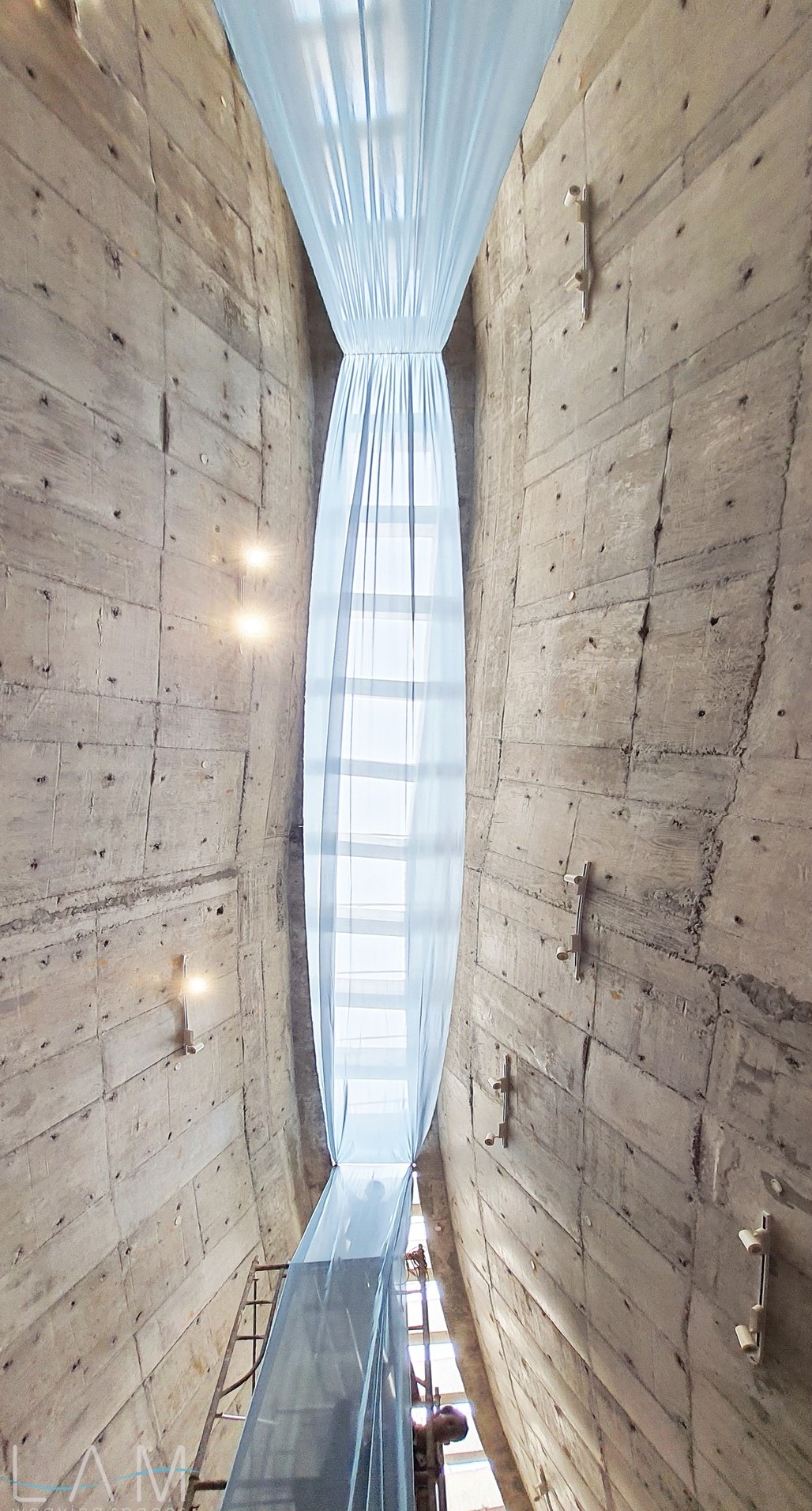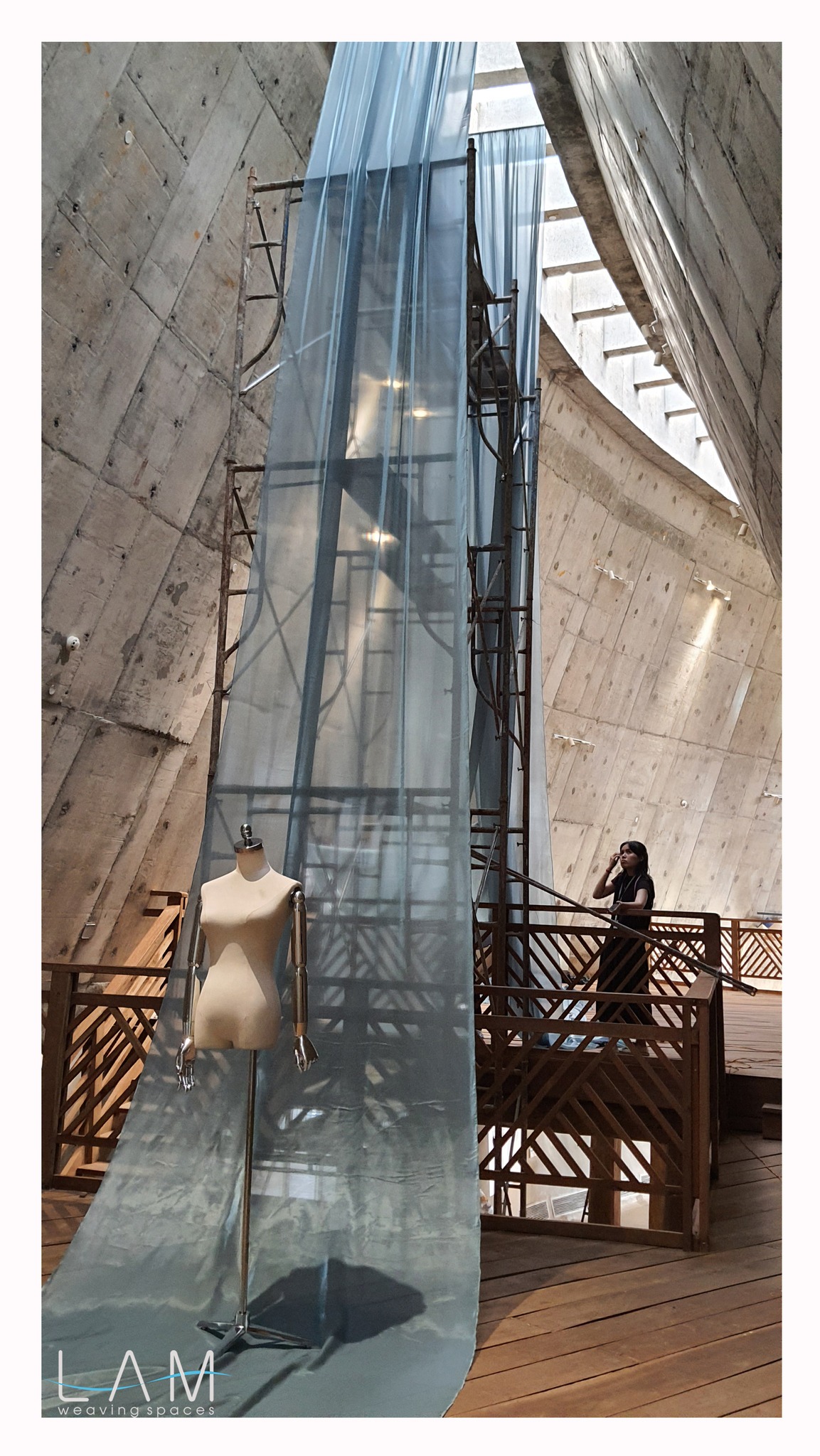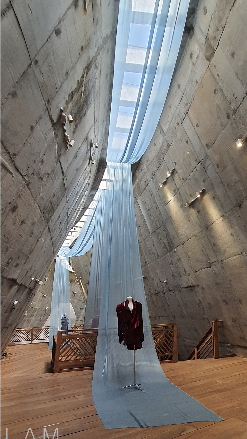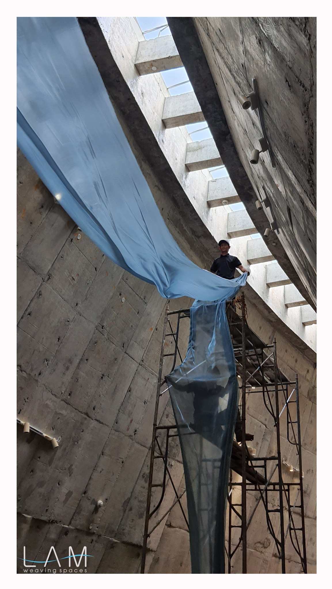“Tây Nguyên are renowned for their waterfalls, with streams of water cascading from high rocky crevices, creating majestic scenes. The striking yet harmonious contrast between the towering mountains and the soft or fierce waterfalls, depending on the time of year, is awe-inspiring. The exhibition space at the museum has a particularly interesting layout. Between two slanted, curving concrete walls runs a narrow skylight along the length of the museum structure. With the proportions, volume, materials, lighting, and local characteristics in mind, the designer aimed to make the arrangement of the exhibits an integral part of this fascinating connection. The idea was to mimic the soft flow of water running along the skylight and cascading down grandly, much like the magnificent waterfalls of the Central Highlands. The concept is simple, concise, and fairly easy to execute. The primary task was to select the fabric material and color that would achieve the best effect. Smooth, soft, and thin silk voile with a slight shimmer was chosen to interact well with the light. Every moment of the high-altitude installation process was also fascinating. Long stretches of fabric draped over the tall scaffolding, shifting as the workers carefully guided them into place. The designer was able to adjust the real-life proportions directly on-site. The construction process is a key part of the experience that LAM rarely skips, as it offers potential inspiration for other ideas.”
