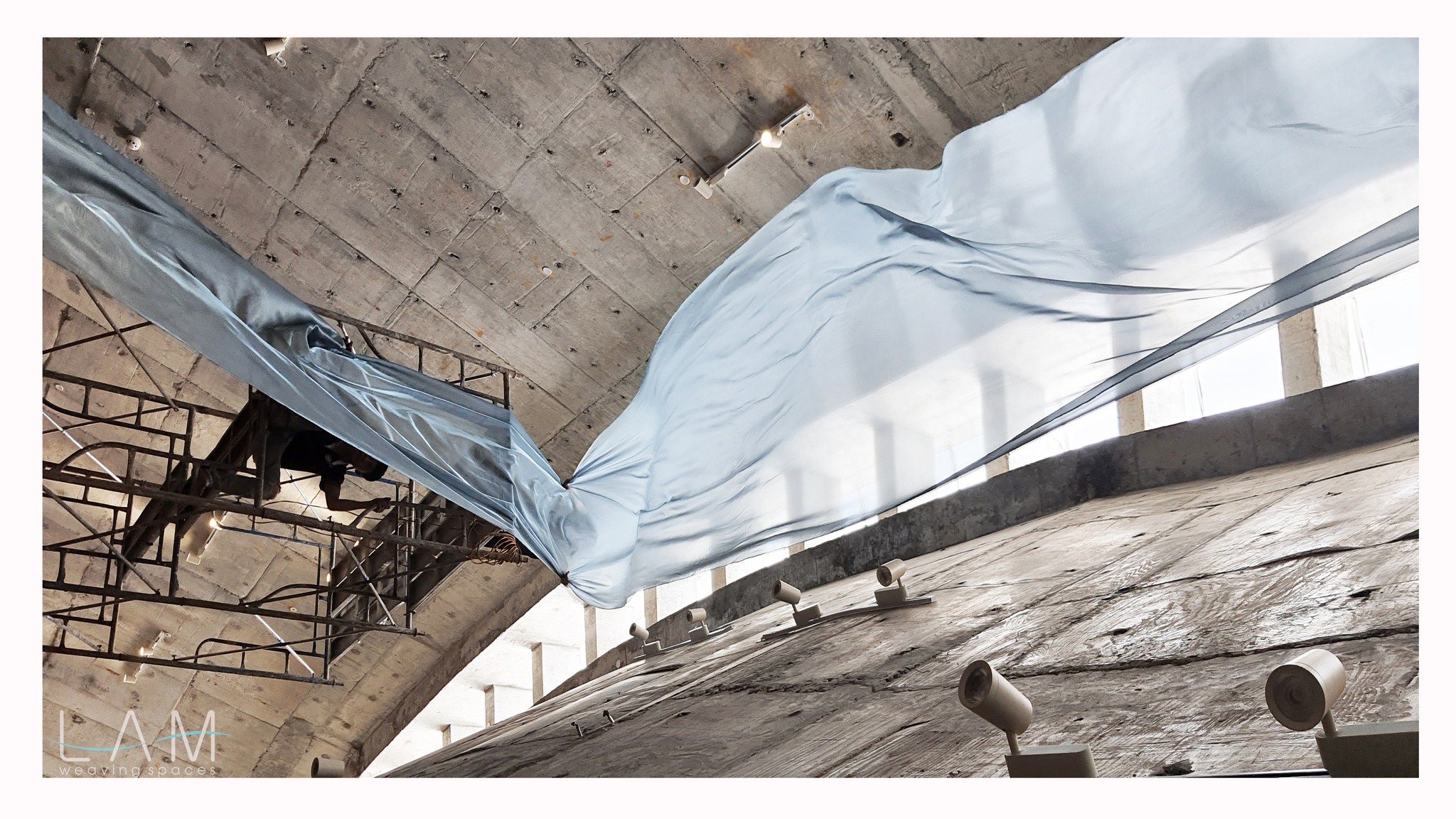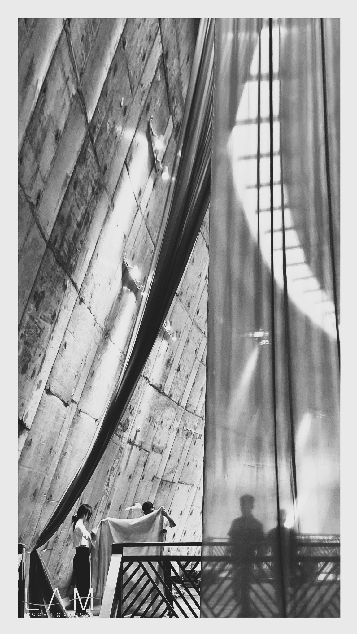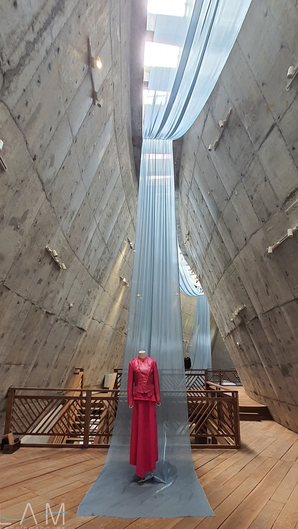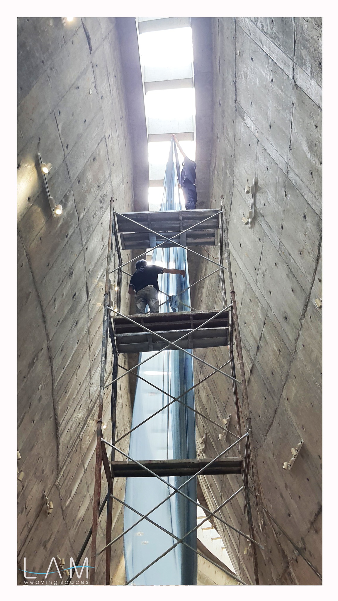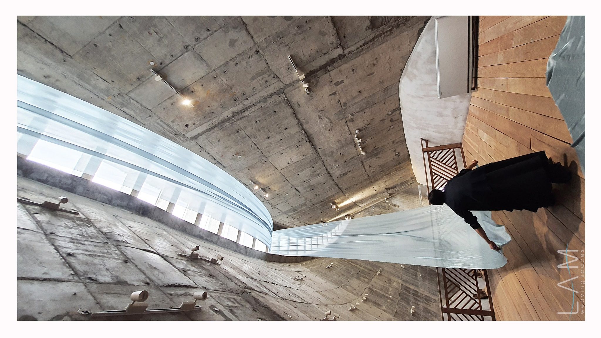 “Tây Nguyên are renowned for their waterfalls, with streams of water cascading from high rocky crevices, creating majestic scenes. The striking yet harmonious contrast between the towering mountains and the soft or fierce waterfalls, depending on the time of year, is awe-inspiring. The exhibition space at the museum has a particularly interesting layout. Between two slanted, curving concrete walls runs a narrow skylight along the length of the museum structure. With the proportions, volume, materials, lighting, and local characteristics in mind, the designer aimed to make the arrangement of the exhibits an integral part of this fascinating connection. The idea was to mimic the soft flow of water running along the skylight and cascading down grandly, much like the magnificent waterfalls of the Central Highlands. The concept is simple, concise, and fairly easy to execute. The primary task was to select the fabric material and color that would achieve the best effect. Smooth, soft, and thin silk voile with a slight shimmer was chosen to interact well with the light. Every moment of the high-altitude installation process was also fascinating. Long stretches of fabric draped over the tall scaffolding, shifting as the workers carefully guided them into place. The designer was able to adjust the real-life proportions directly on-site. The construction process is a key part of the experience that LAM rarely skips, as it offers potential inspiration for other ideas.”