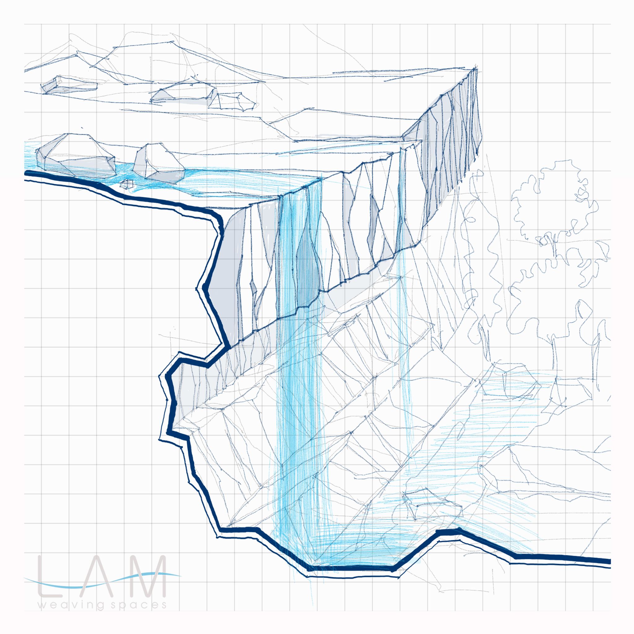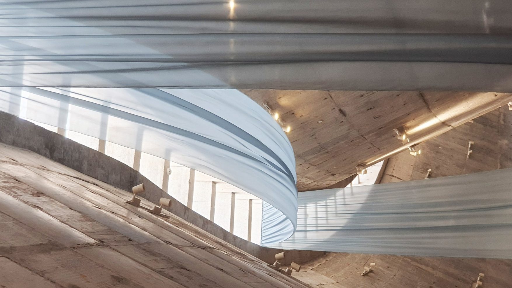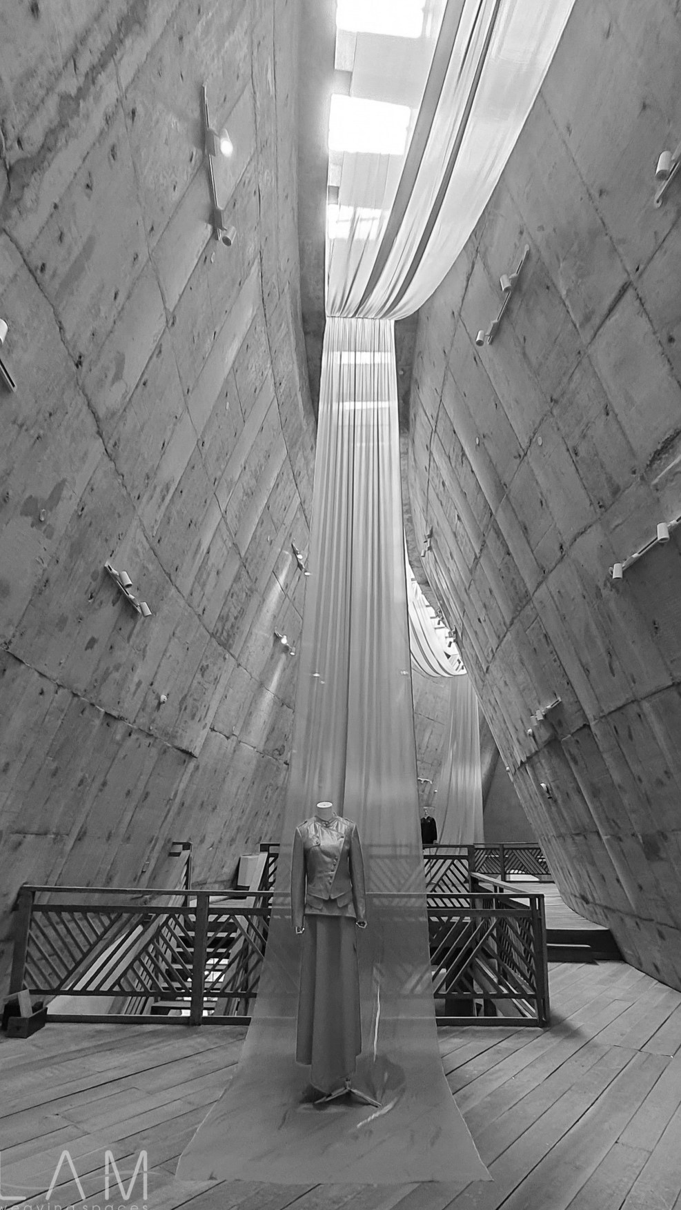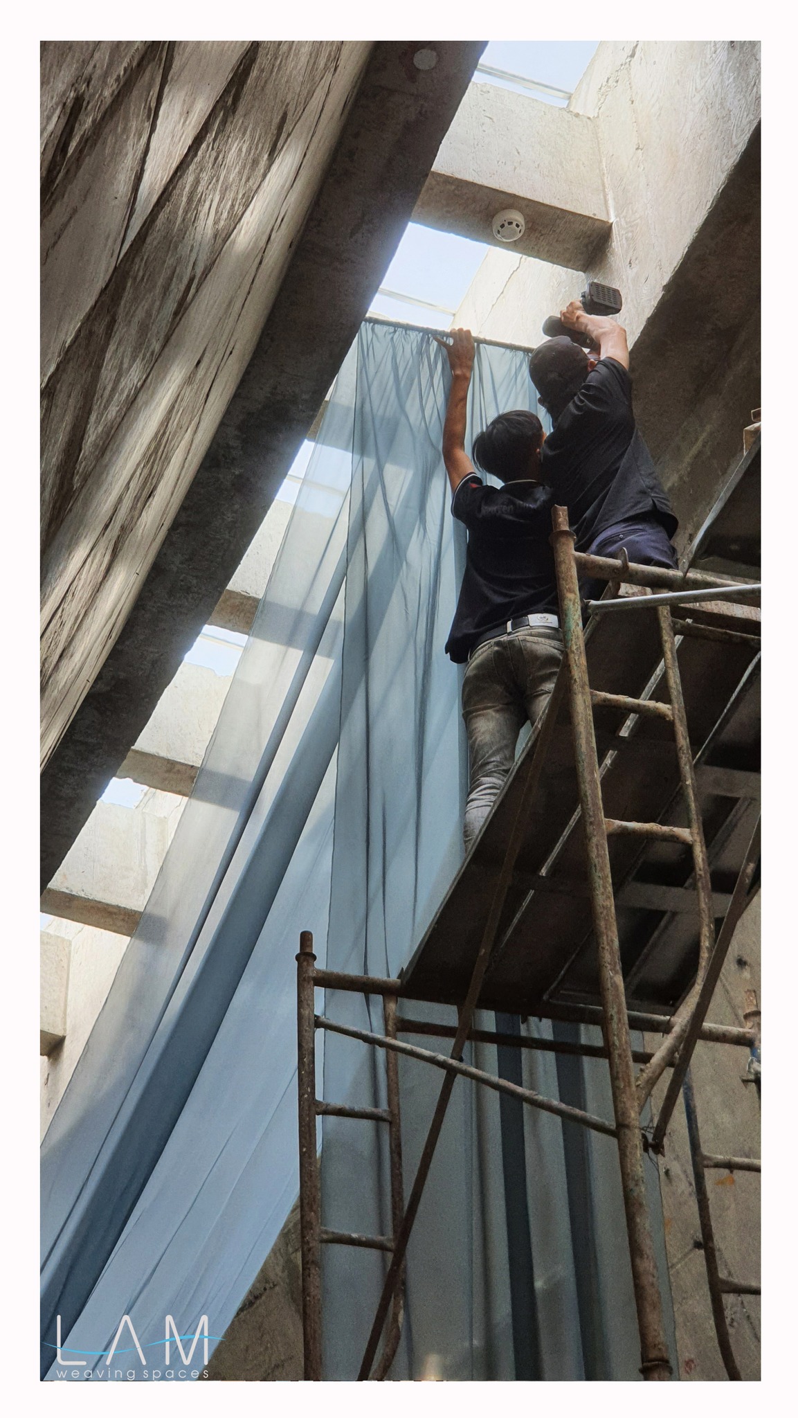 “Tây Nguyên are renowned for their waterfalls, with streams of water cascading from high rocky crevices, creating majestic scenes. The striking yet harmonious contrast between the towering mountains and the soft or fierce waterfalls, depending on the time of year, is awe-inspiring. The exhibition space at the museum has a particularly interesting layout. Between two slanted, curving concrete walls runs a narrow skylight along the length of the museum structure. With the proportions, volume, materials, lighting, and local characteristics in mind, the designer aimed to make the arrangement of the exhibits an integral part of this fascinating connection. The idea was to mimic the soft flow of water running along the skylight and cascading down grandly, much like the magnificent waterfalls of the Central Highlands. The concept is simple, concise, and fairly easy to execute. The primary task was to select the fabric material and color that would achieve the best effect. Smooth, soft, and thin silk voile with a slight shimmer was chosen to interact well with the light. Every moment of the high-altitude installation process was also fascinating. Long stretches of fabric draped over the tall scaffolding, shifting as the workers carefully guided them into place. The designer was able to adjust the real-life proportions directly on-site. The construction process is a key part of the experience that LAM rarely skips, as it offers potential inspiration for other ideas.”