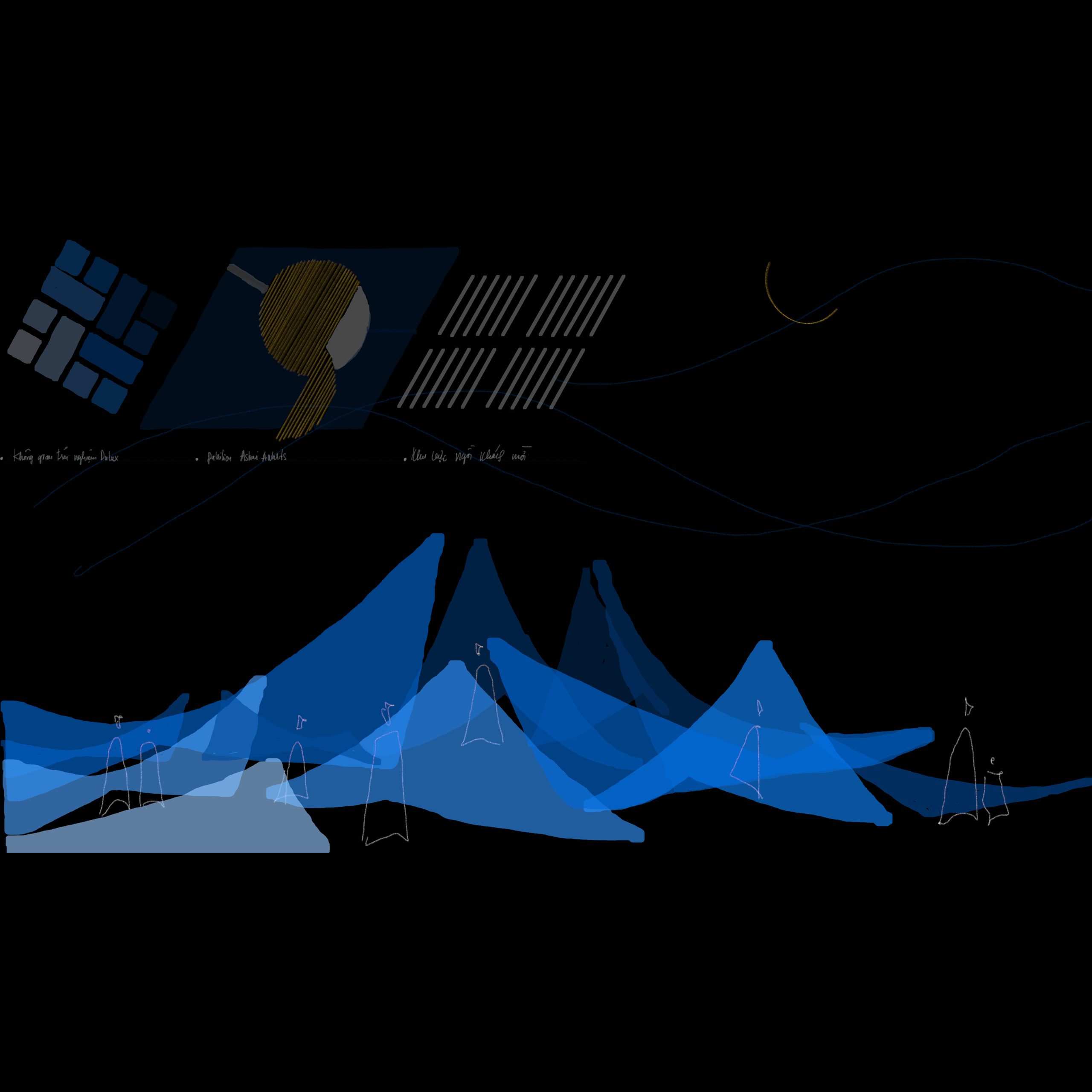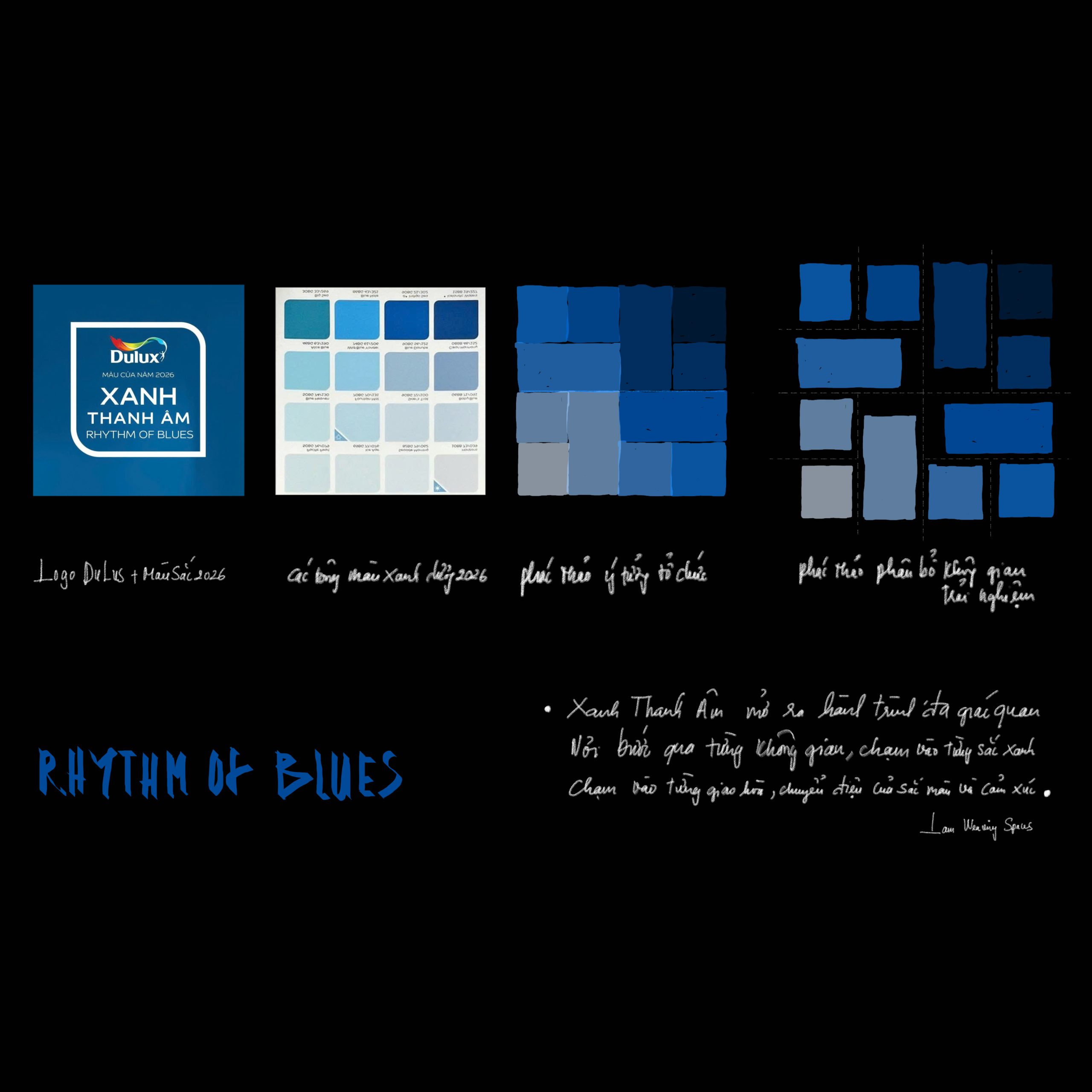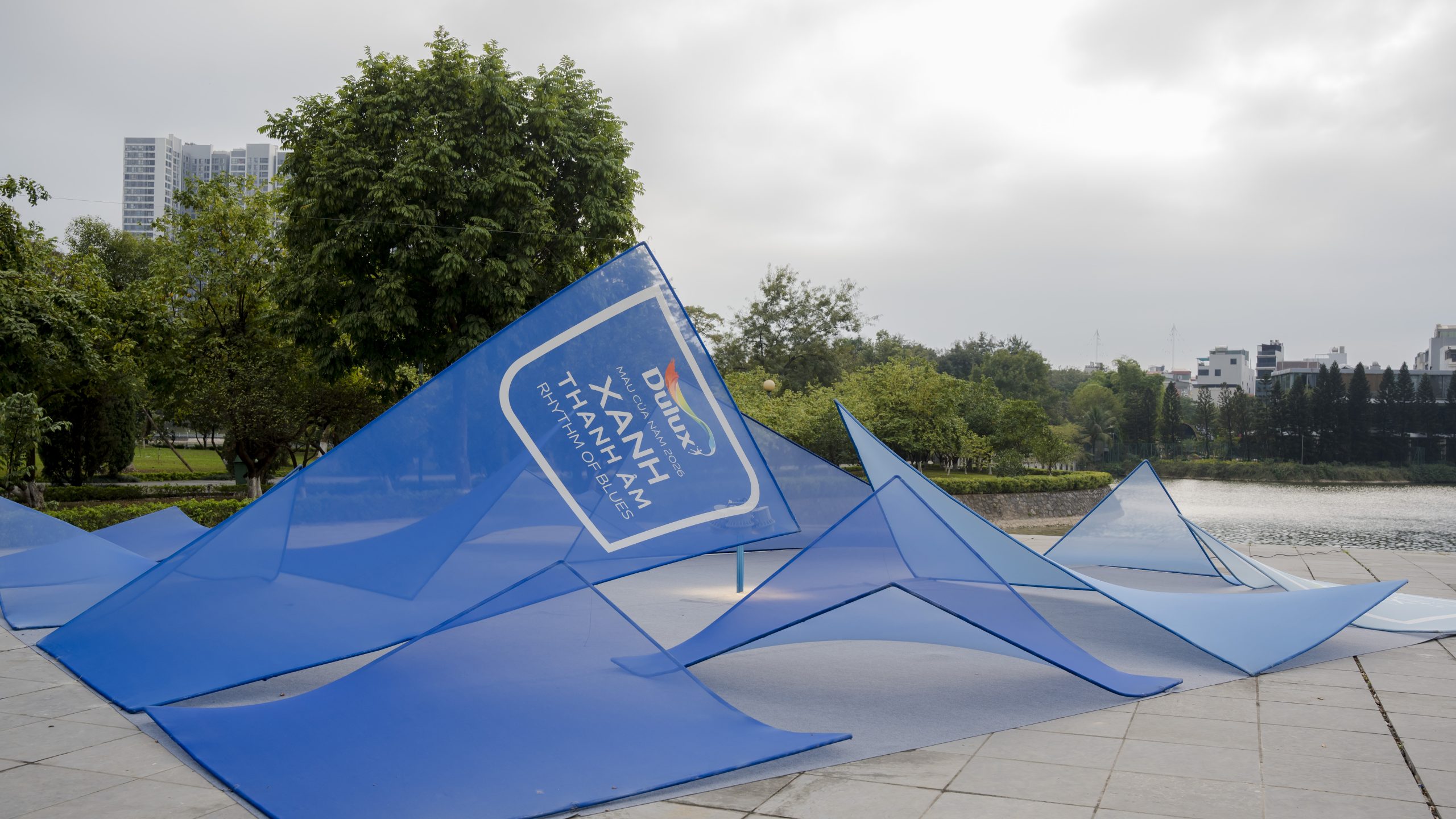 Rhythm of Blues evoked the feeling of a quiet wave, spacious, resonant, carrying rhythm, sound, imagery, tonal gradation, and gently touching the subconscious. There was a brief moment of poetic wandering when LAM received the brief from Ashui Awards 2025 to design the Dulux booth under the theme Color of the Year: Rhythm of blues. Perhaps it was precisely the emotional resonance of these particular shades of blue that led LAM to envision the project not as a conventional exhibition booth, but as an experiential spatial installation. The intention was to create a space capable of expressing layers, tonal variations, and subtle transitions, a space that could interact with and adapt to the atmosphere of Hanoi at the end of winter. The concept drew from the different shades of blue within the Dulux Colour Palette, organized into a spatial composition formed by multiple stretched-fabric panels with varying tones and geometries, responding to light and context.