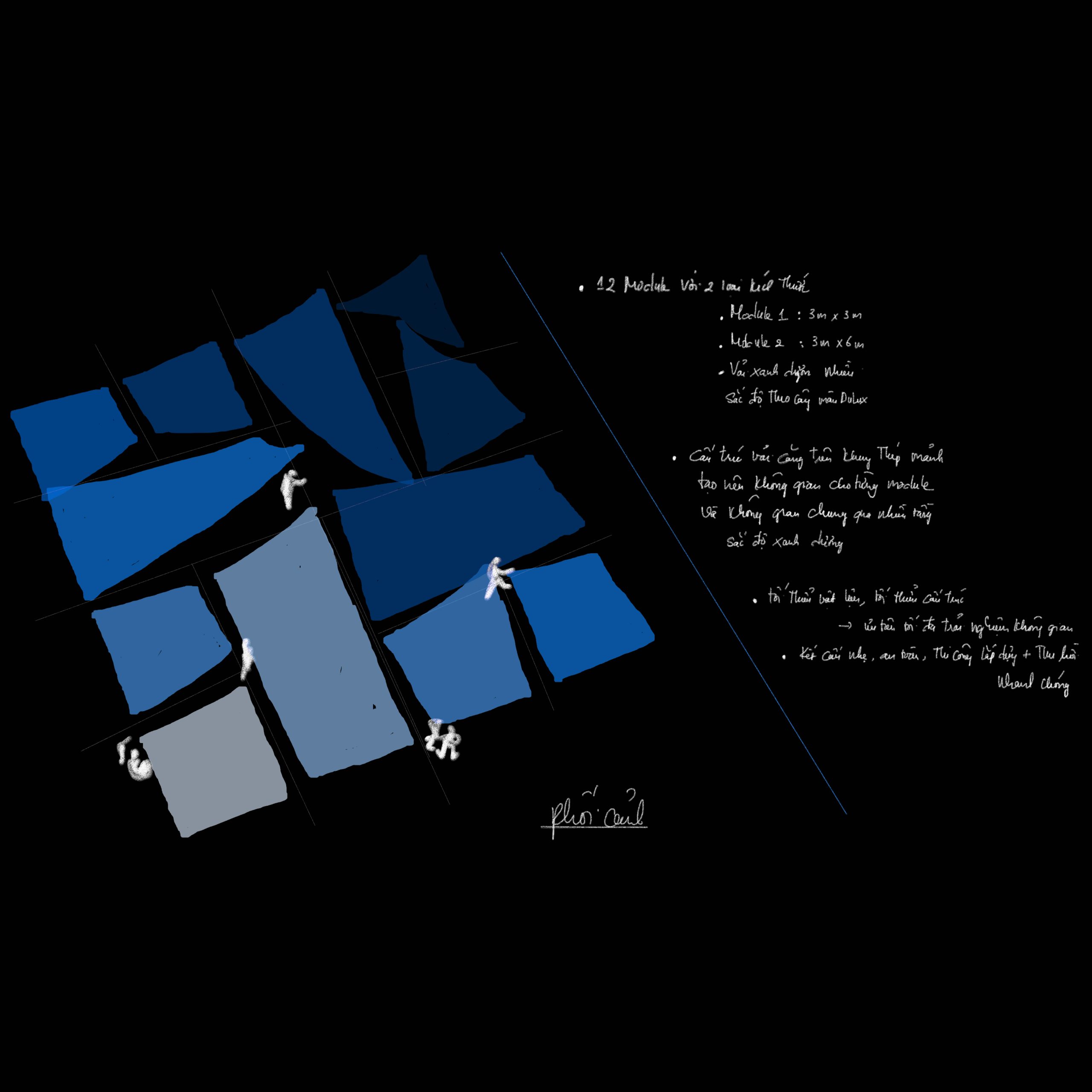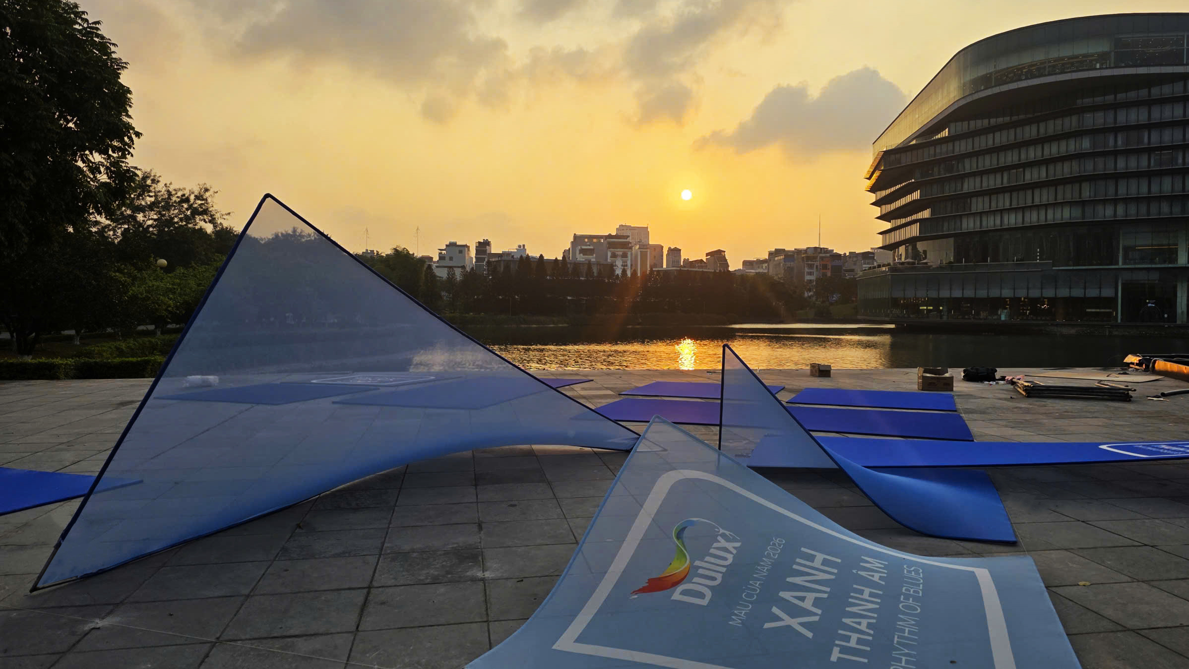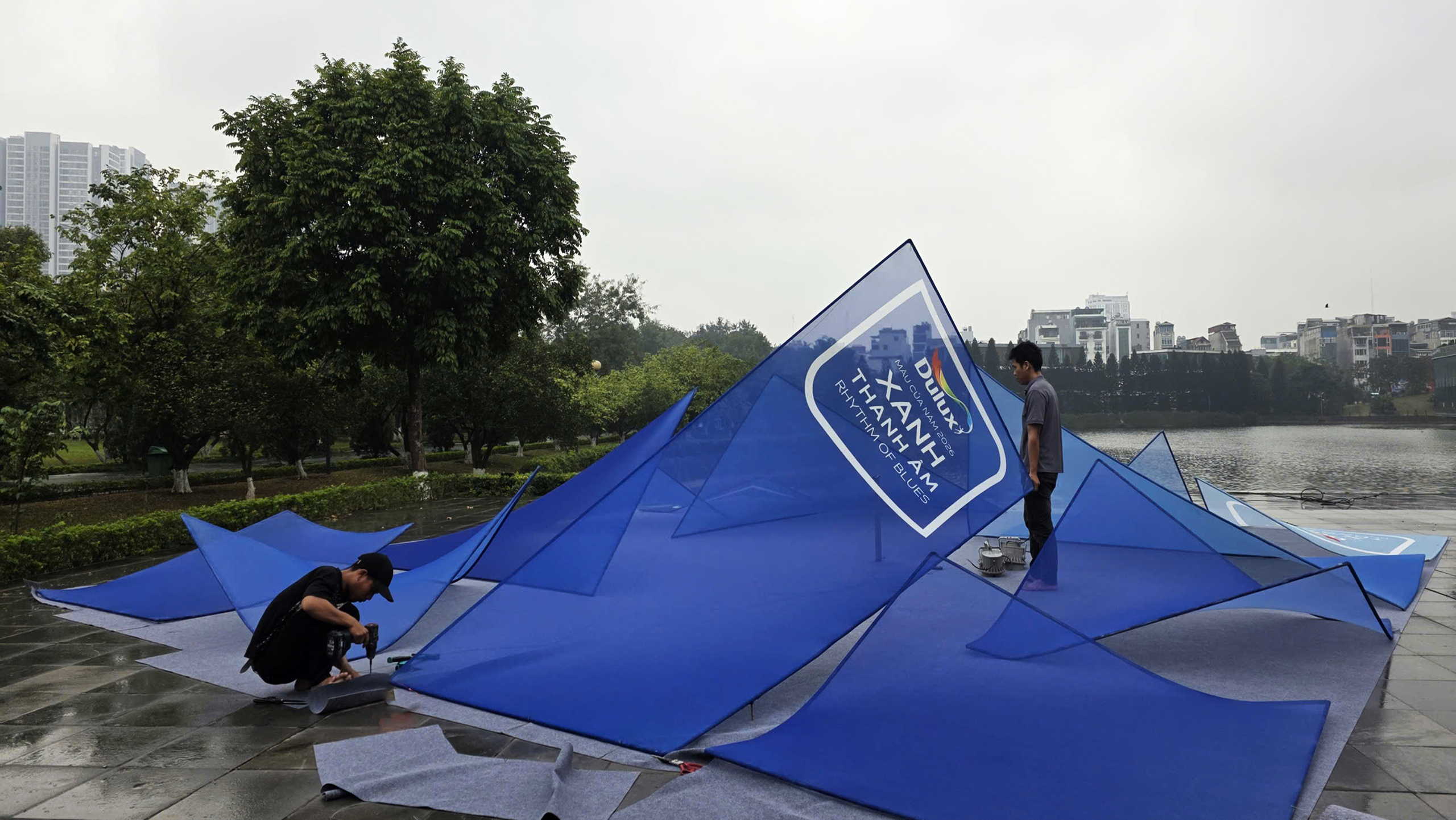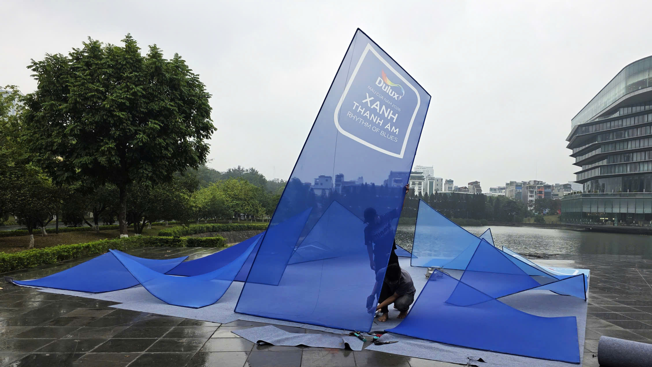 Rhythm of Blues evoked the feeling of a quiet wave, spacious, resonant, carrying rhythm, sound, imagery, tonal gradation, and gently touching the subconscious. There was a brief moment of poetic wandering when LAM received the brief from Ashui Awards 2025 to design the Dulux booth under the theme Color of the Year: Rhythm of blues. Perhaps it was precisely the emotional resonance of these particular shades of blue that led LAM to envision the project not as a conventional exhibition booth, but as an experiential spatial installation. The intention was to create a space capable of expressing layers, tonal variations, and subtle transitions, a space that could interact with and adapt to the atmosphere of Hanoi at the end of winter. The concept drew from the different shades of blue within the Dulux Colour Palette, organized into a spatial composition formed by multiple stretched-fabric panels with varying tones and geometries, responding to light and context.
