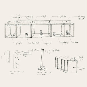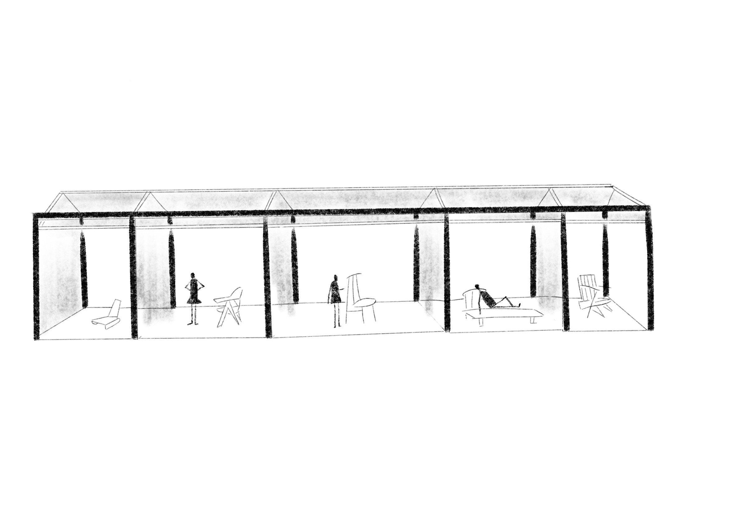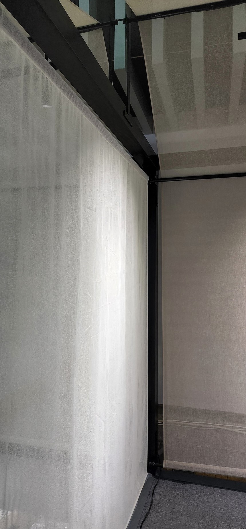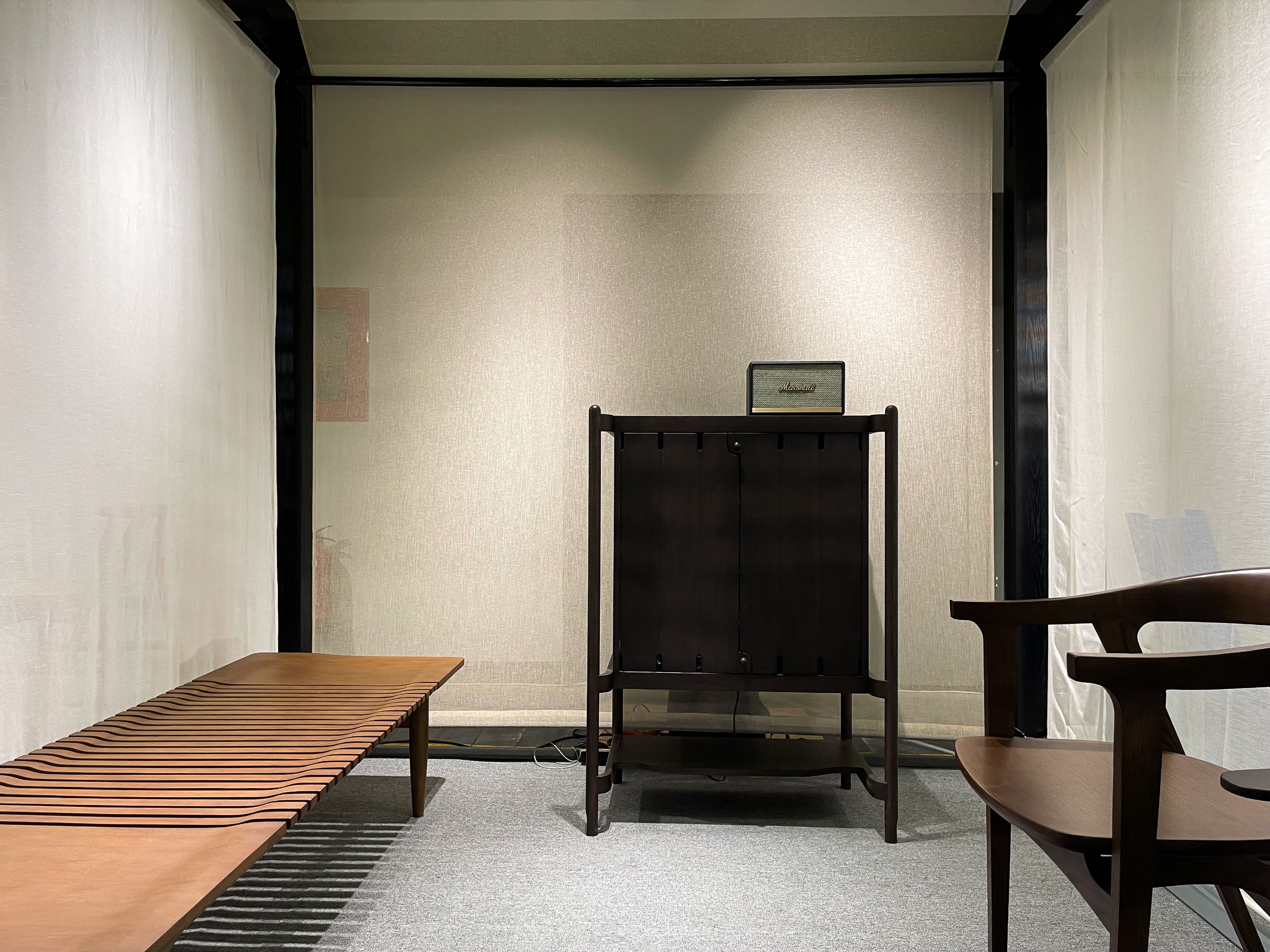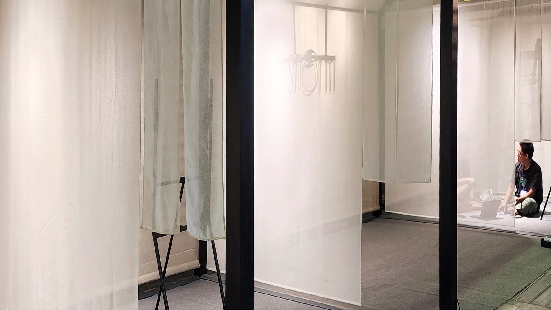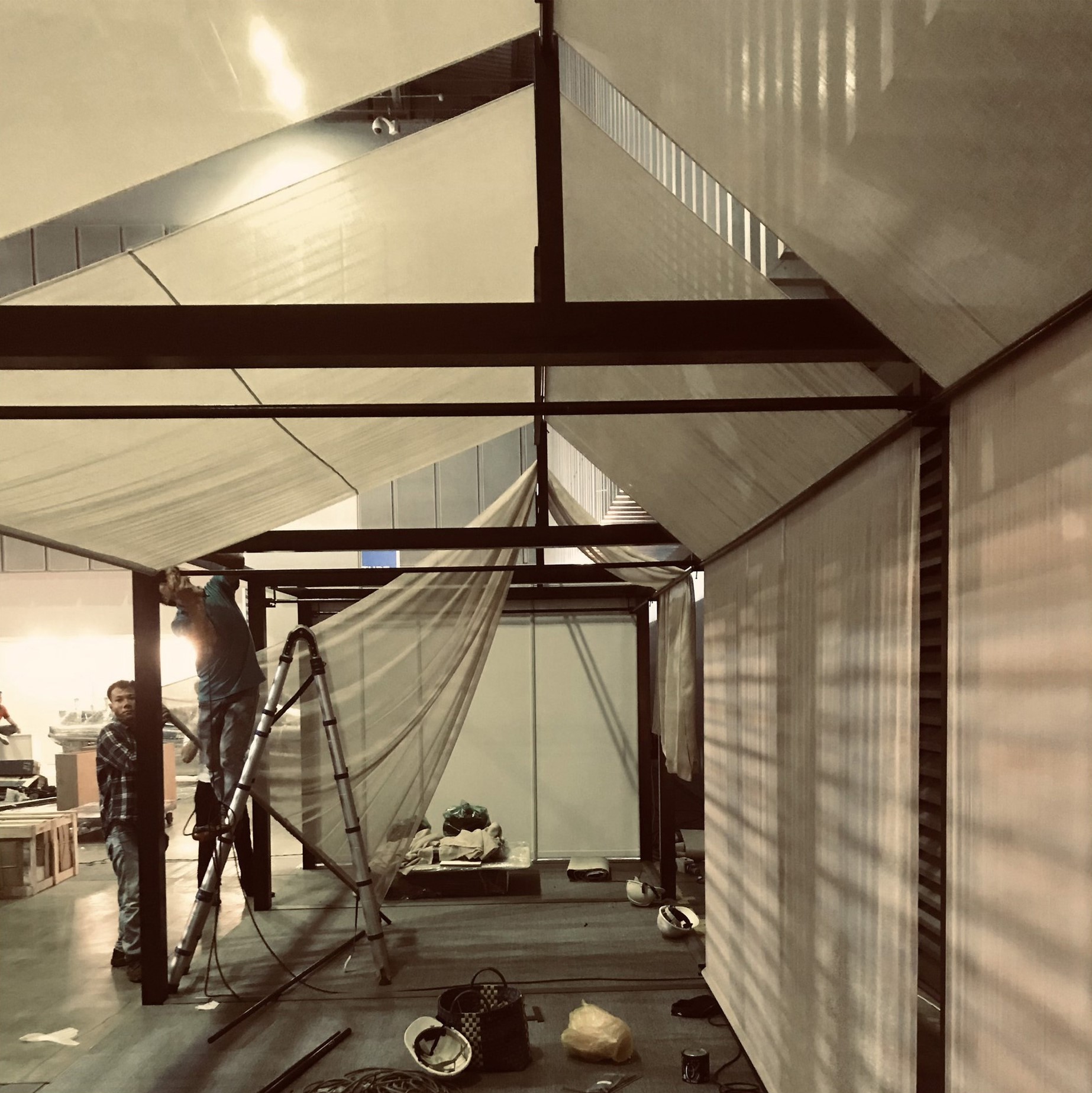 “S.norm based their design for their exhibition space at the Hawa Expo 2023 on the fundamental unit of Vietnamese architecture—the ‘Gian Nhà’ (traditional house section). The structure features a wooden frame as the main load-bearing element, with voile fabric stretched continuously from the edge of the sloped roof to the foot of the back wall. The overall design resembles a long, sloped-roof house with five adjoining sections, separated by voile fabric partitions and walls. S.norm carefully selected the fabric based on material, effect, color, level of translucency, and chose the appropriate supplier. LAM experimented with mockups, fabrication, assembly, and on-site adjustments to achieve the best details and effects. Though voile fabric was the common material, different techniques produced varying effects. Stretched fabric created flat surfaces like partition walls, and simple tensioning and support details formed the desired shapes. Freely draped fabric, on the other hand, created soft, flowing curtains that subtly divided the transition areas between functional spaces. Instead of serving as a typical display background, the entire area was crafted into a five-section house with layers and free-flowing light. Each piece of furniture was thoughtfully arranged by S.norm in each room, allowing them to stand out and ‘speak’ individually, while still belonging to a cohesive whole.”