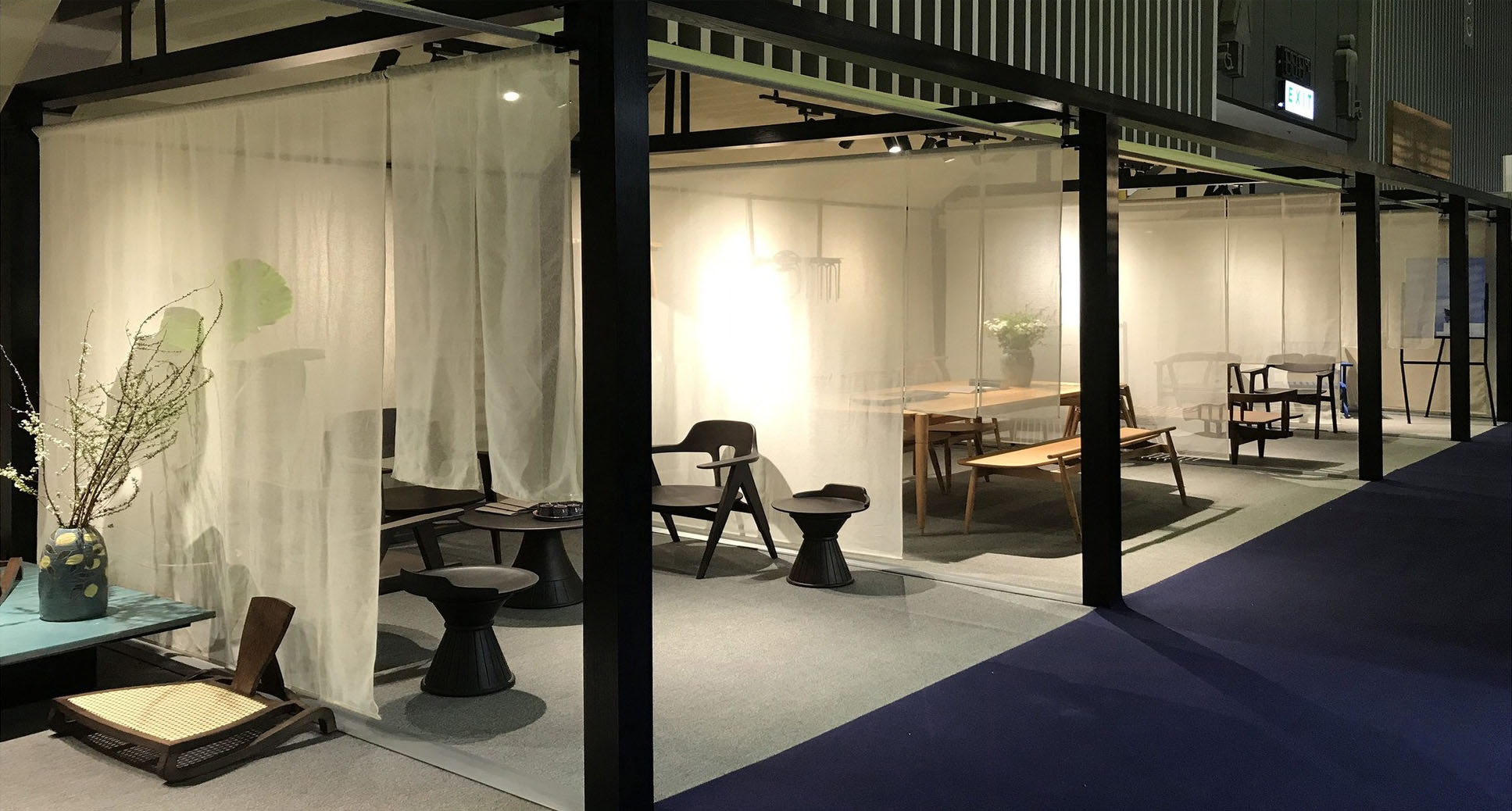 The exhibition space for the Furniture & Interior Export Fair – Hawa Expo 2023 features a curtain system in the “Nhà Năm Gian” booth, designed by the furniture brand S.norm. This curtain system is essential in creating an atmosphere that is both open and intimate. The thin, sheer curtains drape naturally and are used cleverly to partition different furniture display areas without imposing rigidity.