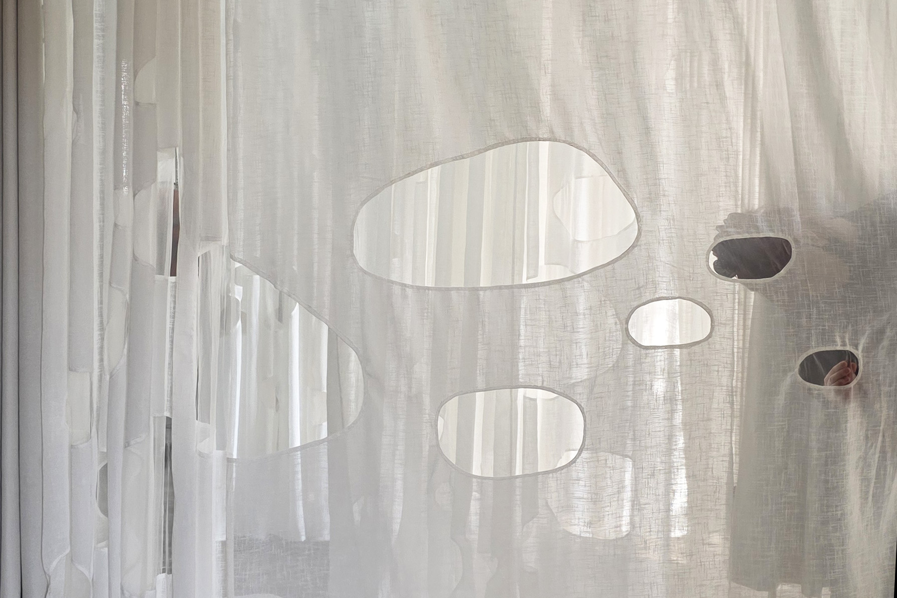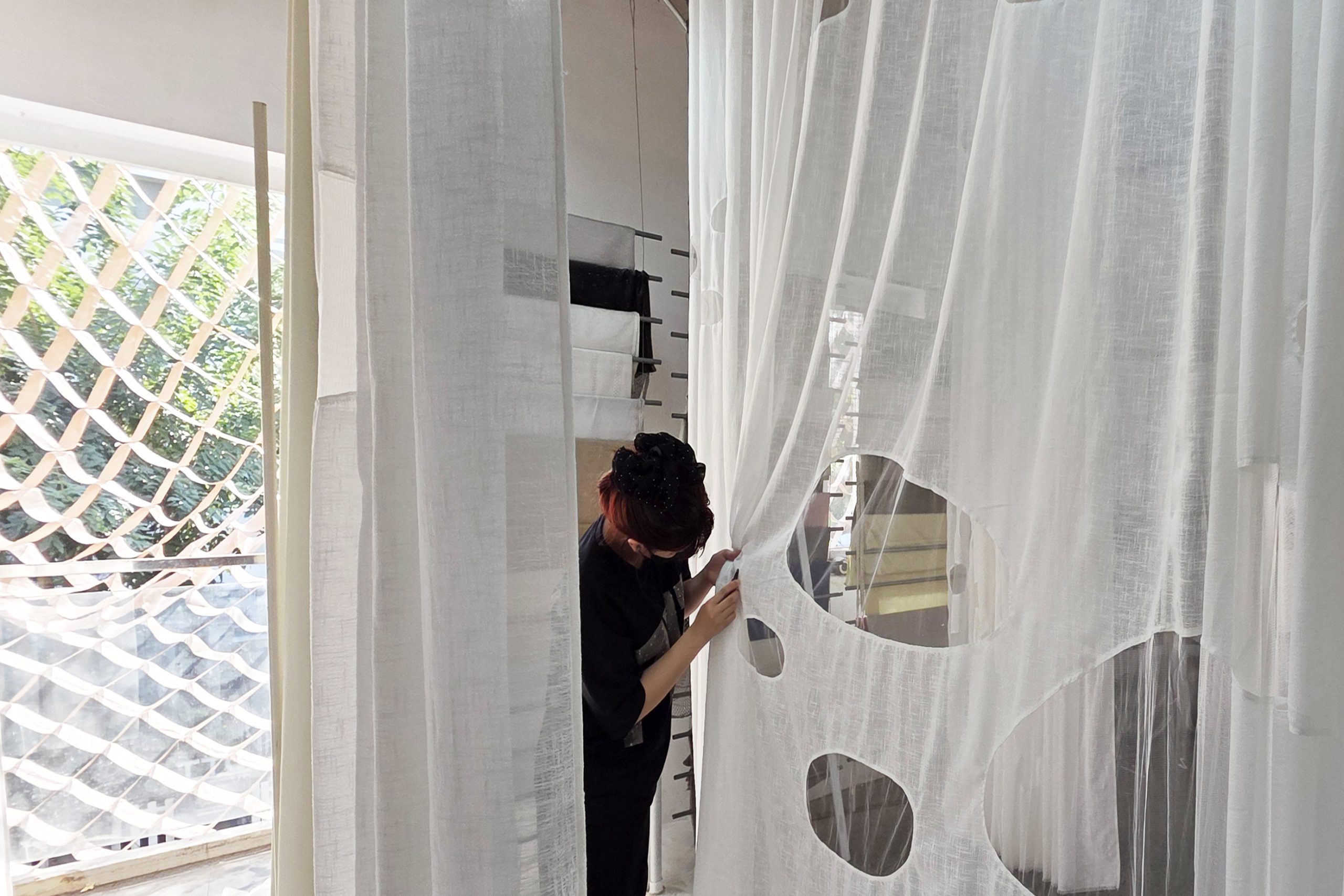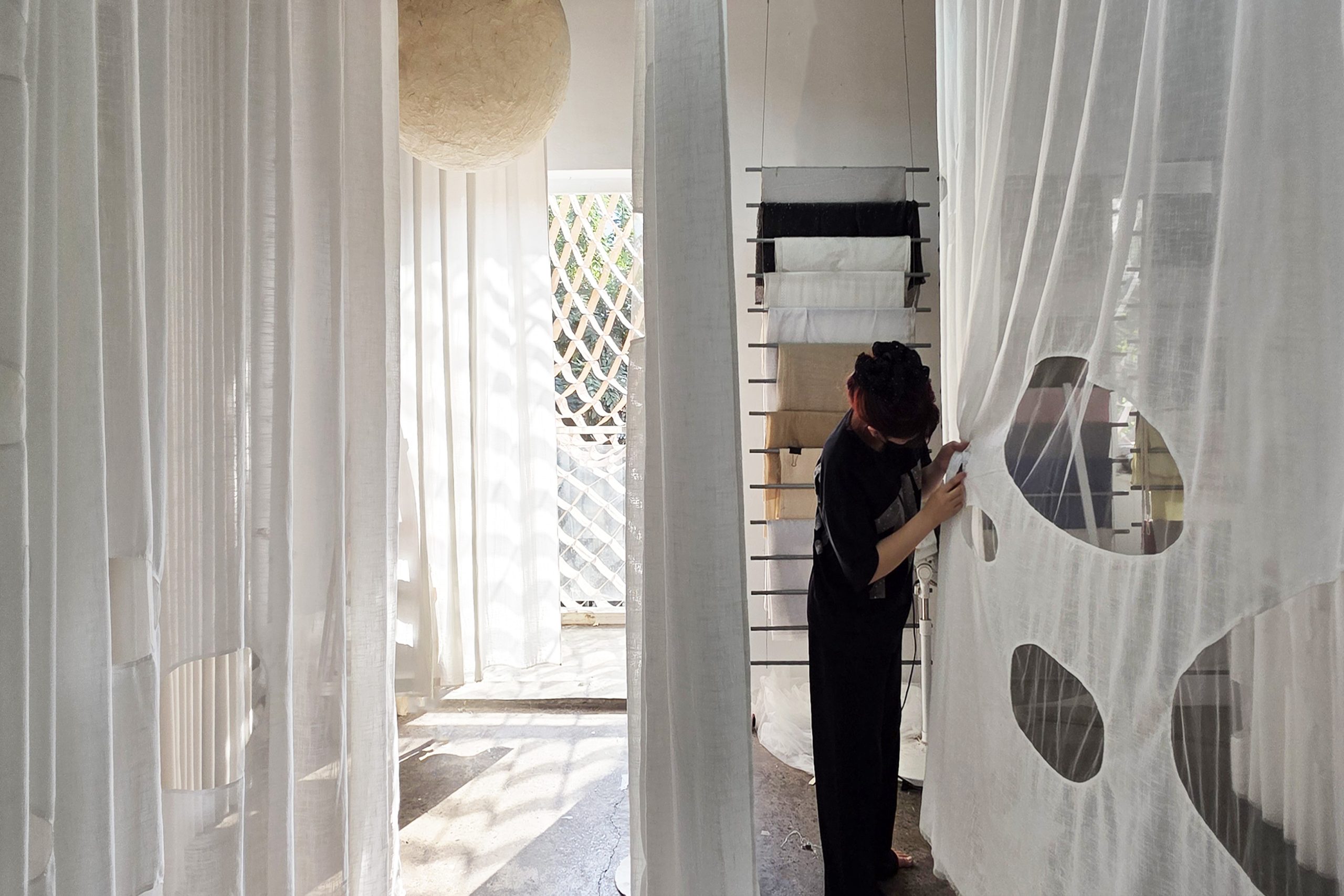 It was probably late winter shifting into early spring, so Saigon felt gently cool, the sunlight soft and slightly faded. That light filtered through the thin fabric, making the curtains hanging in the workshop seem somehow whiter than white. The sheer panels, with their subtle coarse texture, draped softly and were punctuated by organic cut-outs, like traces of light briefly held, then slipping away. Layers of space revealed themselves faintly through each veil, creating a feeling both weightless and fragile, as if everything were slowly dissolving in a soft sunny day.