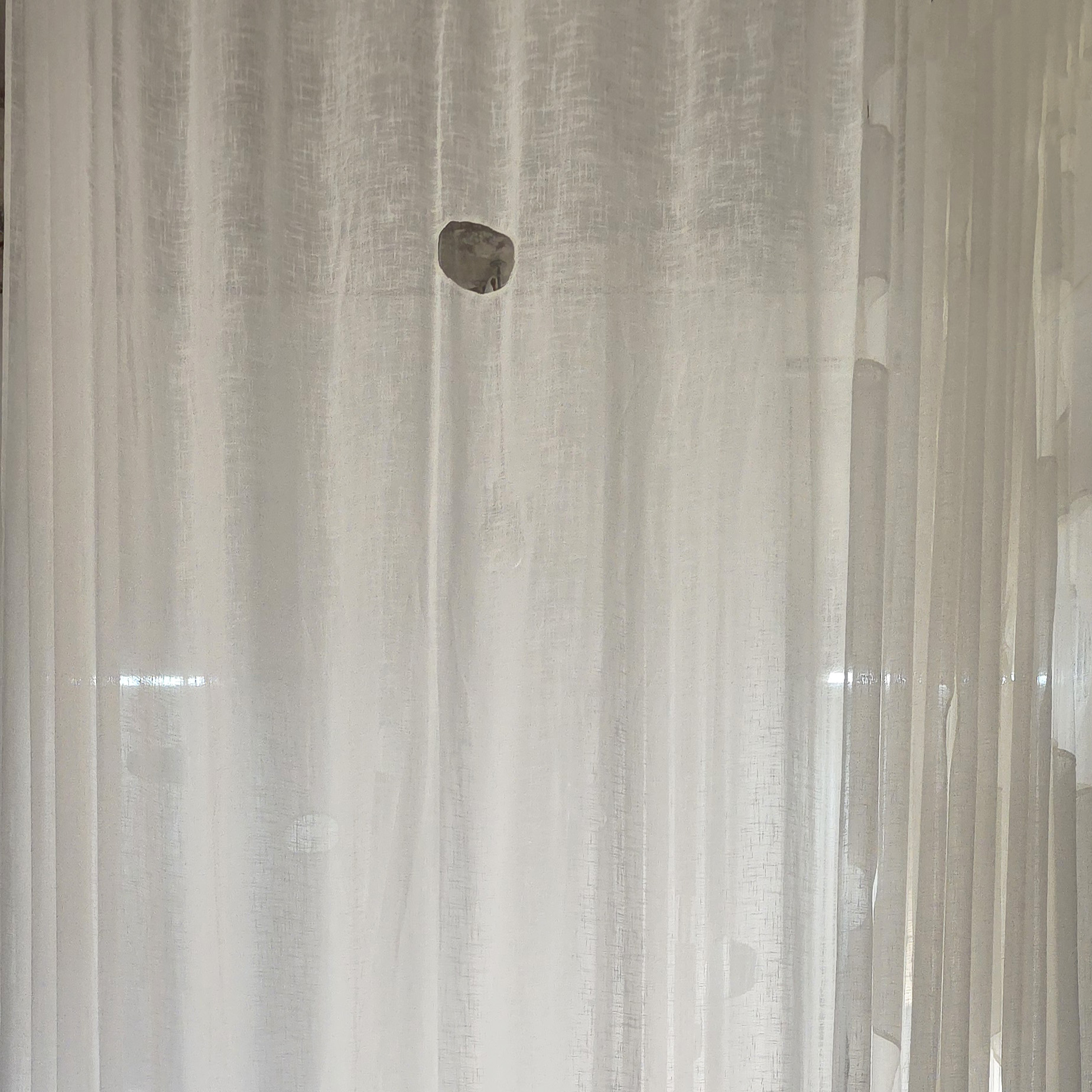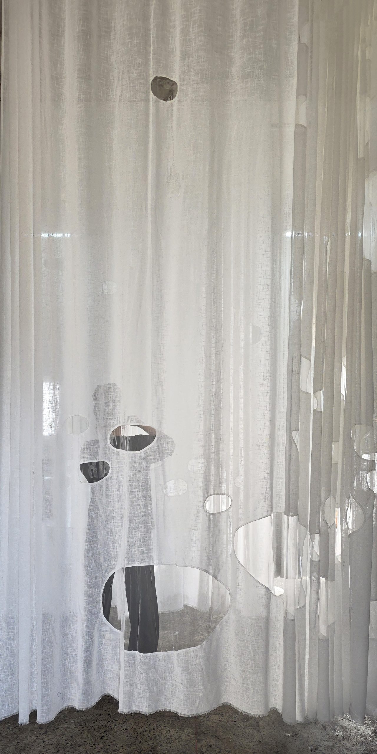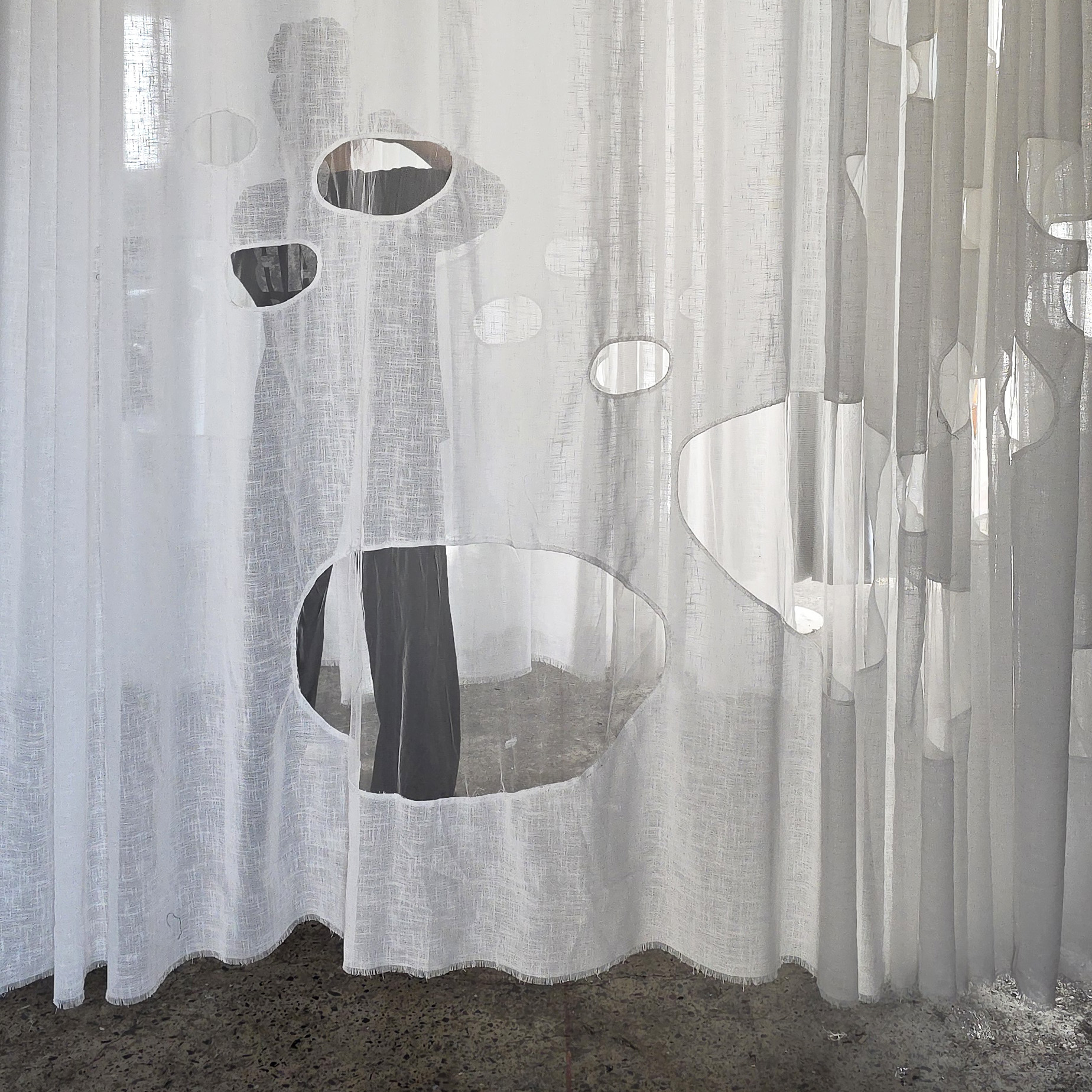 It was probably late winter shifting into early spring, so Saigon felt gently cool, the sunlight soft and slightly faded. That light filtered through the thin fabric, making the curtains hanging in the workshop seem somehow whiter than white. The sheer panels, with their subtle coarse texture, draped softly and were punctuated by organic cut-outs, like traces of light briefly held, then slipping away. Layers of space revealed themselves faintly through each veil, creating a feeling both weightless and fragile, as if everything were slowly dissolving in a soft sunny day.